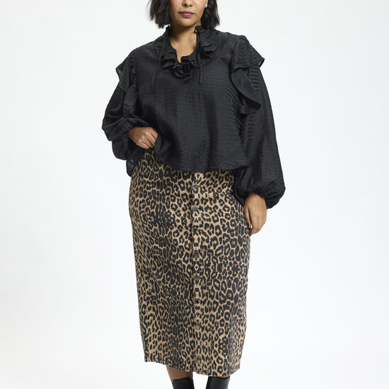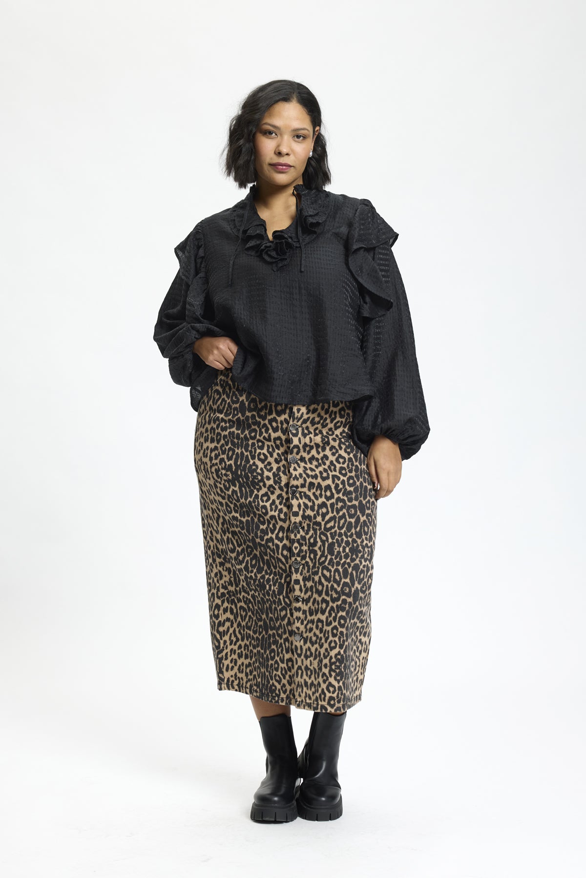 Tilgængelig i størrelserne 42/44, 46/48, 50/52, 54/56, denne bluse er designet til at passe perfekt til enhver kropsform. Den sorte farve gør den nem at kombinere med forskellige nederdele eller bukser, hvilket gør den til en alsidig tilføjelse til din garderobe.