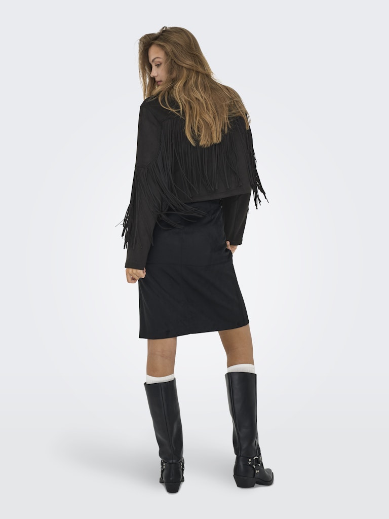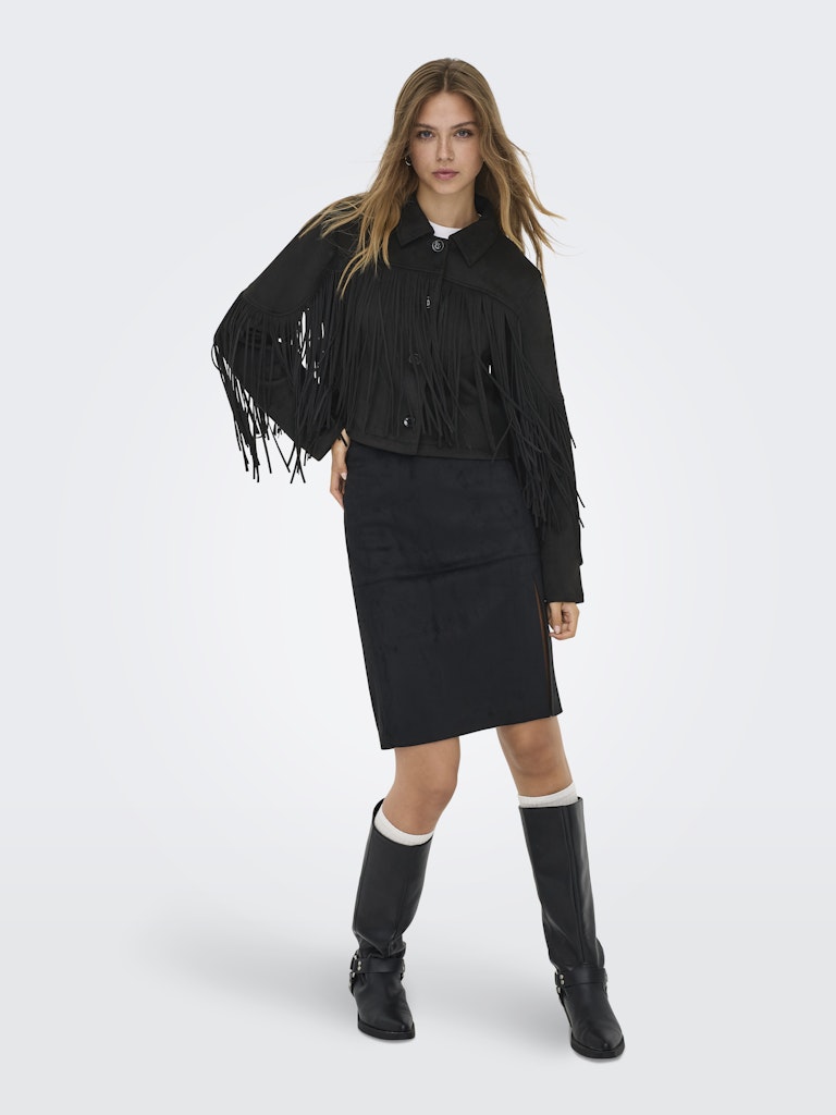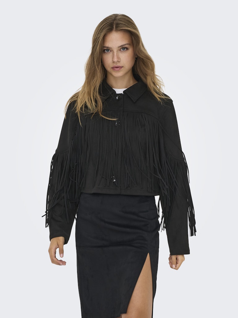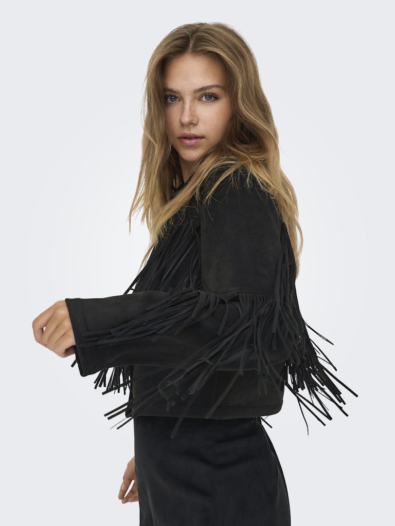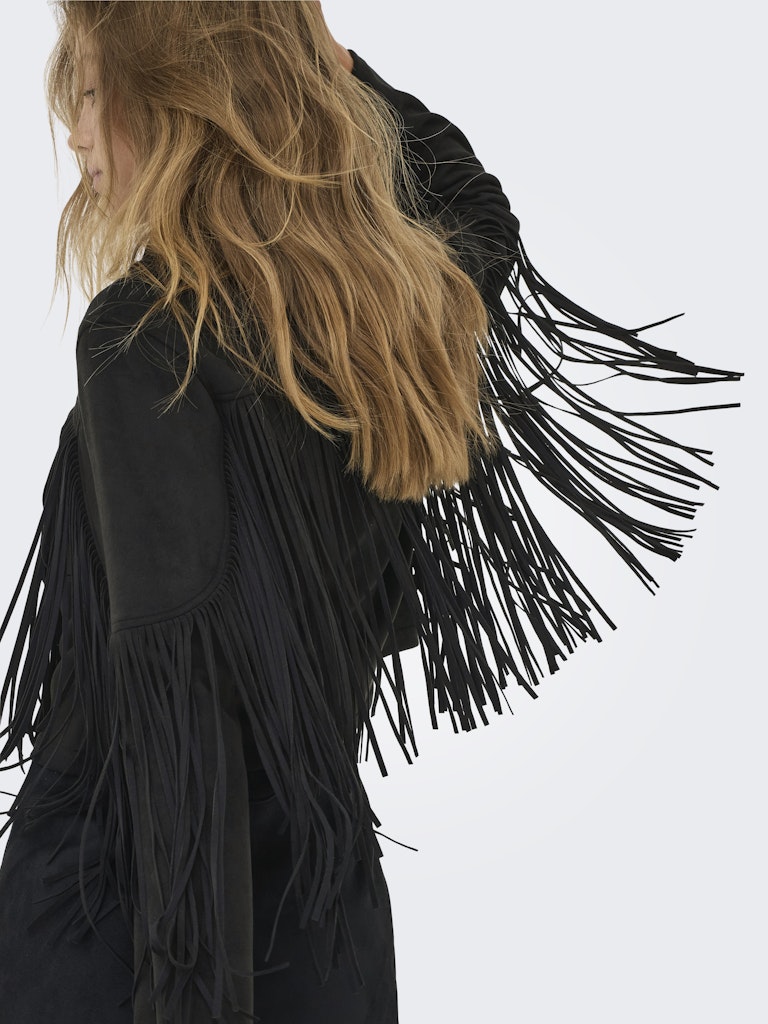 Denne smarte model fra Only Carmakoma er det perfekte valg til kvinder med kurver, der ønsker et outfit med karakter og kant. Jakken er udført i et blødt faux suede materiale med en mat overflade, og den sorte farve giver et klassisk udgangspunkt for de iøjnefaldende detaljer. Lange frynser pryder både bryst og ærmer, hvilket skaber et dynamisk og moderne western-inspireret look, mens den klassiske krave og knaplukning holder stilen elegant.
