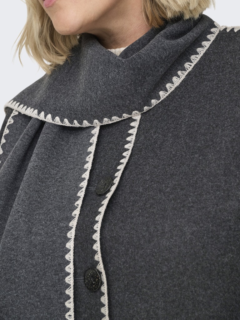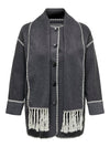jakkens markante, sorte knapper og dekorative hvide zigzag-syninger langs kanterne og ærmerne tilføjer et trendy element til det tidløse design. Frynserne på den brede krave skaber et boheme-inspireret look og giver mulighed for styling på forskellige måder.