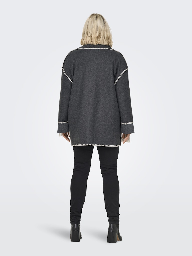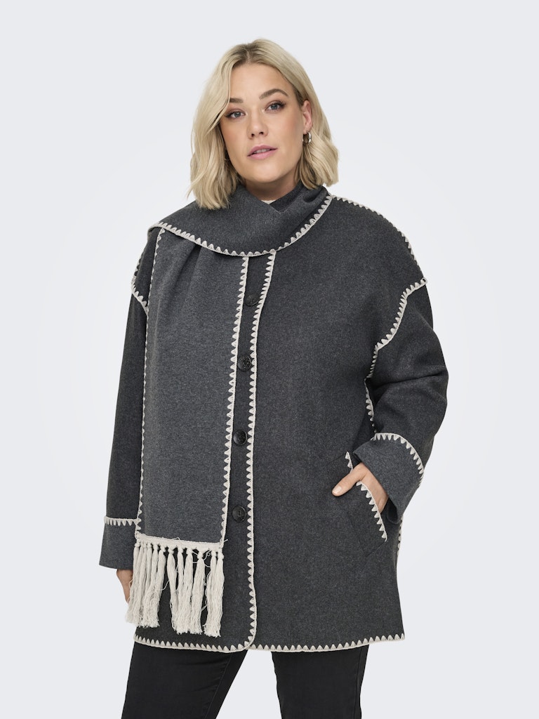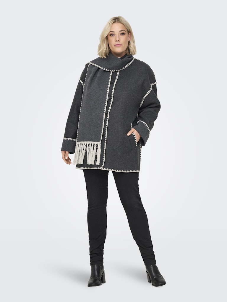 Oplev denne elegante jakke fra ONLY CARMAKOMA, der kombinerer klassisk design med moderne detaljer. Blusen er lavet i en smuk mørkegrå melange farve og er ideel til både hverdag og mere formelle anledninger. Den er designet med en afslappet pasform og lange ærmer, der sikrer optimal komfort og bevægelsesfrihed. En unik detalje ved denne jakke er det integrerede tørklæde, som sidder fast i nakken og giver et sofistikeret touch.
