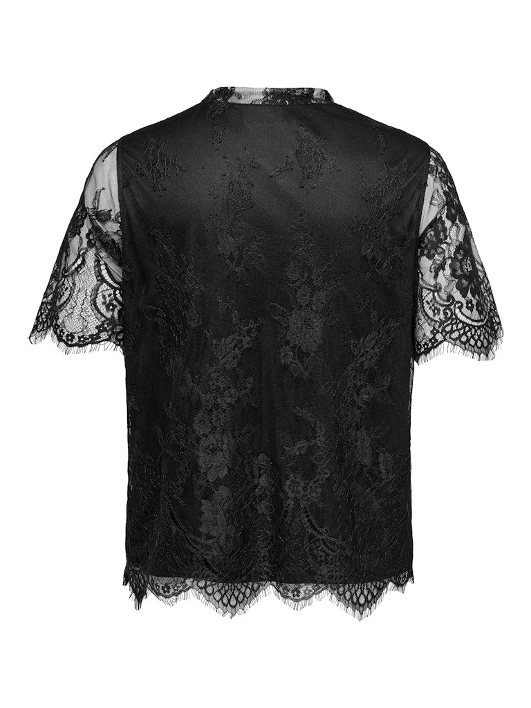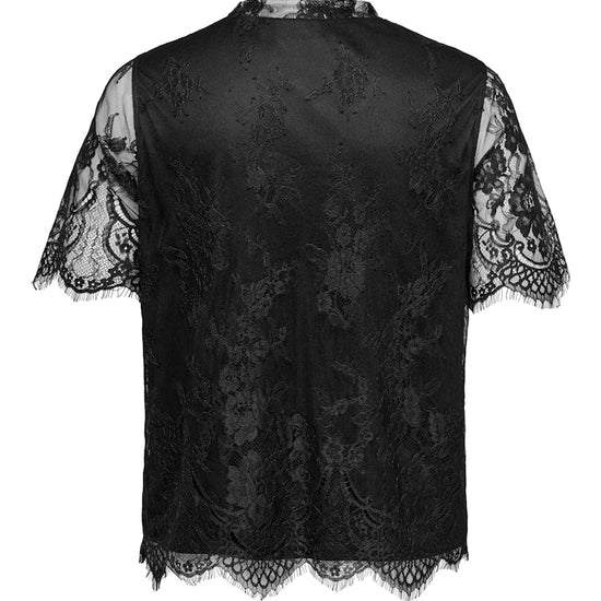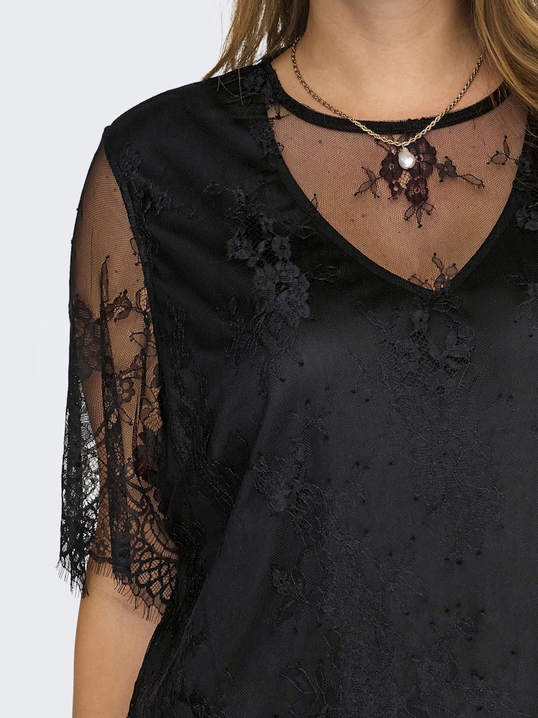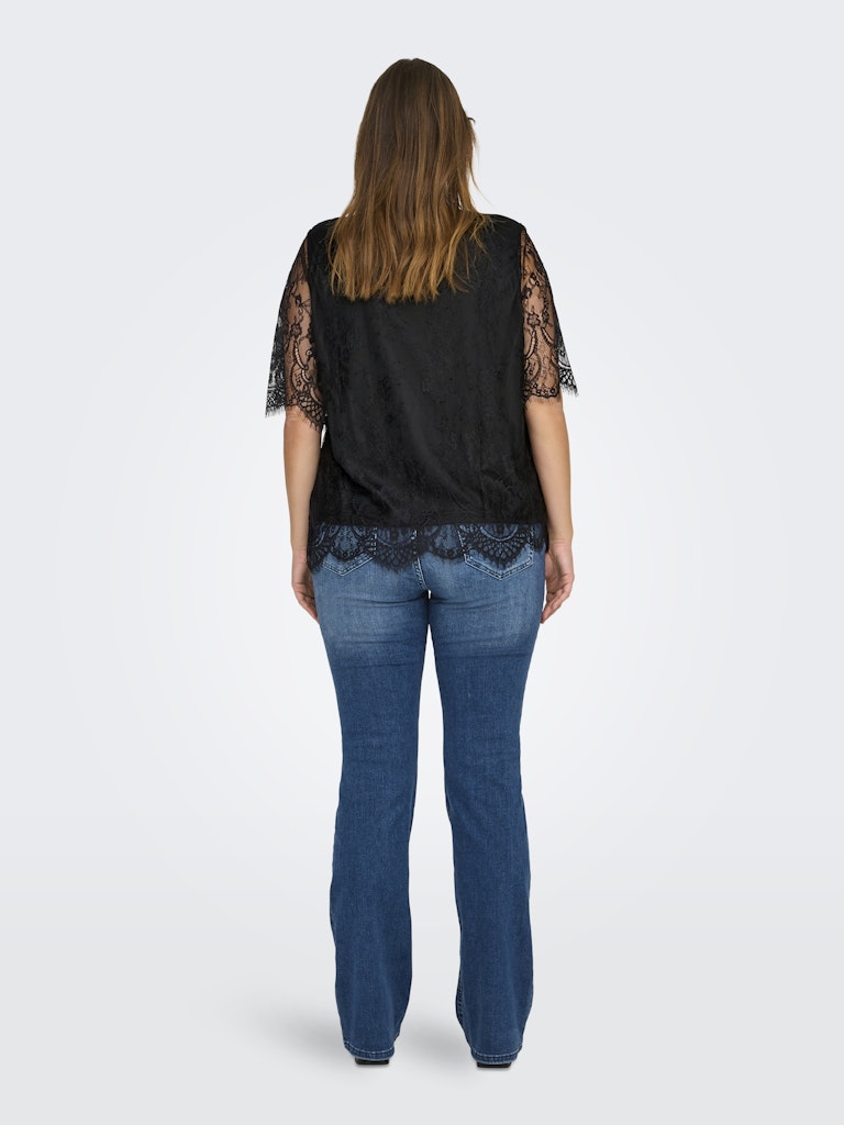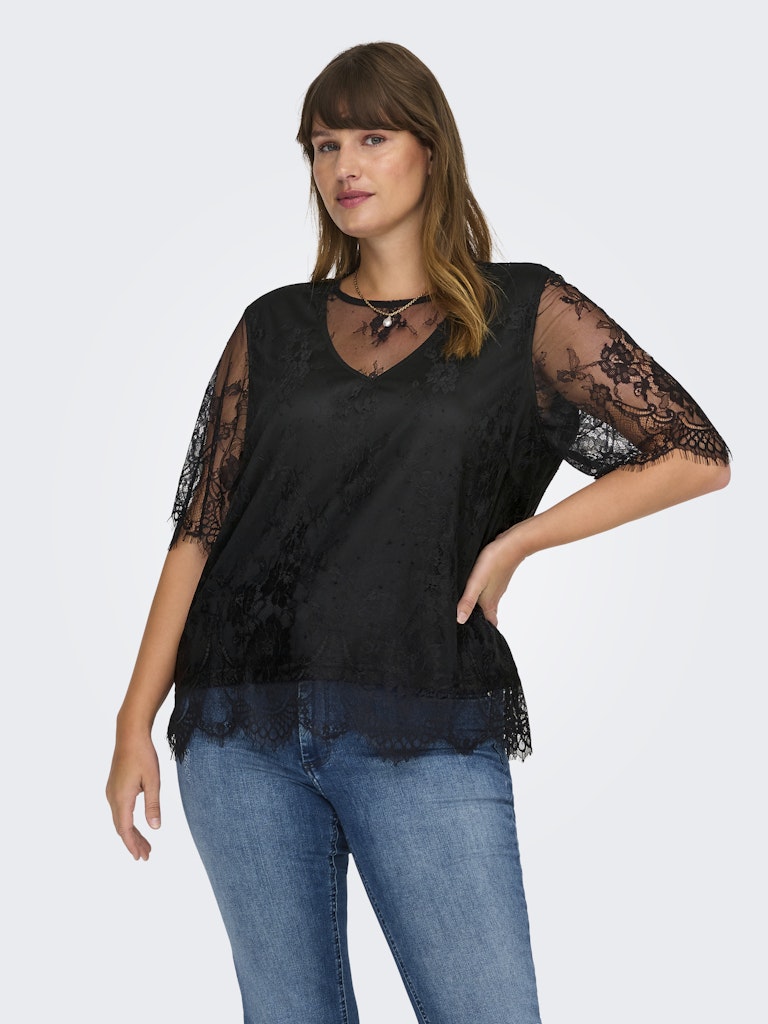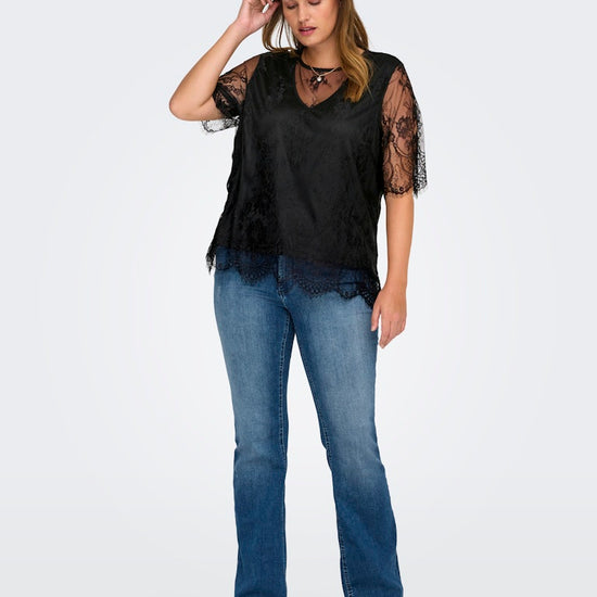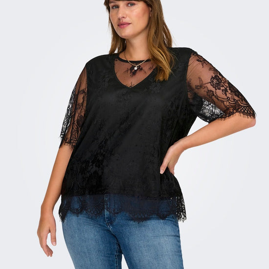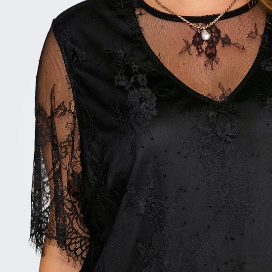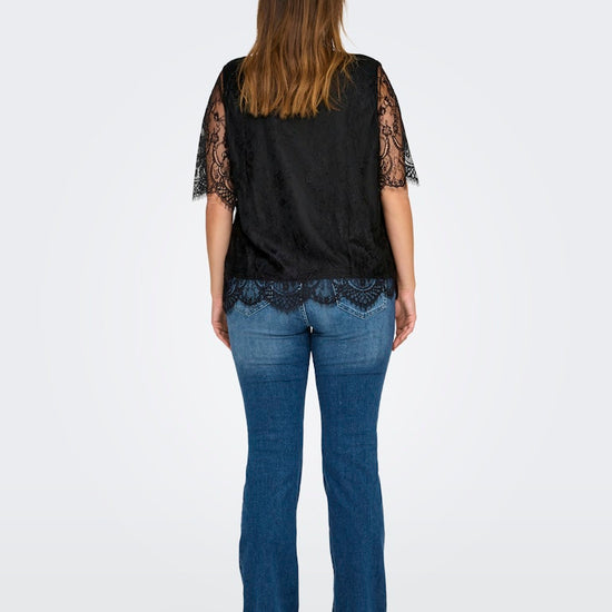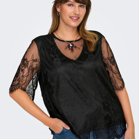 Giv dit outfit et eksklusivt løft med denne sorte blondebluse fra ONLY CARMAKOMA. Blusen har en regular fit pasform, 2/4 ærmer og en høj hals, som sammen med de flotte blondedetaljer skaber et stilfuldt og feminint udtryk. Den lette, transparente blonde gør blusen perfekt til både hverdag og fest.
