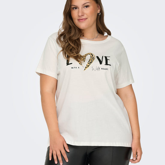 T-shirten er tilgængelig i to smukke farver, "Cloud Dancer Love" og "Black Heart", der begge tilføjer et unikt udtryk til dit look. Den er perfekt til at matche med din eksisterende garderobe og kan nemt styles til både casual og mere polerede anledninger. Kombiner den med et par plus size jeans eller en plus size nederdel for et fuldendt look.