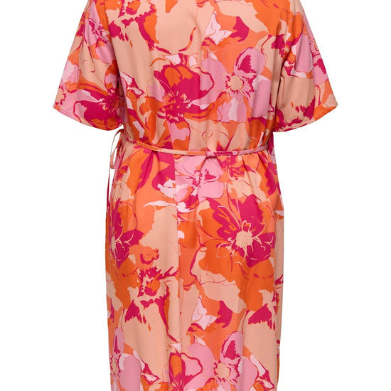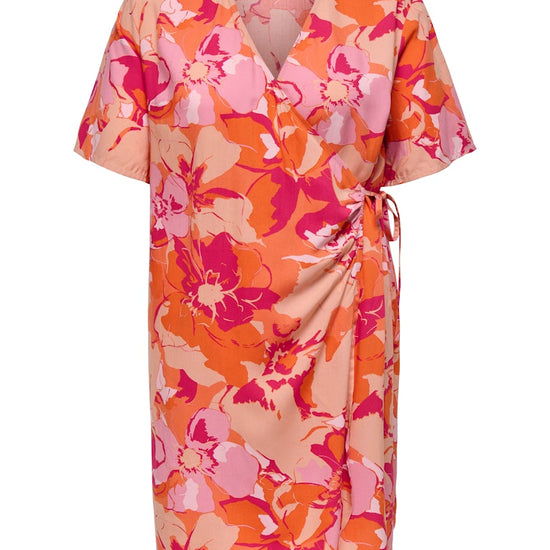 Opgrader din garderobe med denne skønne slå-om kjole fra ONLY CARMAKOMA, der er designet til at fremhæve dine smukke former. Kjolen er lavet af blød og let viskose, som falder flot og føles behagelig mod huden. Det farverige blomsterprint i pink, orange og rød giver et frisk og feminint udtryk, mens den justerbare talje med bindebælte sikrer en perfekt pasform til alle kropstyper.