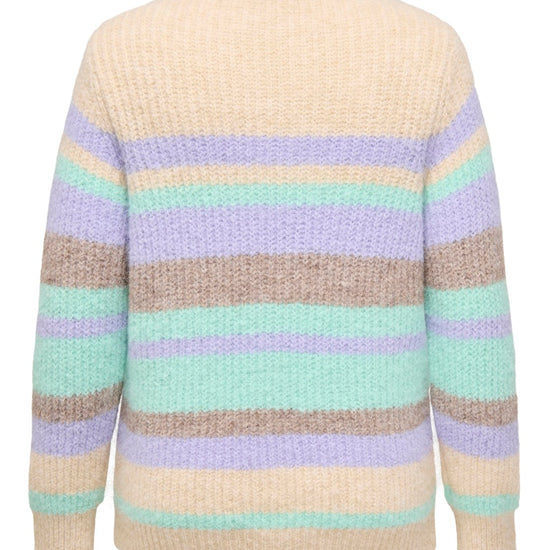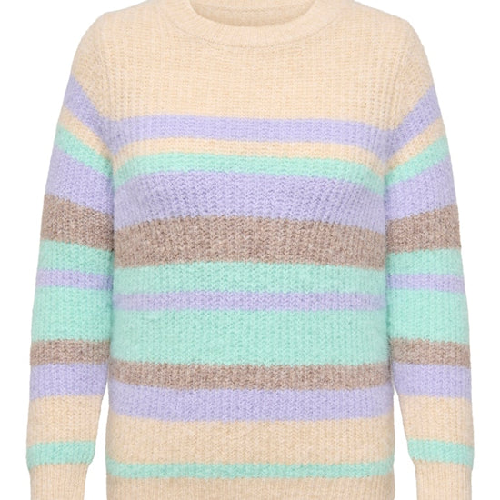 Gør dig klar til sæsonens hyggeligste stil med denne strikkede pullover fra ONLY CARMAKOMA. Pulloveren er designet med et regular fit, rund hals og lange ærmer med ribkanter, hvilket giver både komfort og et moderne udtryk. De brede, pastelfarvede striber i birch, picante, aqua sky og pastel lilac tilfører et friskt og feminint look, der passer perfekt til enhver anledning.
