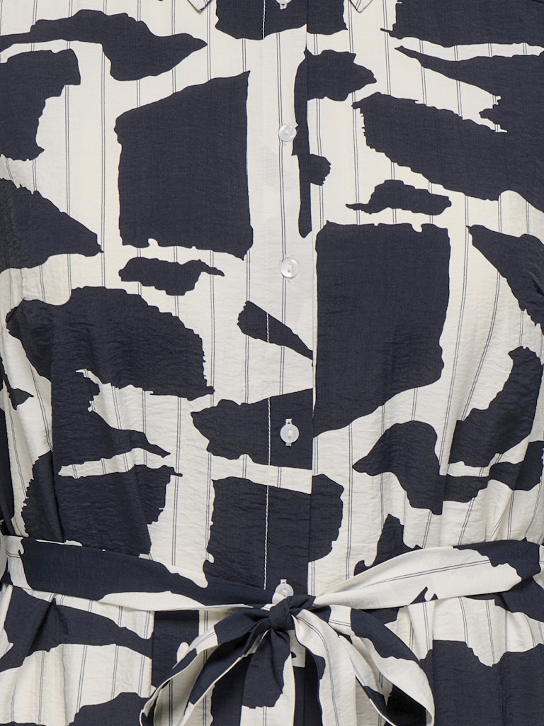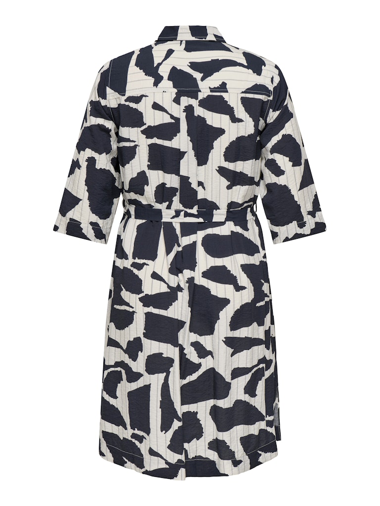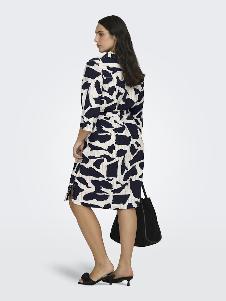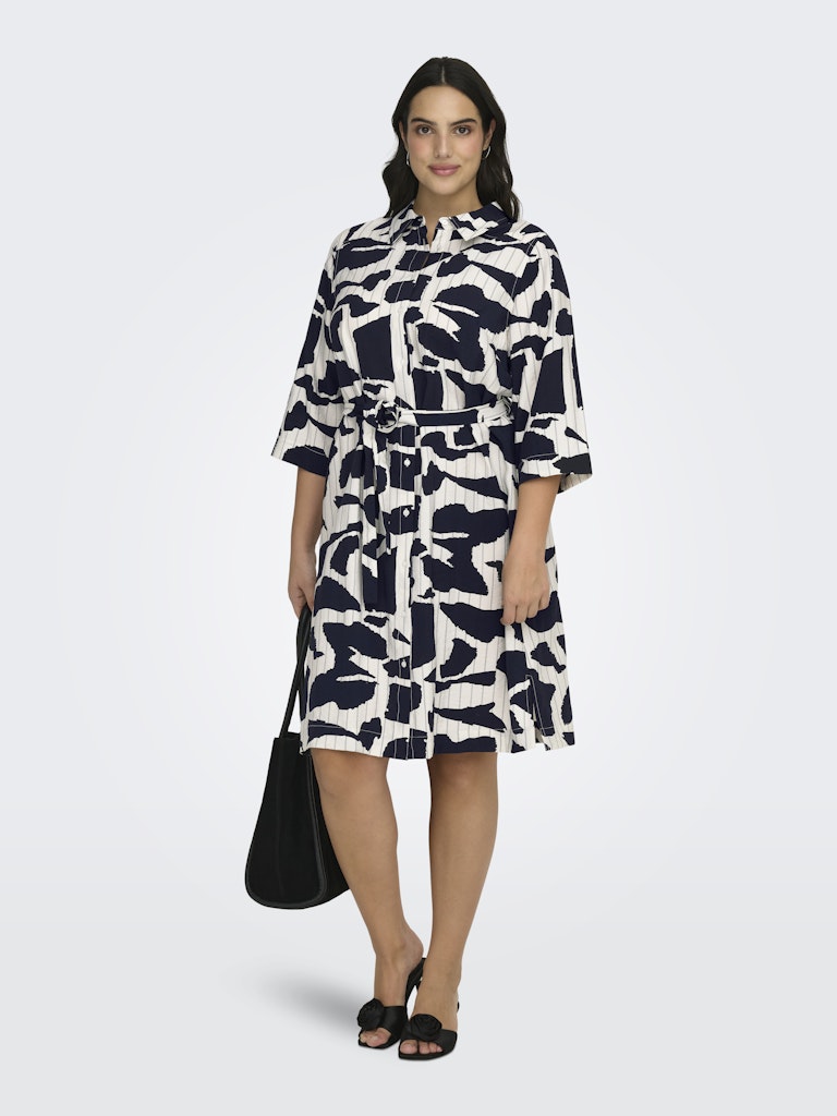 Denne elegante kjole fra Only Carmakoma kjoler er designet med et flot grafisk print, der giver et stilrent og iøjnefaldende look. Modellen fremstår som en klassisk skjortekjole med krave og gennemgående knaplukning, hvilket tilføjer et tidløst element til det moderne design.