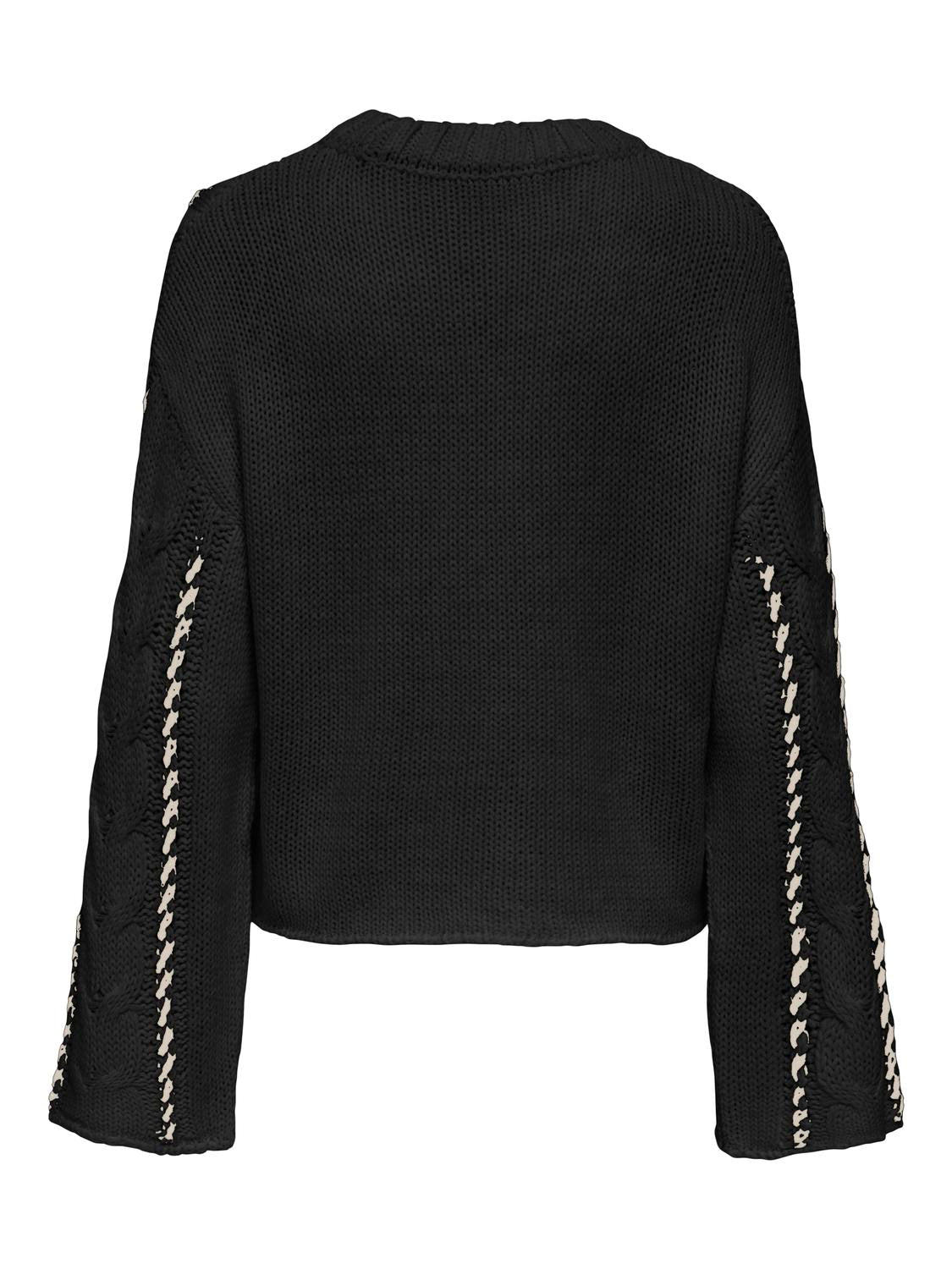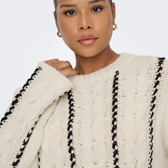 - Detaljer: Kabelstrik med kontraststriber og trompetærmer