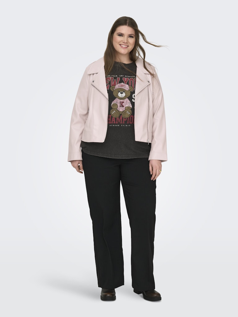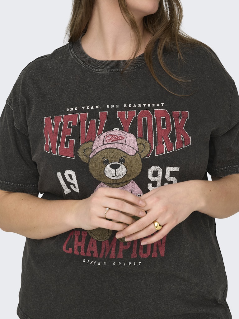 Denne smarte t-shirt fra Only Carmakoma tilføjer et humoristisk og moderne touch til din garderobe med sit charmerende print på fronten. Modellen har et motiv af en bamse iført kasket og tøj, samt teksten henover, hvilket giver et afslappet og ungdommeligt udtryk. Den er lavet i en ren bomuldskvalitet, der er blød og åndbar, hvilket sikrer en høj komfort dagen lang.