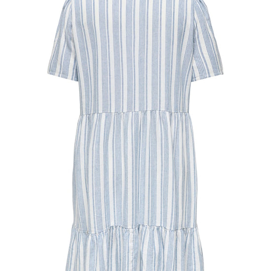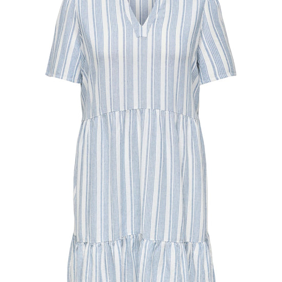 Kjolen fås i de elegante farver Violet Ice, Coronet Blue og Bright White, der tilføjer et sofistikeret touch til din garderobe. Med korte ærmer og en V-udskæring, er denne kjole både feminin og moderne. Den lette A-formede skæring og de rynkede detaljer ved sømmen giver et stilfuldt og flydende look, perfekt til både hverdag og festlige lejligheder.