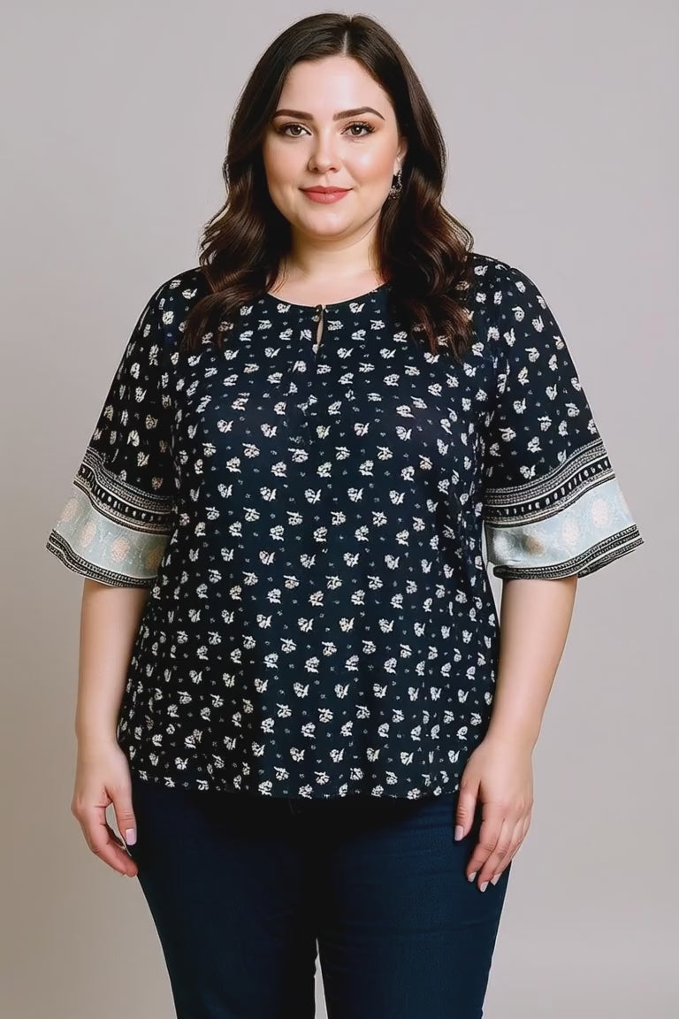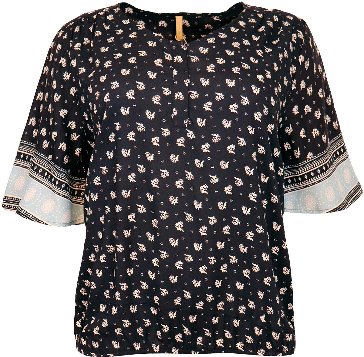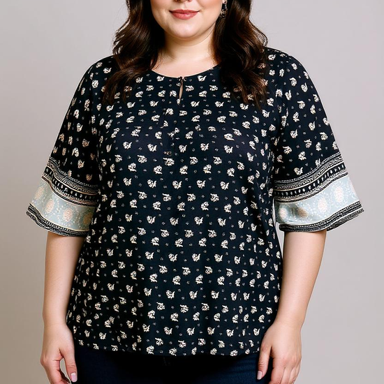 - Trekvartlange ærmer med brede manchetter i kontrasterende mønster