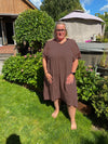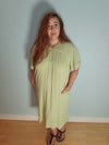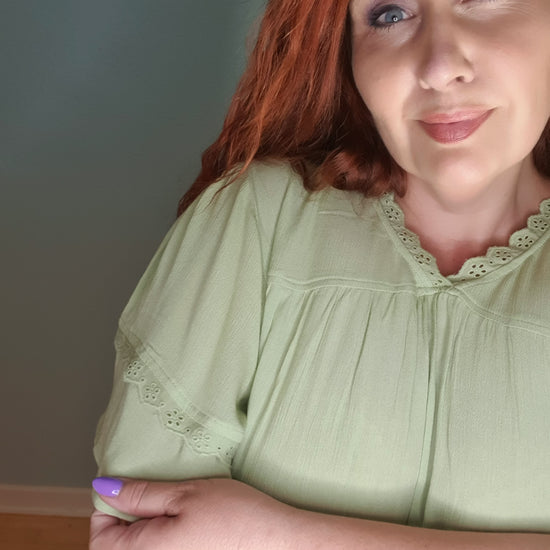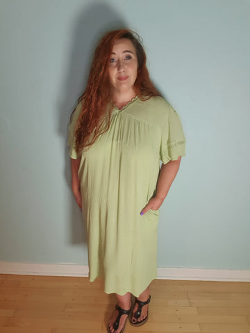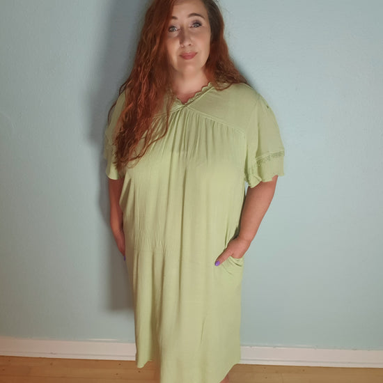Kjole med V-hals, broderikant i hals og på ærmer, løs pasform i let crepeviskose