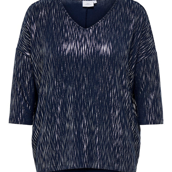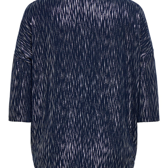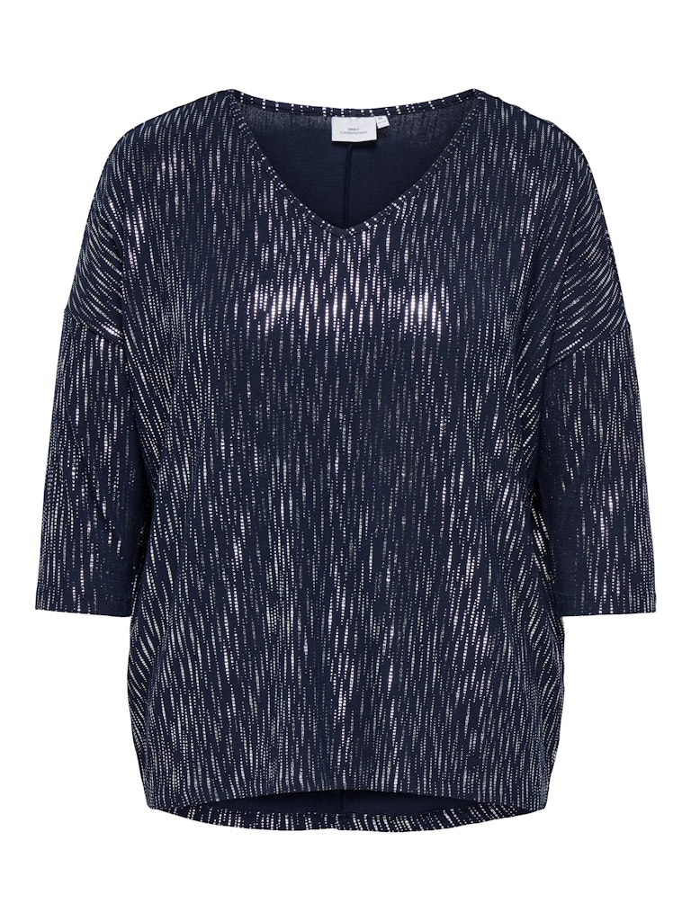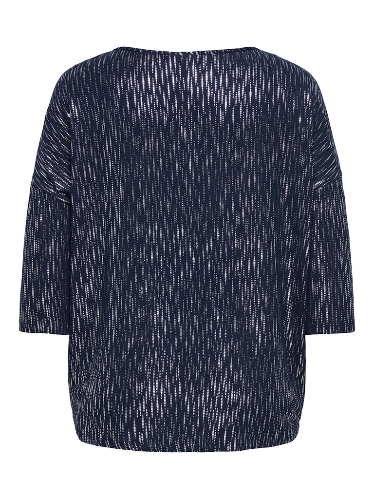 Denne top fra ONLY CARMAKOMA kombinerer et elegant og feminint udtryk med en afslappet komfort. Den har rund hals, 3/4 ærmer, som giver en behagelig pasform. Farven Naval Academy fremstår i en mørk blå nuance med fine sølvfolie-detaljer, som giver et diskret, stilfuldt touch.