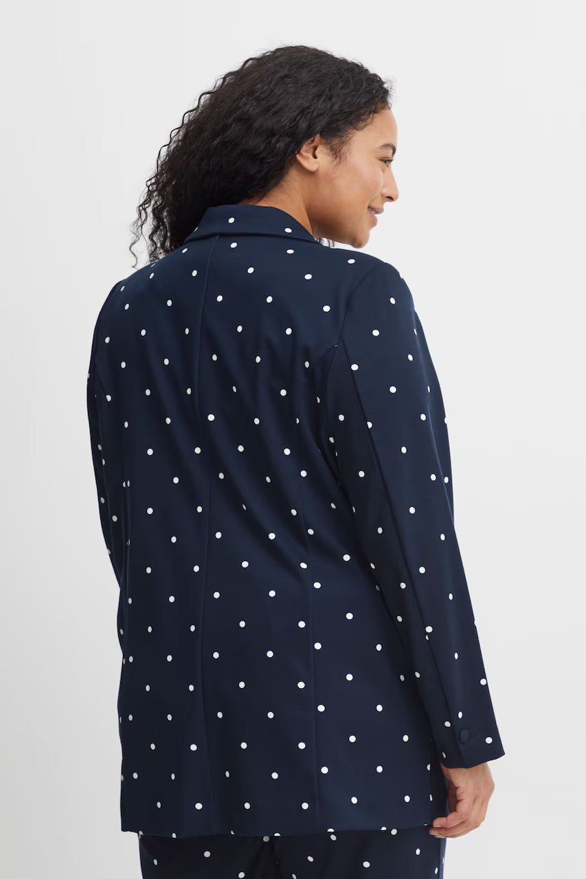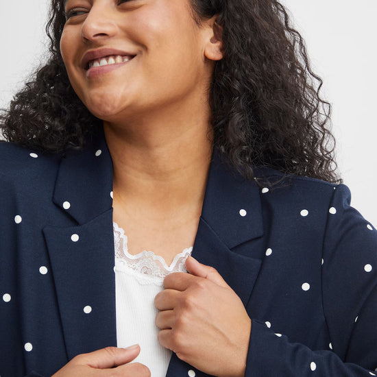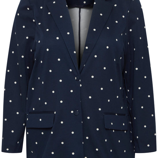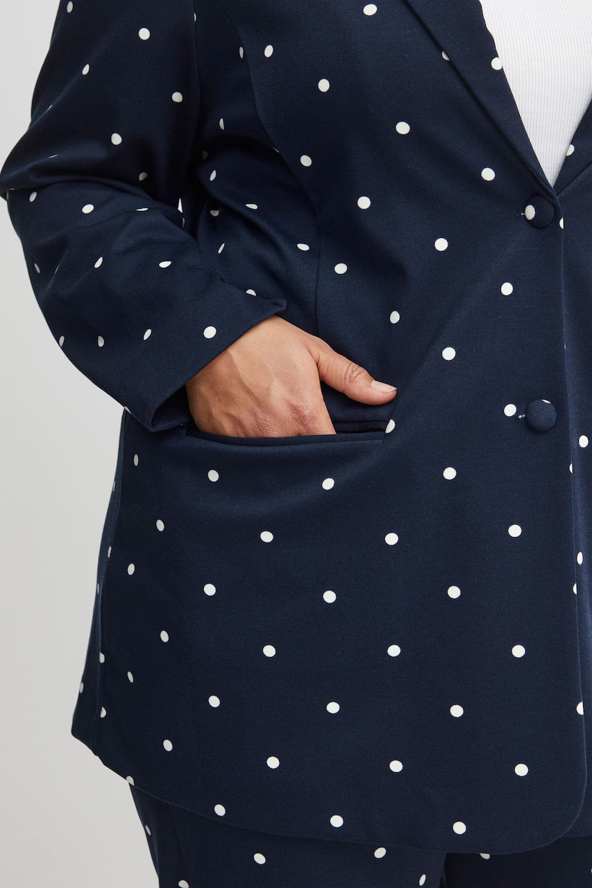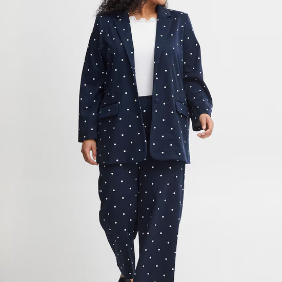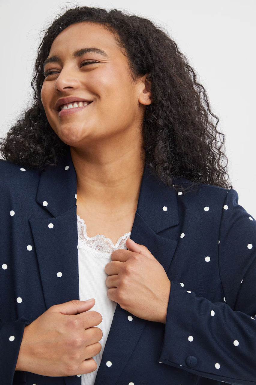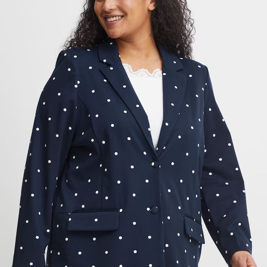 Giv dit outfit et frisk løft med denne elegante blazer fra Fransa Plus Size Selection. Blazeren har et moderne, løst fit og et flot, hvidt prikket mønster på navyblå bund og en helt blå. Perfekt til dig, der ønsker både komfort og stil: