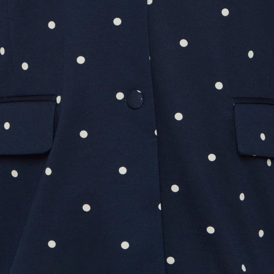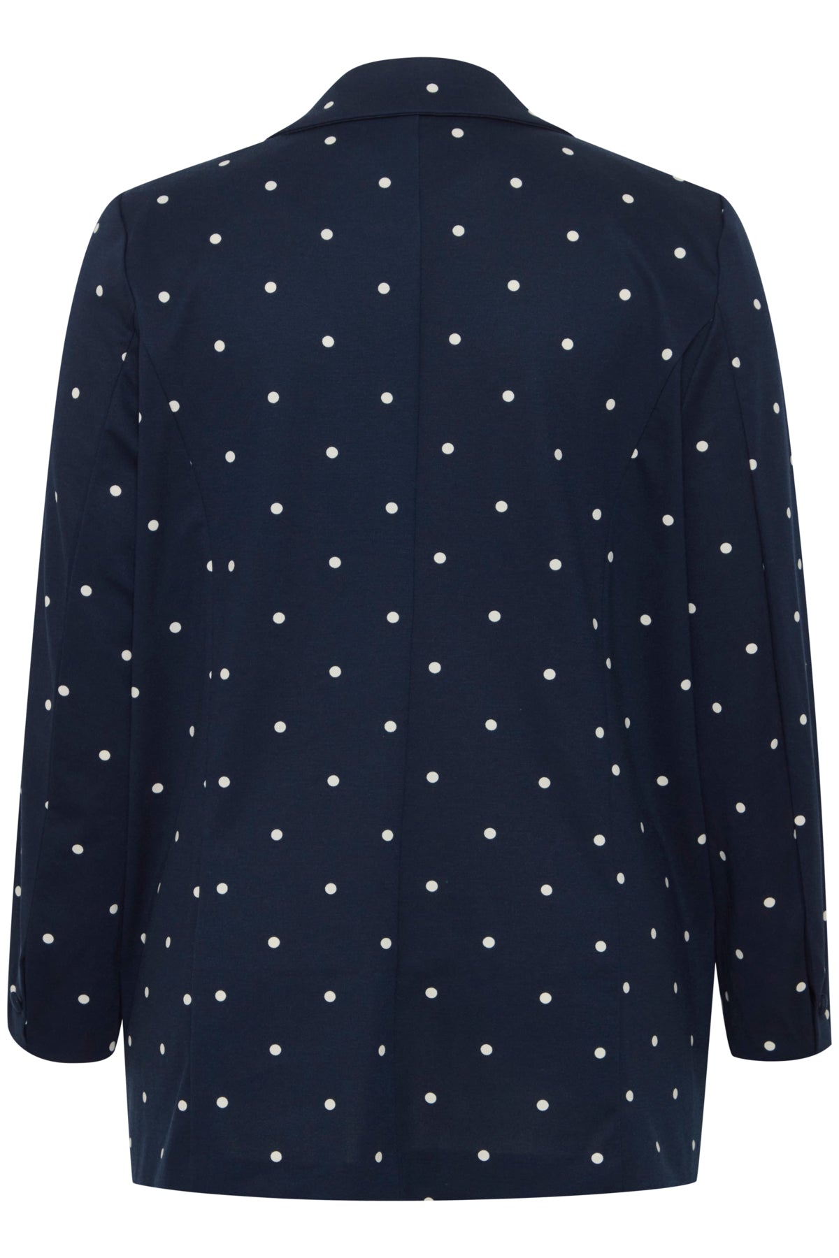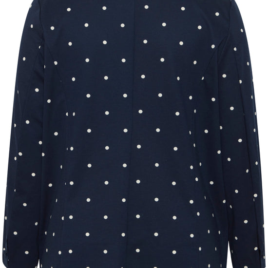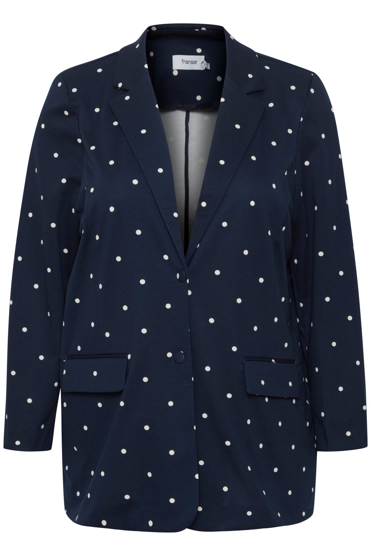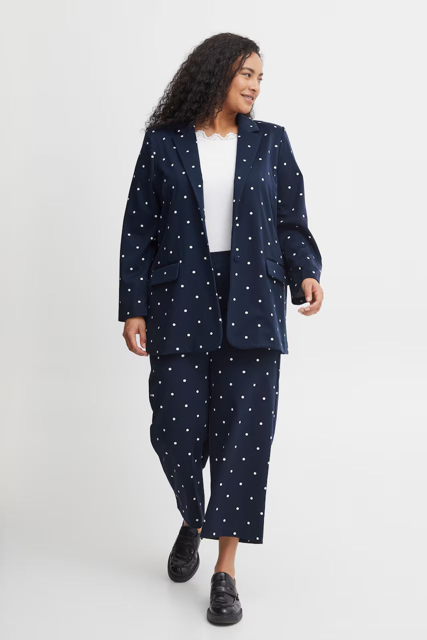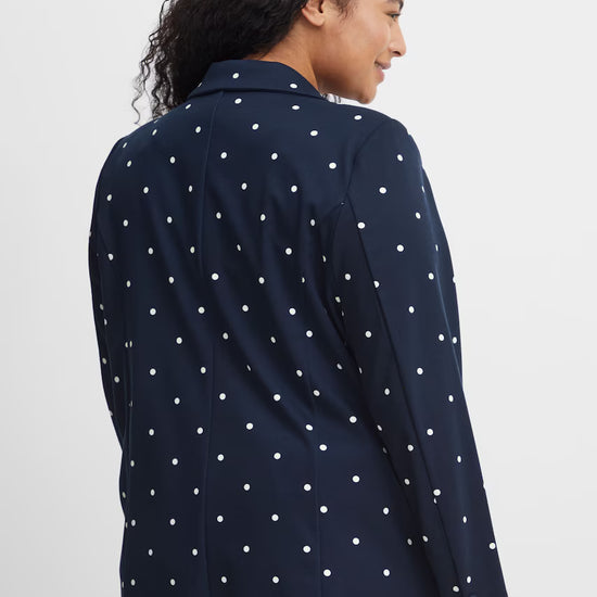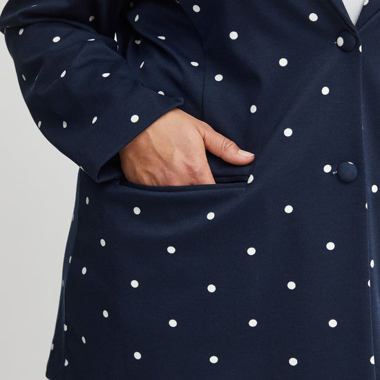 Giv dit outfit et frisk løft med denne elegante blazer fra Fransa Plus Size Selection. Blazeren har et moderne, løst fit og et flot, hvidt prikket mønster på navyblå bund og en helt blå. Perfekt til dig, der ønsker både komfort og stil: