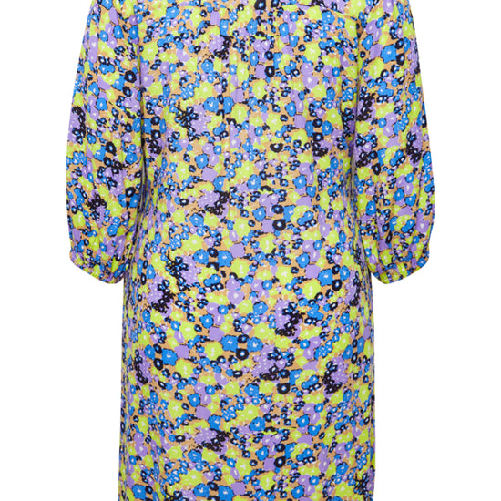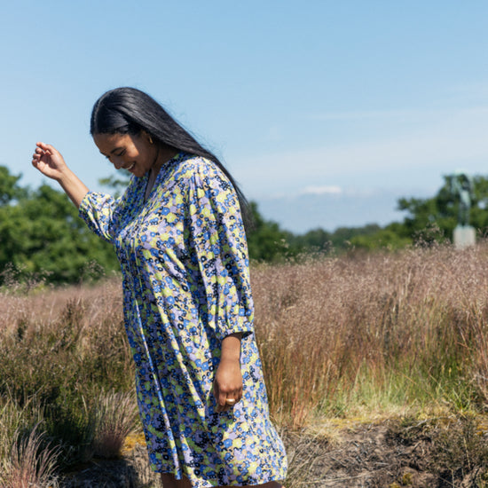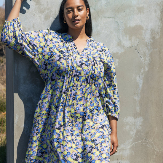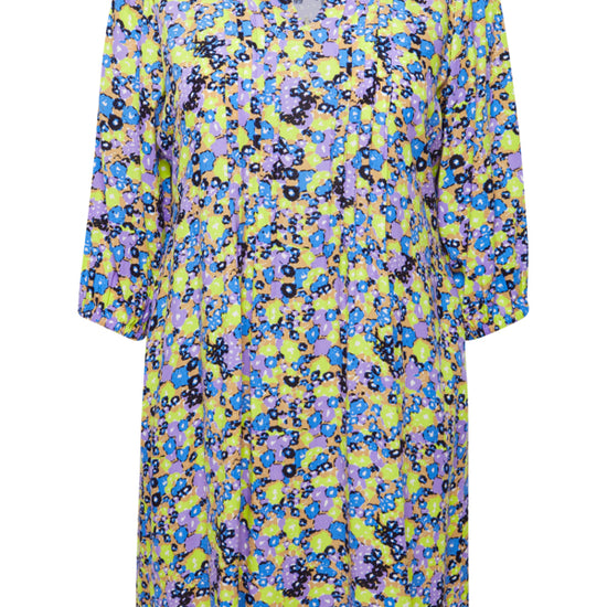 Forkæl dig selv med denne skønne kjole fra Fransa Plus Size Selection, der kombinerer komfort og stil på bedste vis. Kjolen har et smukt blomsterprint i blå, lilla og gule nuancer, lange ærmer med let vidde og elastisk afslutning, samt en v-hals med fine læg på brystet. Den løstsiddende pasform og de praktiske lommer gør den perfekt til både hverdag og sommerens arrangementer.