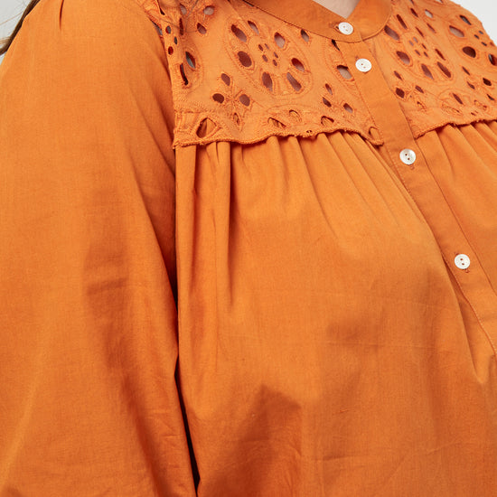 Blusen er designet med en rund halsudskæring og en knaplukning foran, dekoreret med et delikat broderet mønster, der strækker sig over skuldrene og brystet. Dette giver et feminint og elegant præg, mens elastiske manchetter sikrer en behagelig pasform.