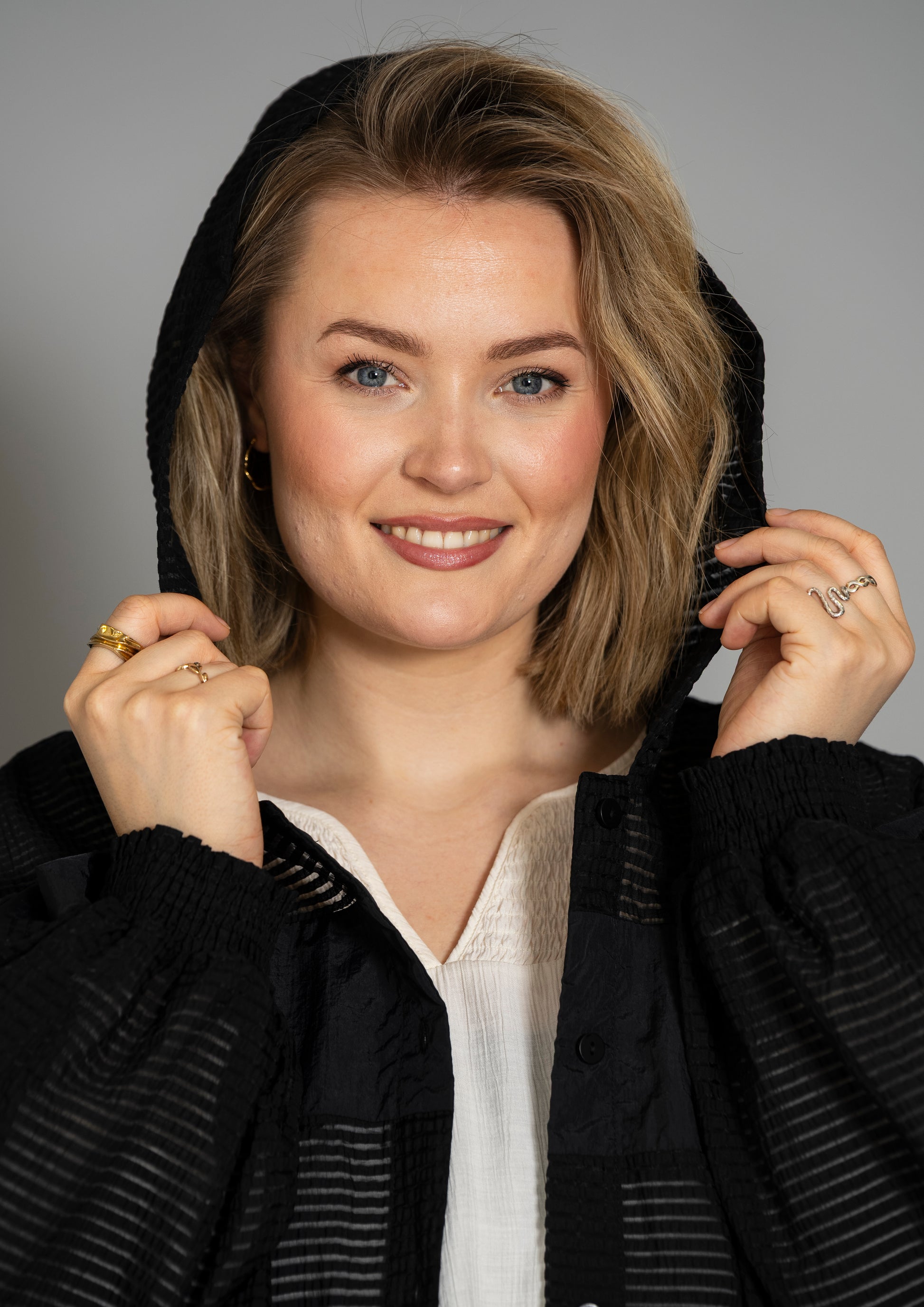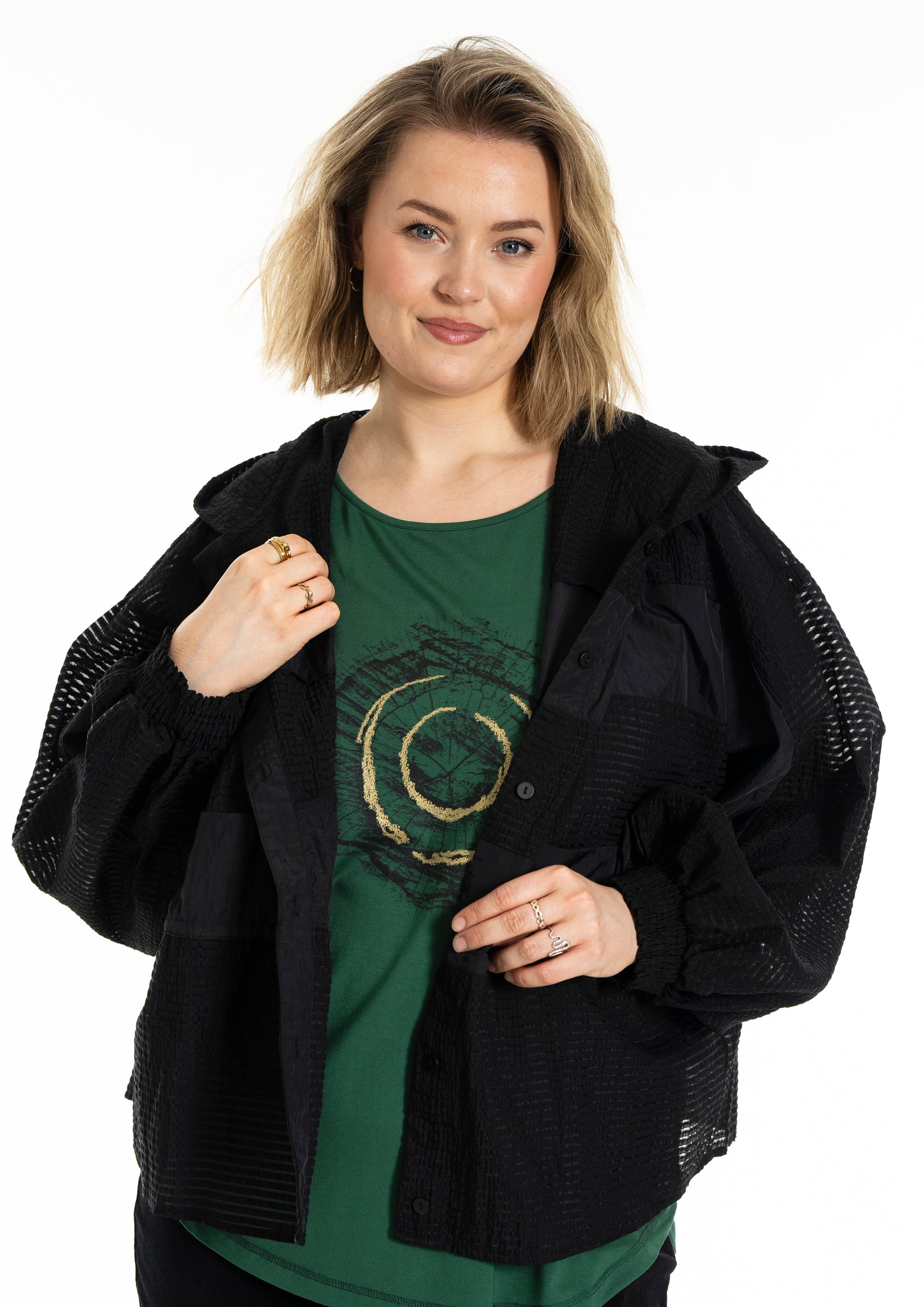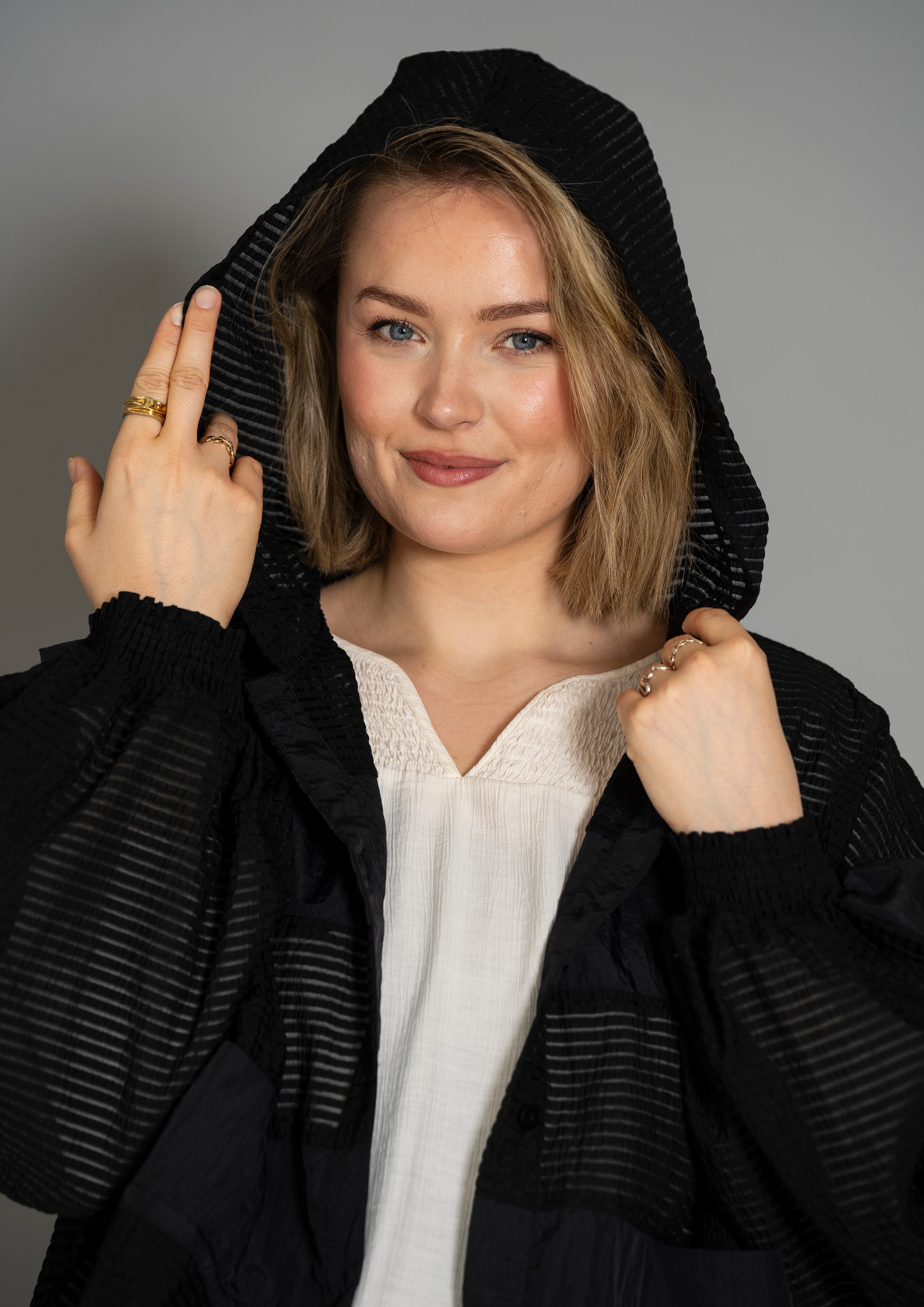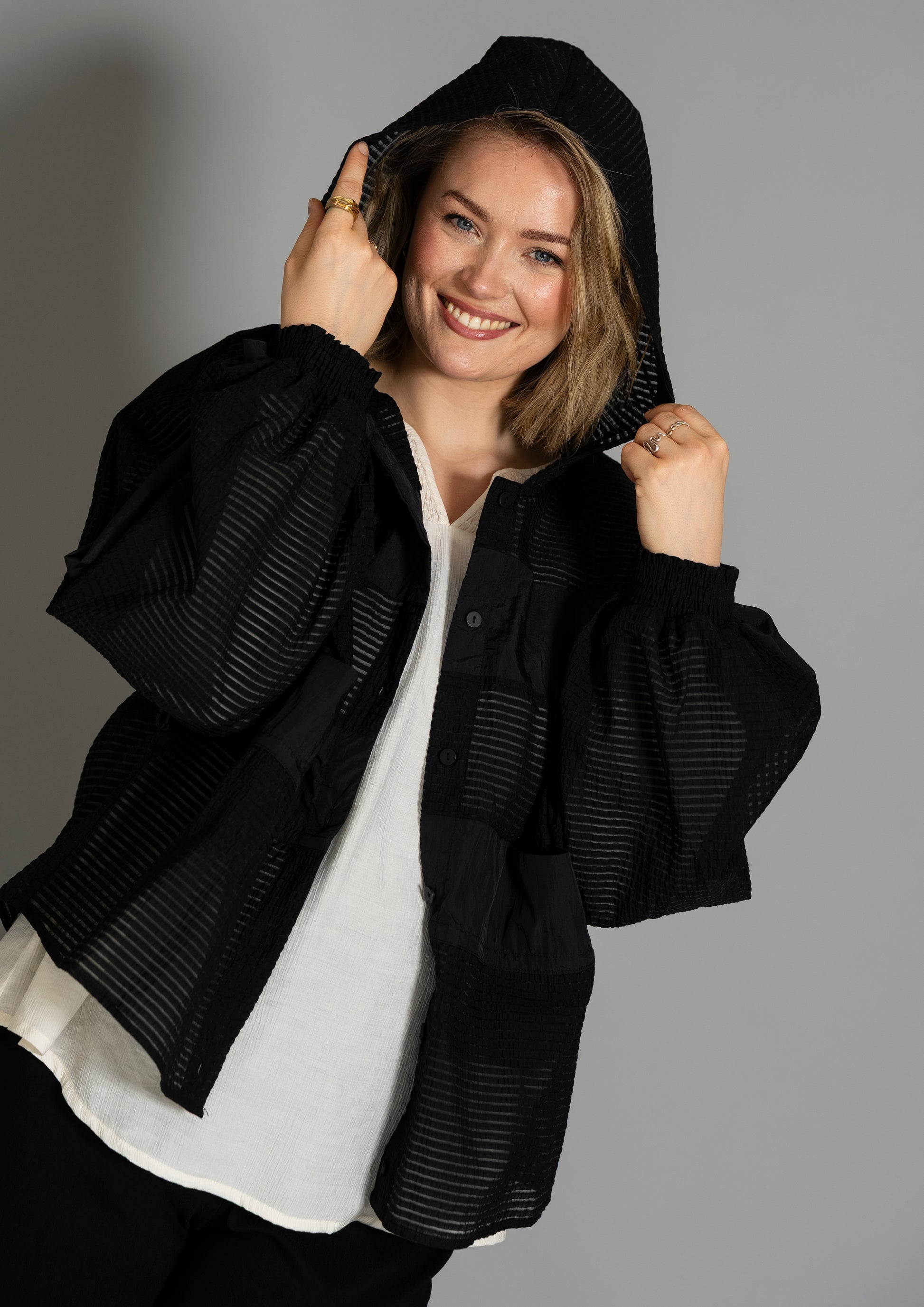 Denne sorte cardigan fra Gozzip er en smart tilføjelse til garderoben, hvor klassisk design møder moderne detaljer. Modellen er fremstillet i en blød blanding af bomuld og nylon, og den skiller sig ud med sit unikke stof, der har semi-transparente striber for et let og eksklusivt udtryk. Den faste hætte og den gennemgående knaplukning giver et afslappet look, mens de lange ærmer med elastisk smock-kant tilfører en fin volumen til silhuetten.