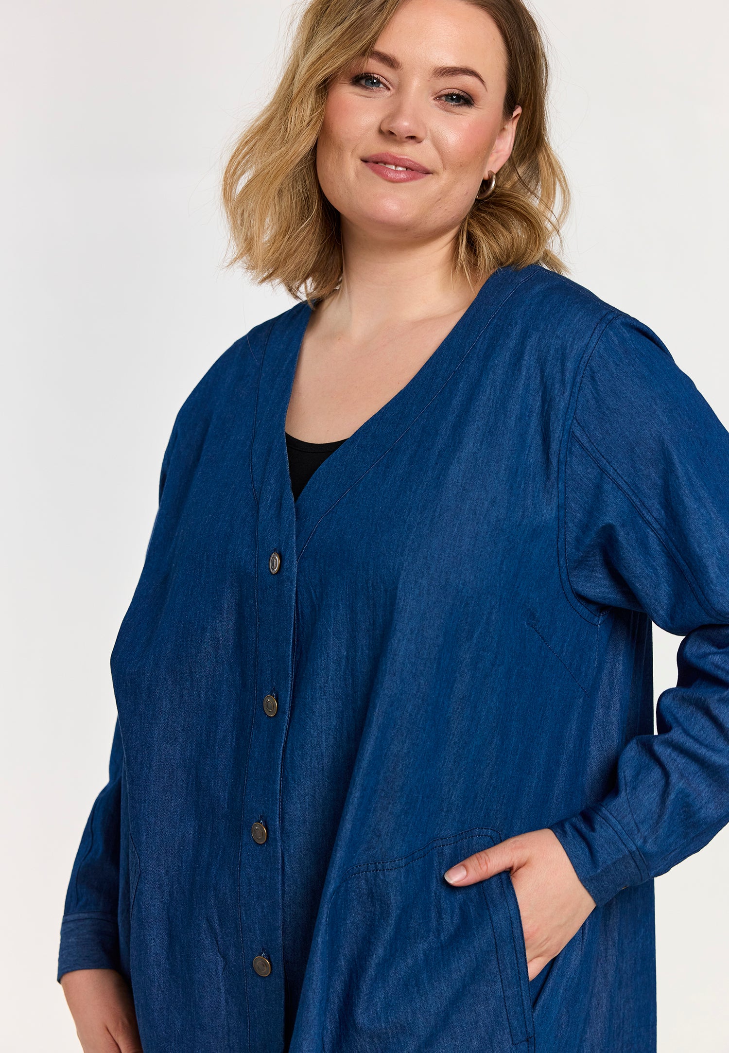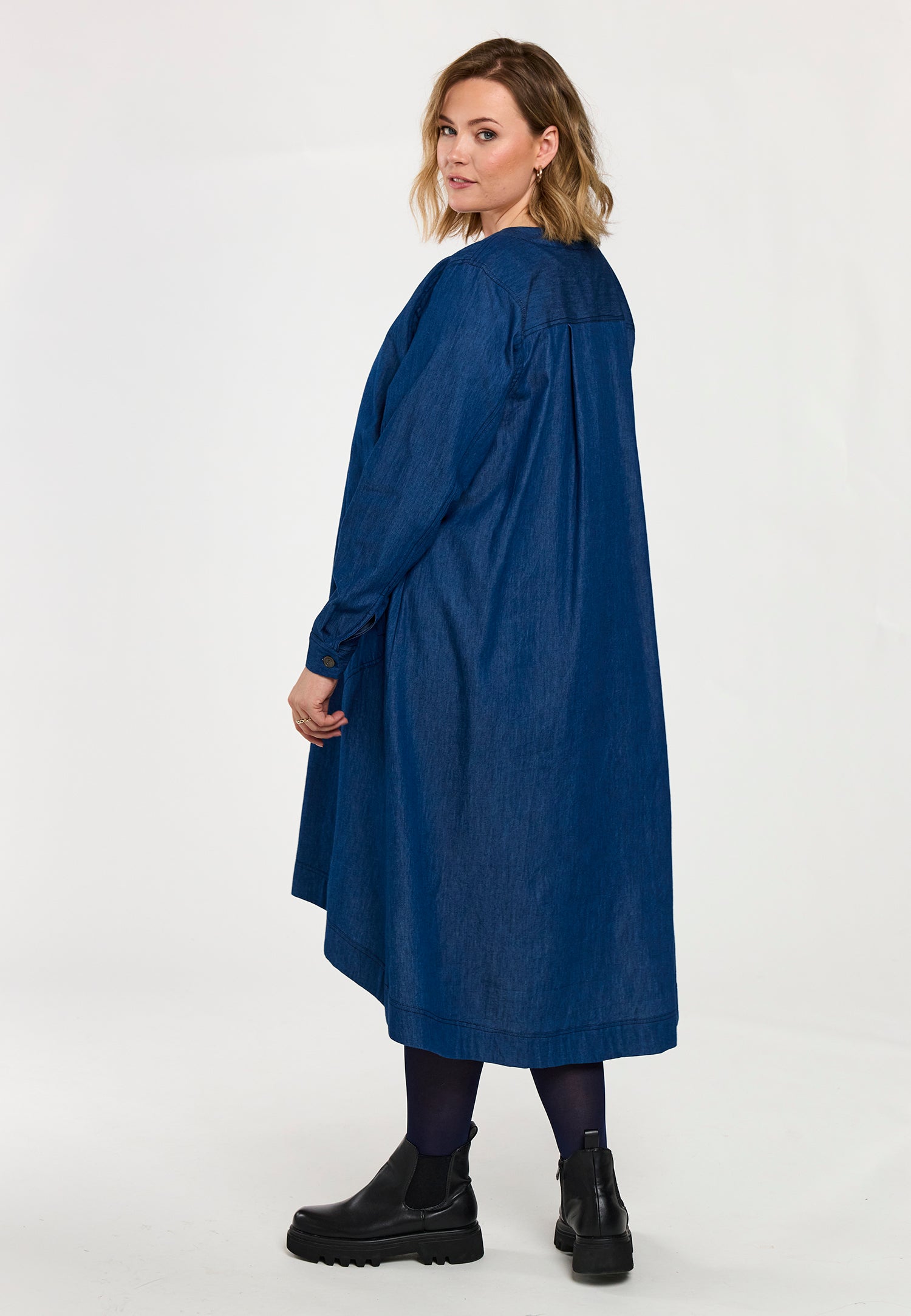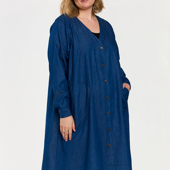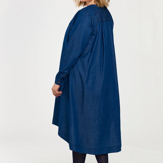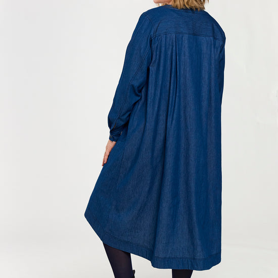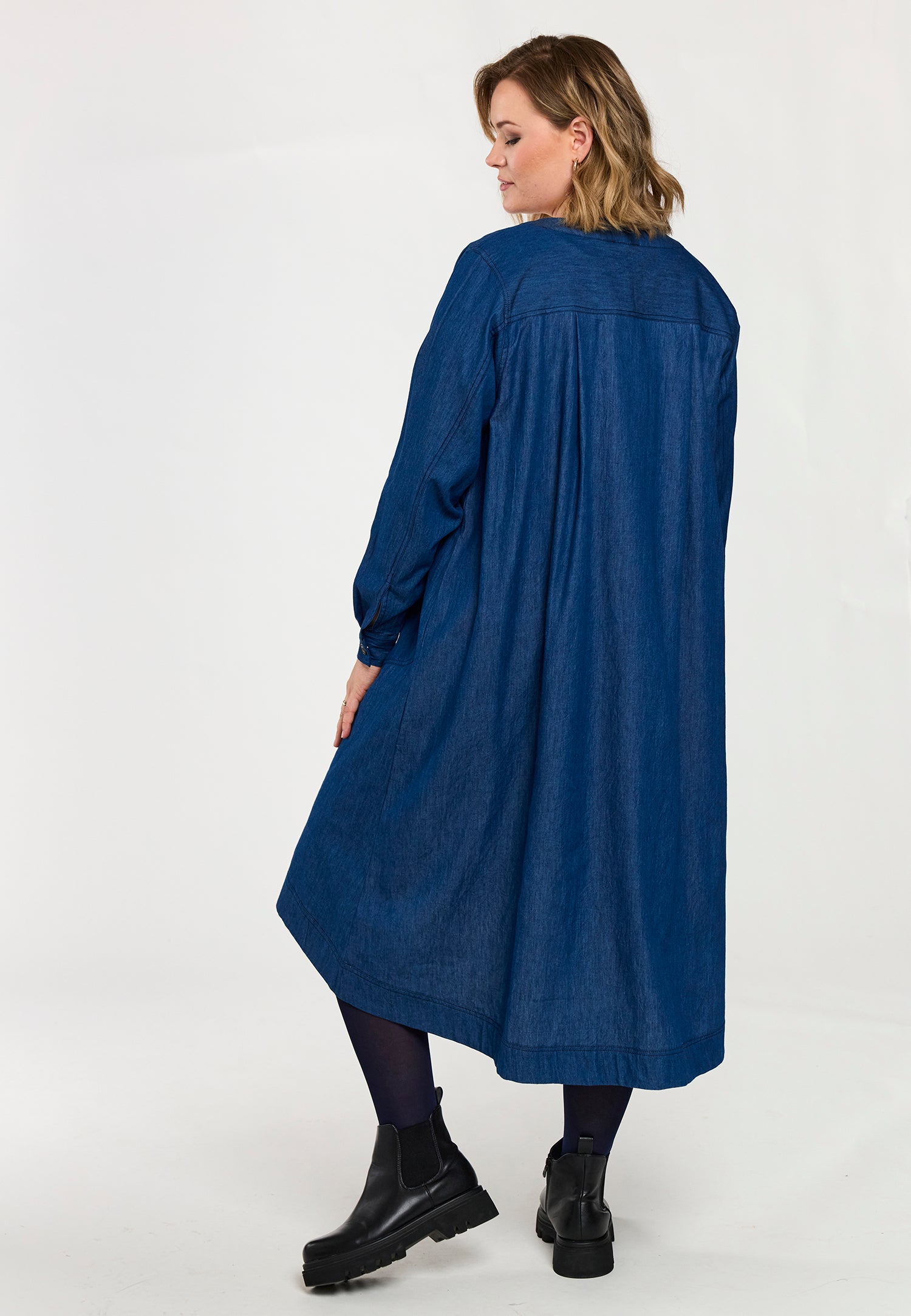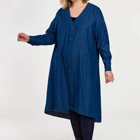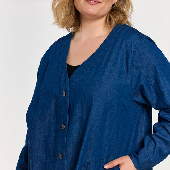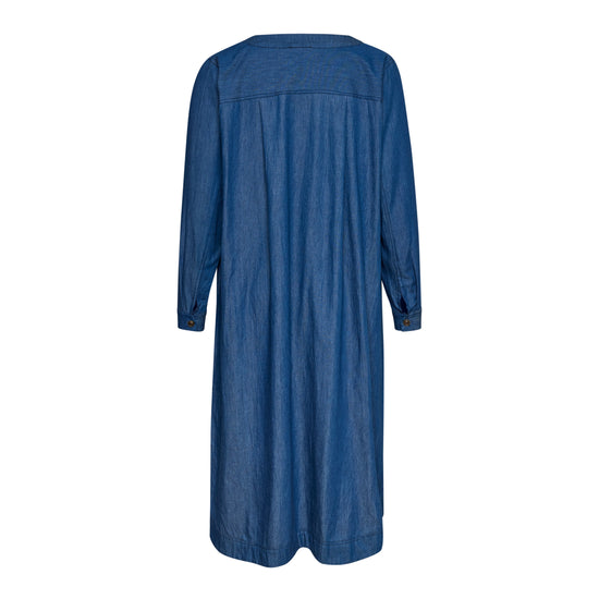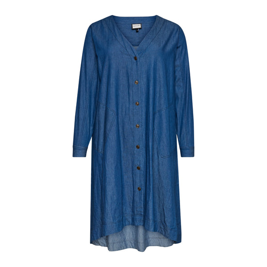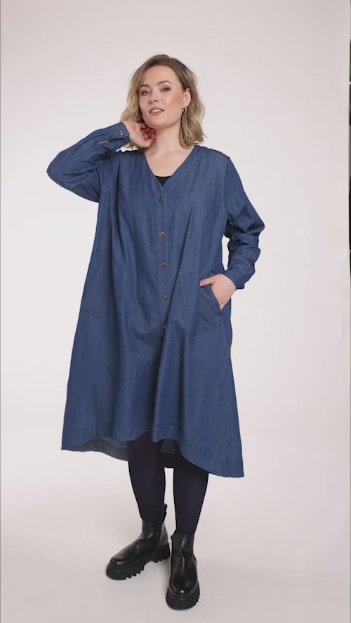 En let og rummelig denimkjole i 100% bomuld med en afslappet, A-formet silhuet. Modellen har V-udskæring, lange ærmer og praktiske sidelommer, som giver et casual og samtidig feminint udtryk. Den løse pasform gør kjolen ideel til hverdagsbrug og lag-på-lag styling.