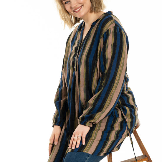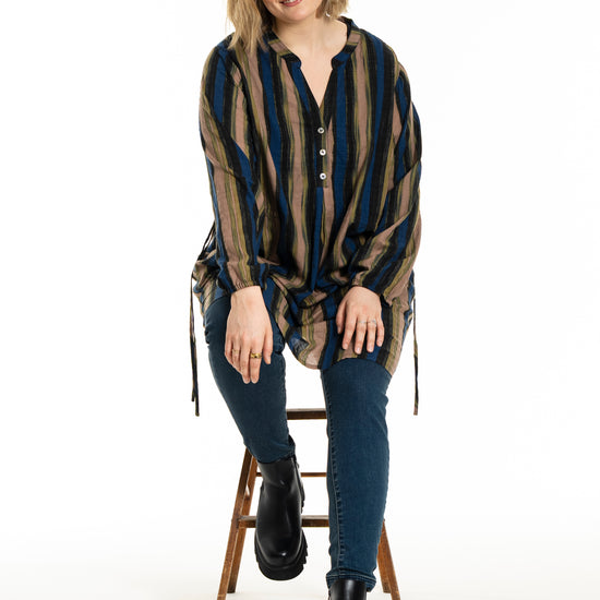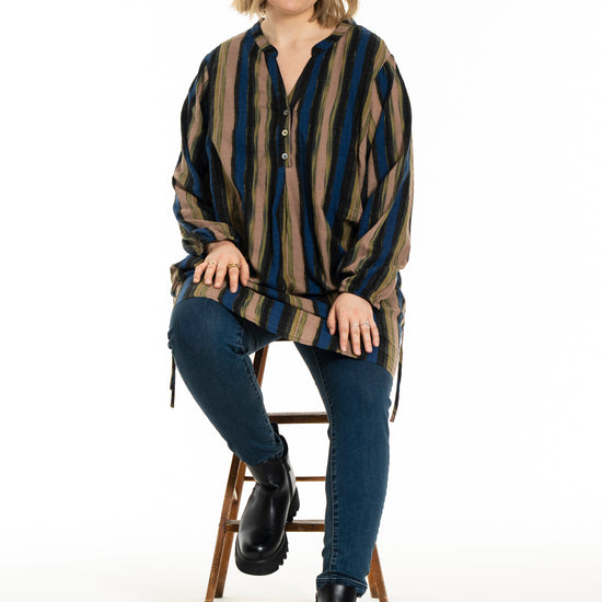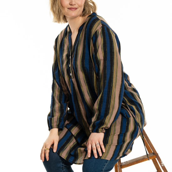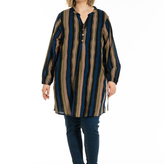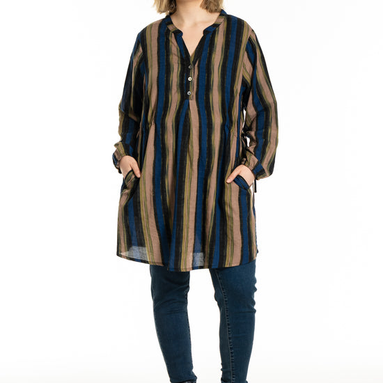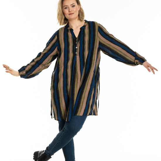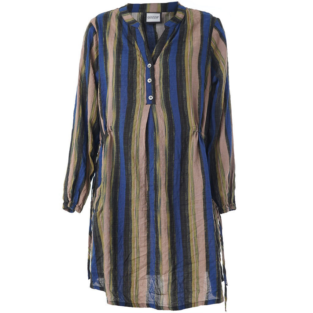 Denne tunika fra Gozzip byder på et moderne og afslappet udtryk med sine flotte vertikale striber i nuancer af blå, brun og sort, der skaber et levende farvespil. Modellen er fremstillet i en lækker blanding af bomuld og viskose, hvilket sikrer en høj komfort og åndbarhed mod huden dagen lang. Designet har en feminin V-udskæring, der fortsætter ned i en dekorativ knaplukning foran, samt fine detaljer med bindebånd i siderne, som tilføjer kant til det ellers klassiske snit.