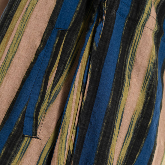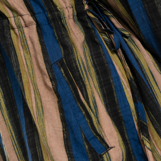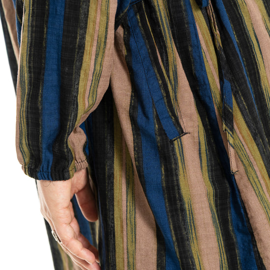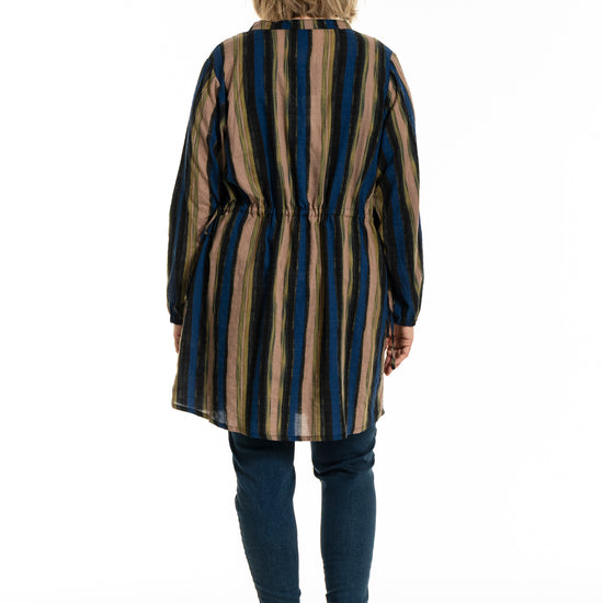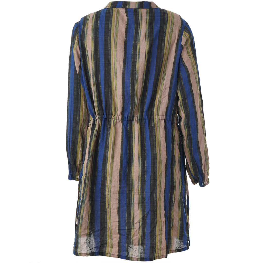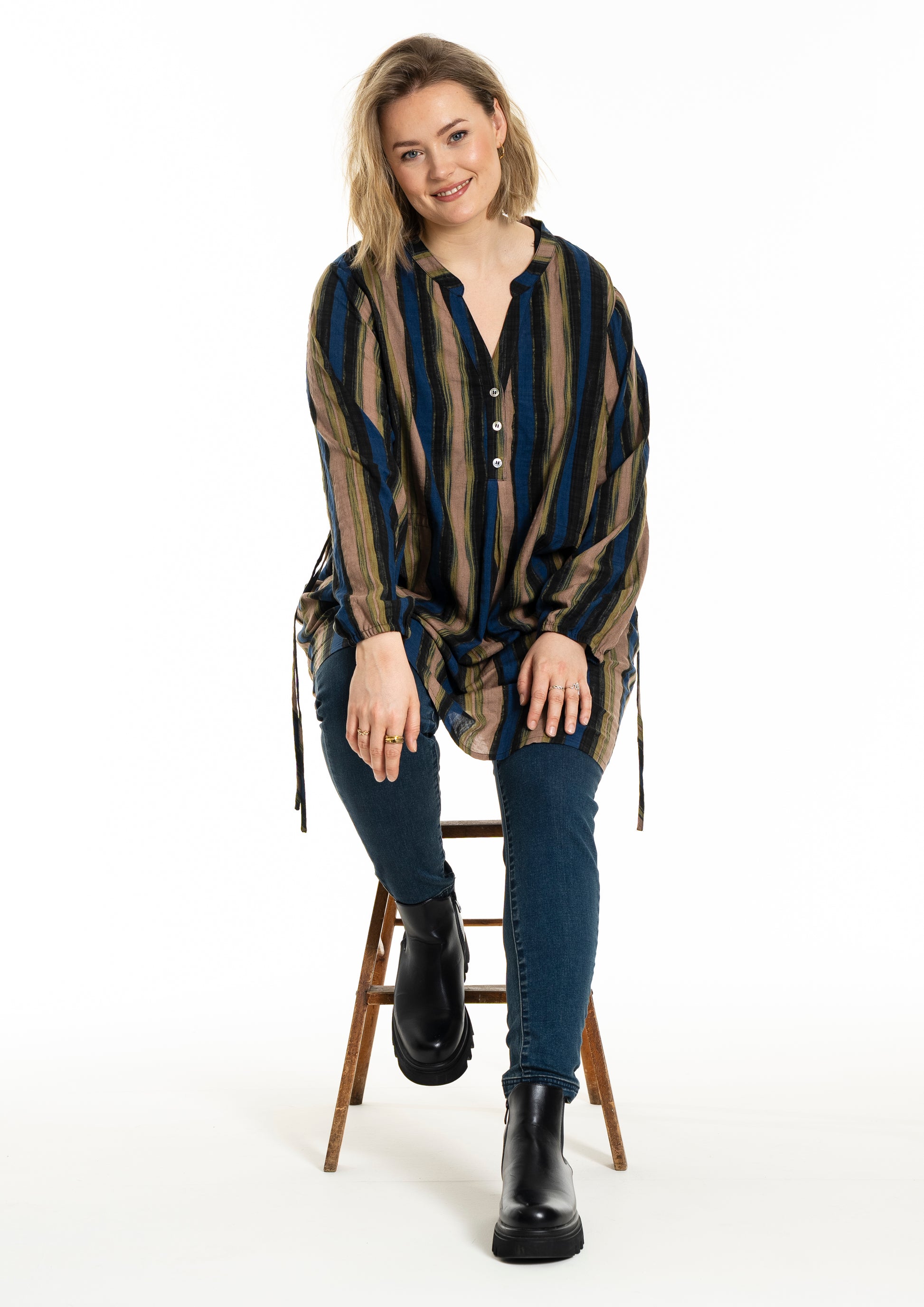 Denne tunika fra Gozzip byder på et moderne og afslappet udtryk med sine flotte vertikale striber i nuancer af blå, brun og sort, der skaber et levende farvespil. Modellen er fremstillet i en lækker blanding af bomuld og viskose, hvilket sikrer en høj komfort og åndbarhed mod huden dagen lang. Designet har en feminin V-udskæring, der fortsætter ned i en dekorativ knaplukning foran, samt fine detaljer med bindebånd i siderne, som tilføjer kant til det ellers klassiske snit.