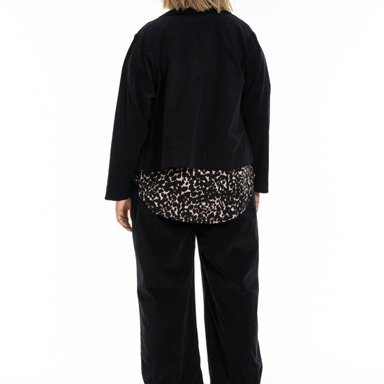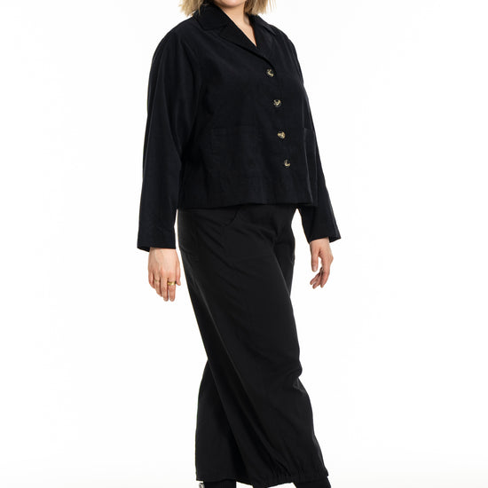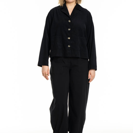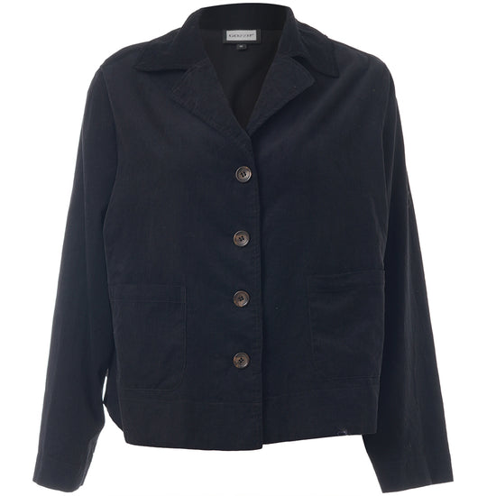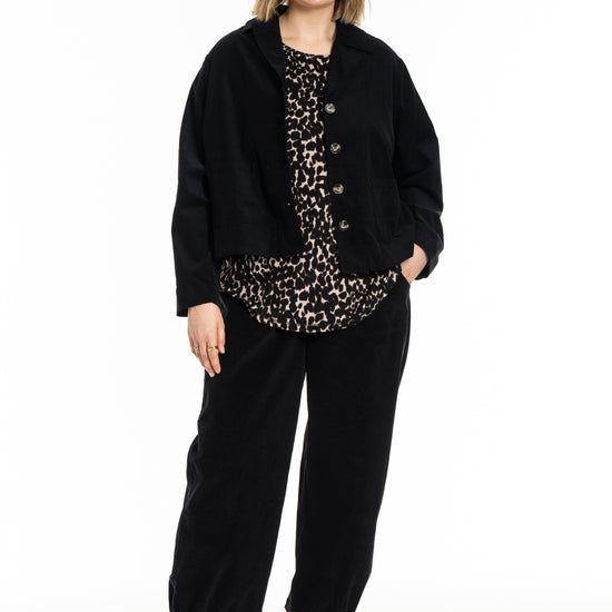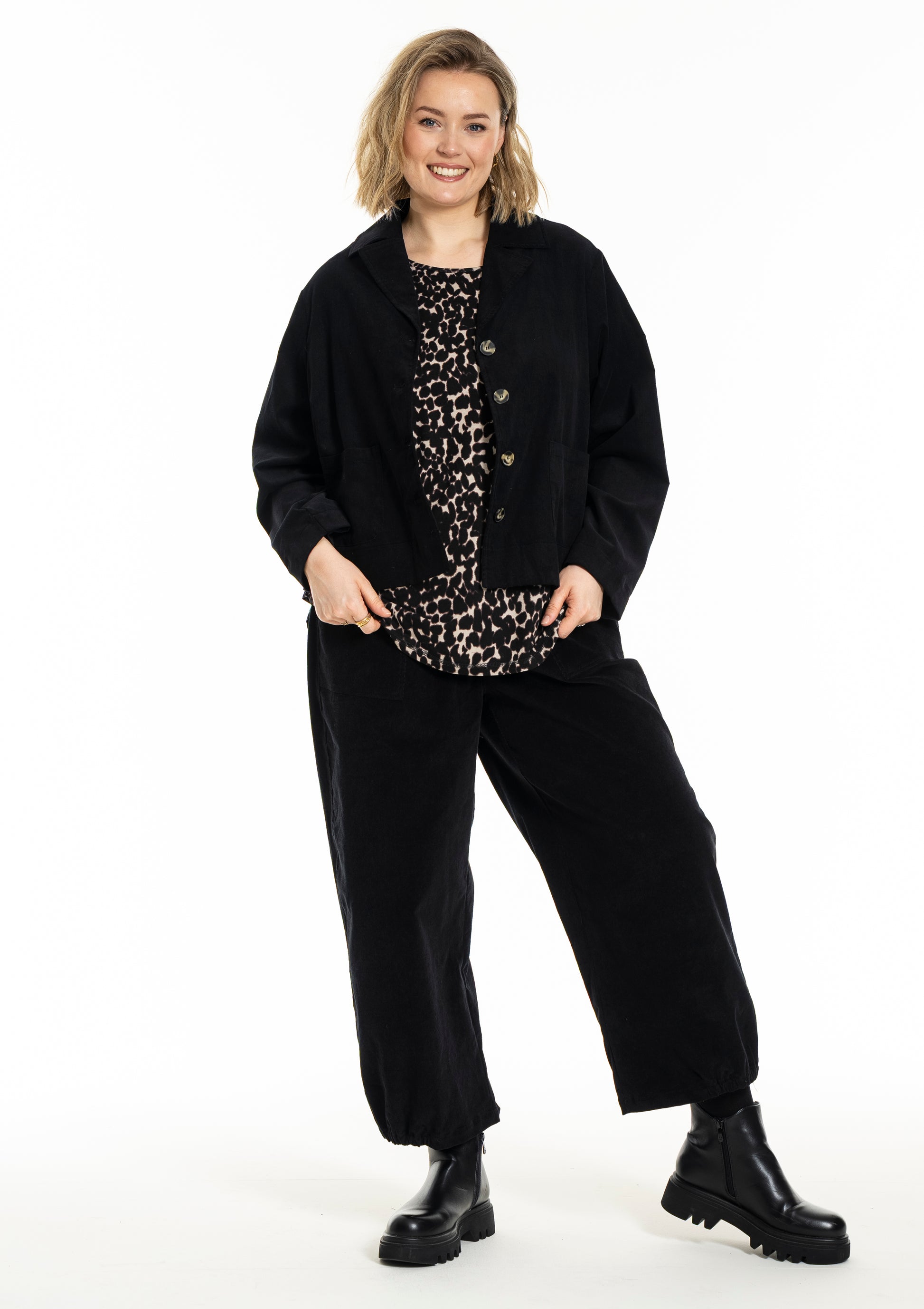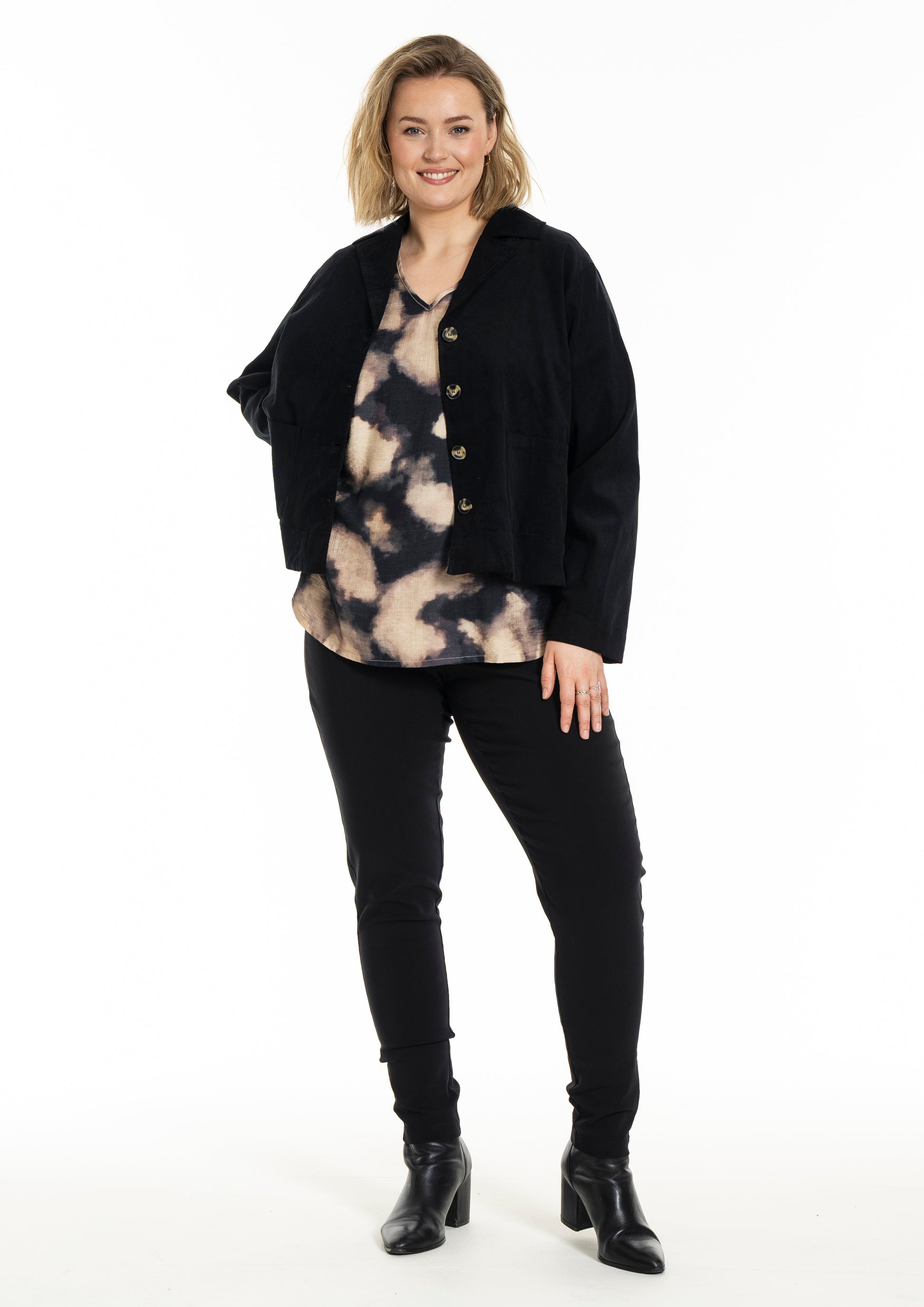 Denne alsidige jakke kombinerer et stilrent design med høj komfort, da den er udført i ren bomuld med en slidstærk og blød struktur. Modellen har en klassisk skjortekrave, lange ærmer og en gennemgående knaplukning, der gør den nem at bruge som en trendy plus size shacket i din hverdagsgarderobe. Det enkle snit brydes fint af de store knapper og de markante påsatte lommer foran, som giver tøjet karakter og funktionalitet.