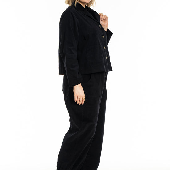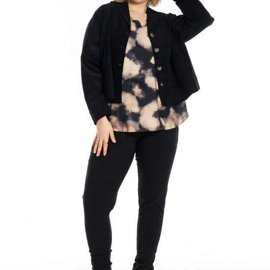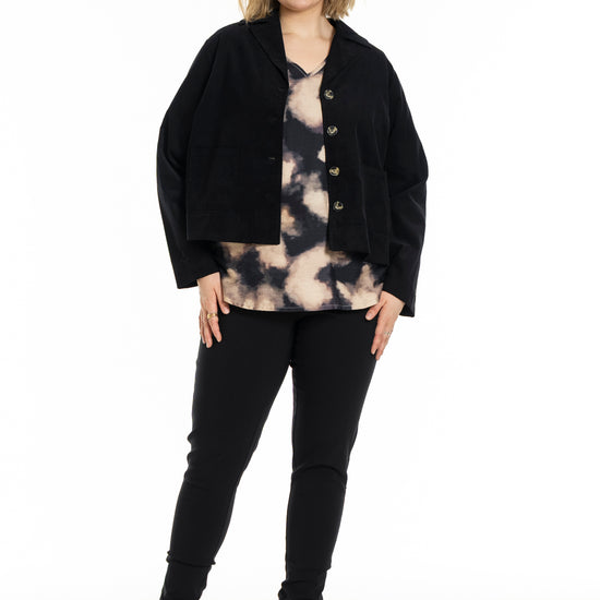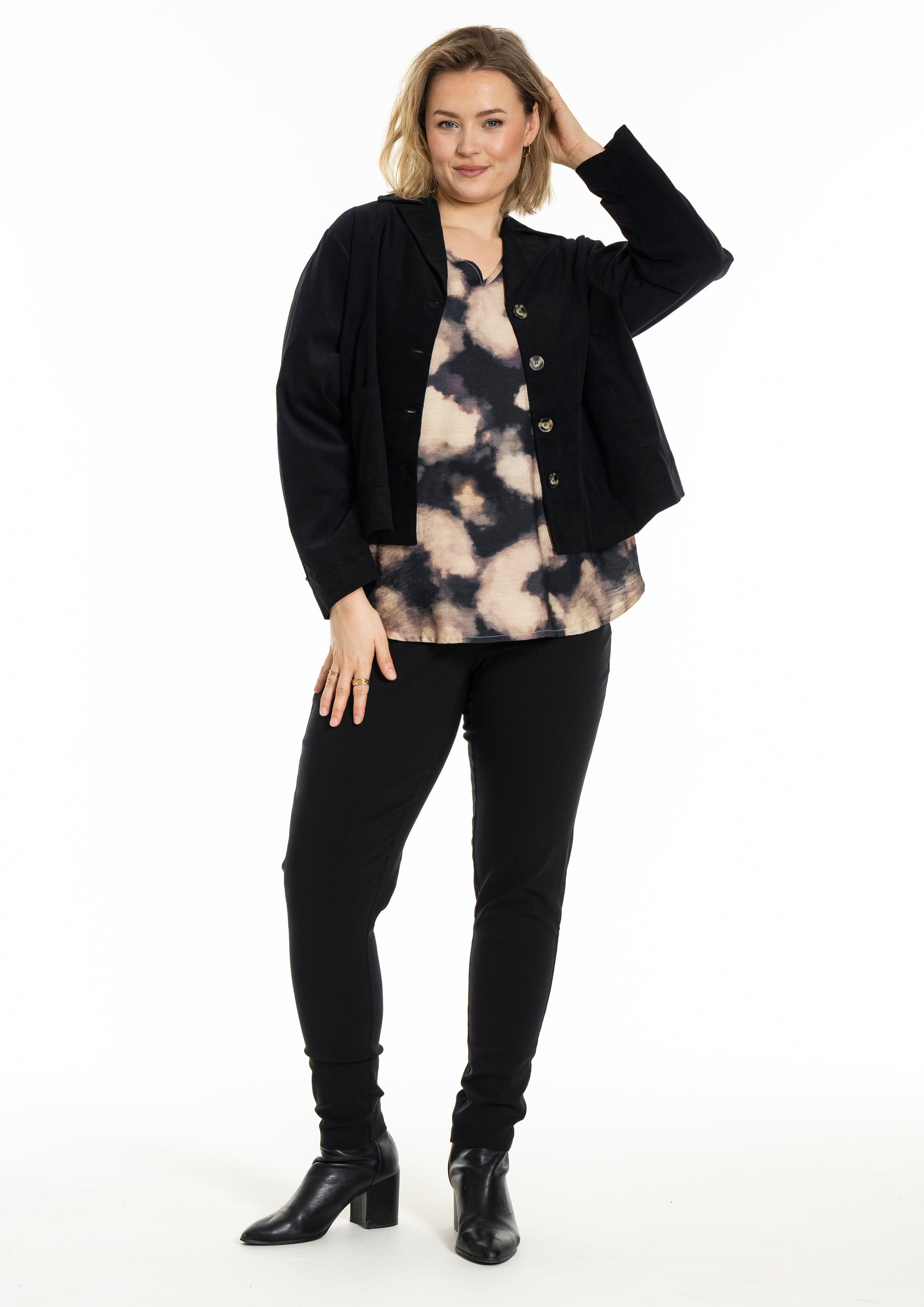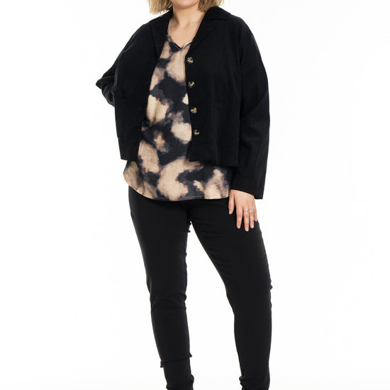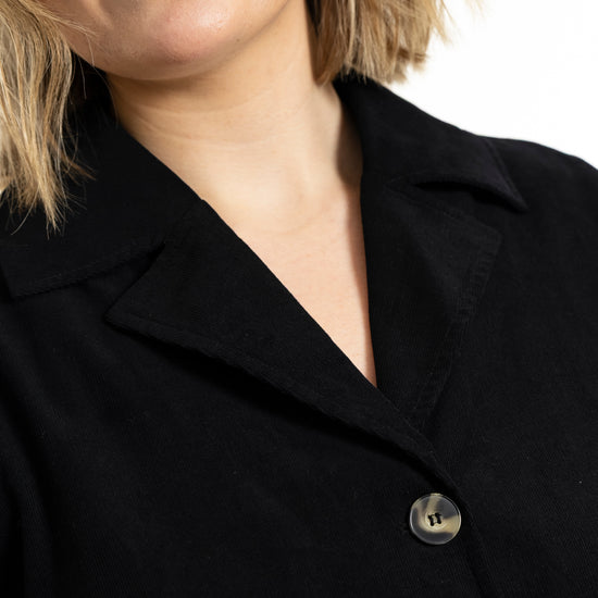 Det let oversized fit sikrer et afslappet udtryk, der gør det nemt at style jakken lag-på-lag over dine yndlings plus size toppe. Den korte længde passer perfekt til både nederdele og smarte plus size bukser, hvilket giver dig mange muligheder for at skabe et personligt look. Brug den åben for et casual udtryk, hvor du viser dit outfit under, eller lukket for en mere markeret silhuet.