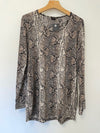 Oplev det stilfulde design, med denne elegante bluse, der kombinerer et eksotisk slangemønster i sofistikerede nuancer af sort, brun og beige. Blusen er fremstillet i en blanding af 95% polyester og 5% elastan, hvilket giver en behagelig pasform med både holdbarhed og fleksibilitet. Det lette materiale sikrer komfort hele dagen, mens den runde halsudskæring og lange ærmer skaber et klassisk look med et moderne twist.