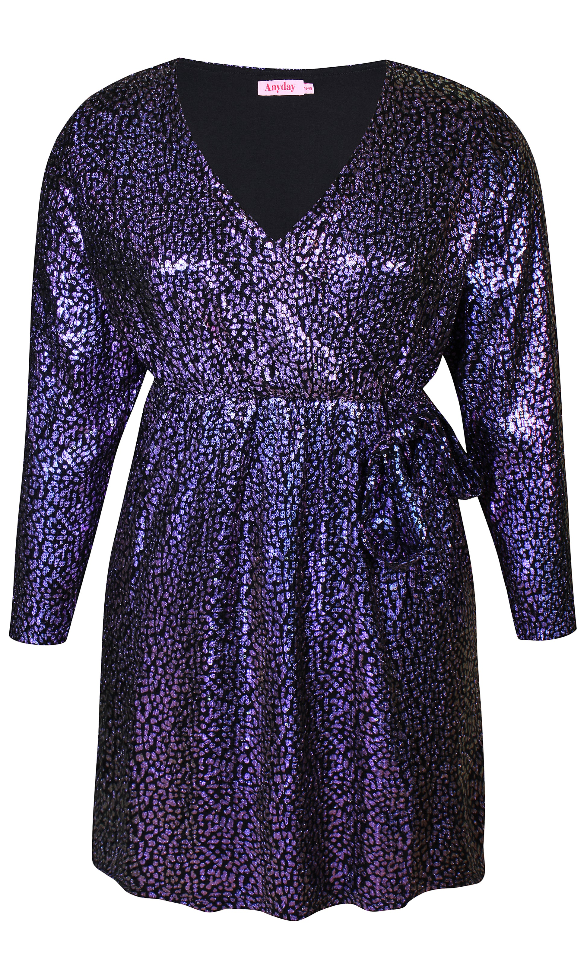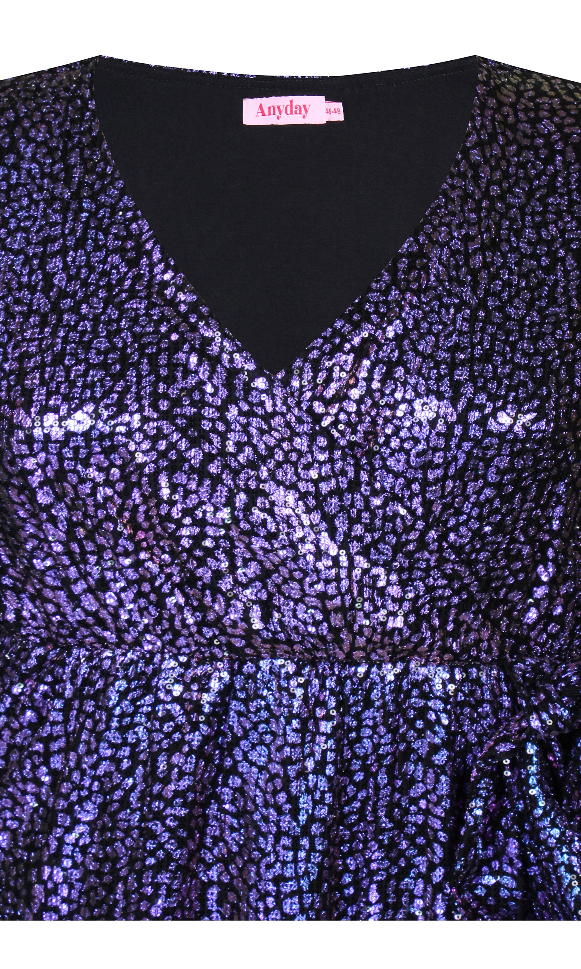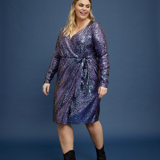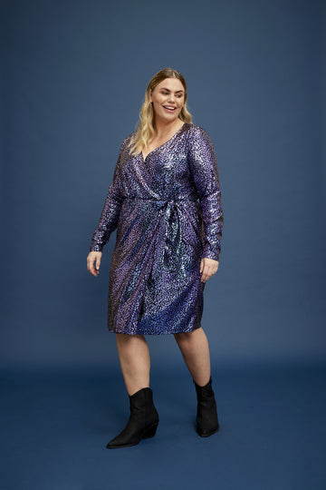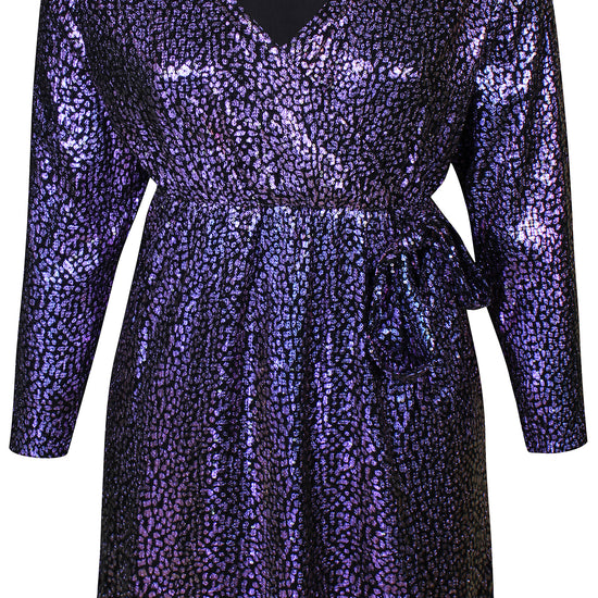 Træd ind i rampelyset med denne glitrende kjole fra Anyday, der kombinerer glamour og komfort. Kjolen er designet i en knælang model med lange ærmer og en flatterende V-udskæring, der fremhæver din silhuet. Fremstillet af 95% polyester og 5% elastan, sikrer den en behagelig pasform, der føles skøn mod huden. De skinnende lilla og blå nuancer tilføjer en iøjnefaldende glitrende effekt, der gør kjolen ideel til festlige begivenheder. Tilgængelig i størrelser 38/40 til 58, så enhver kvinde kan finde den perfekte pasform.