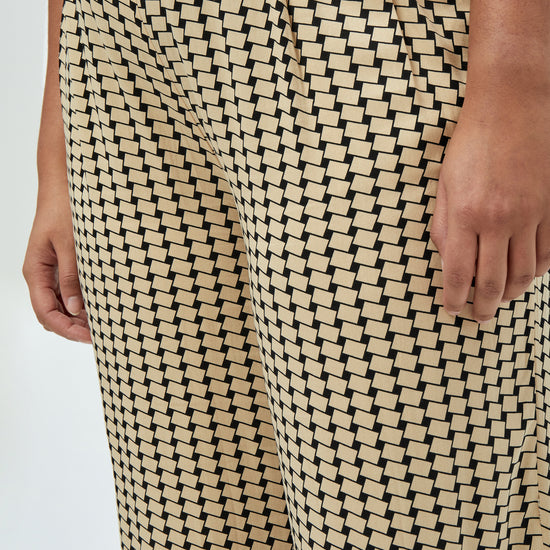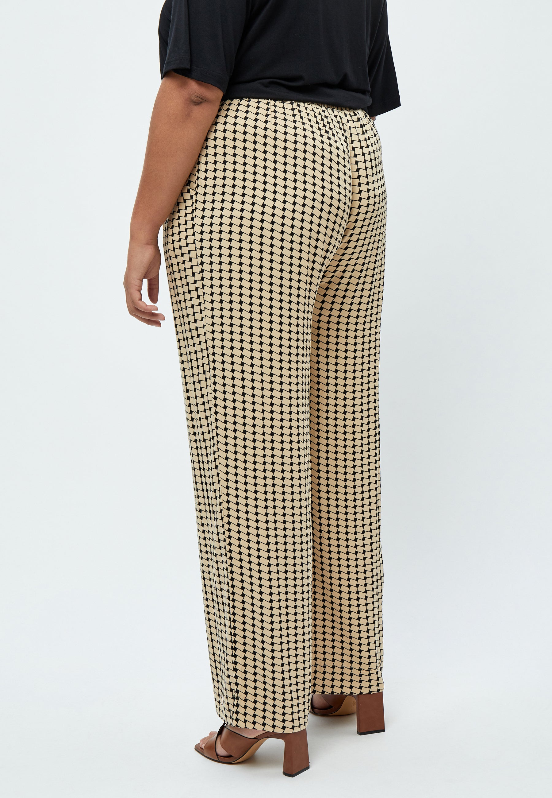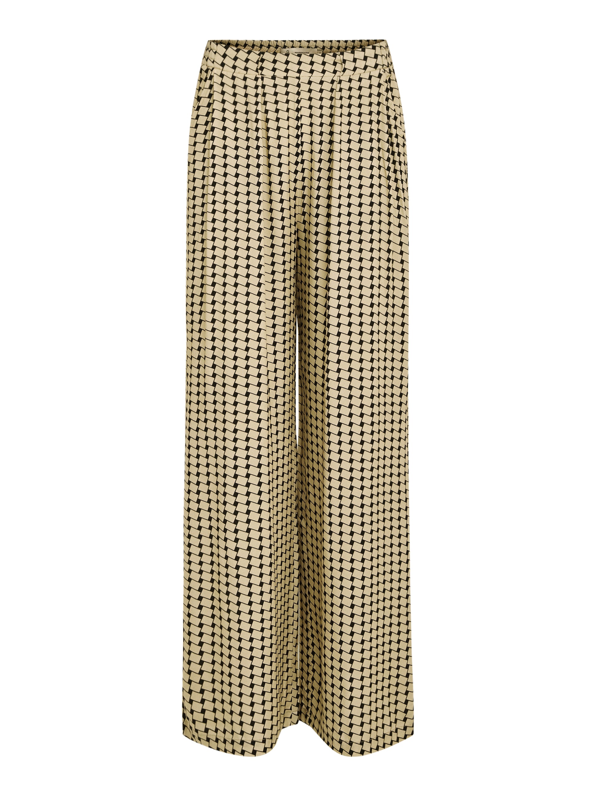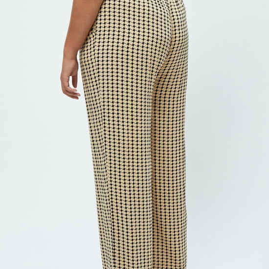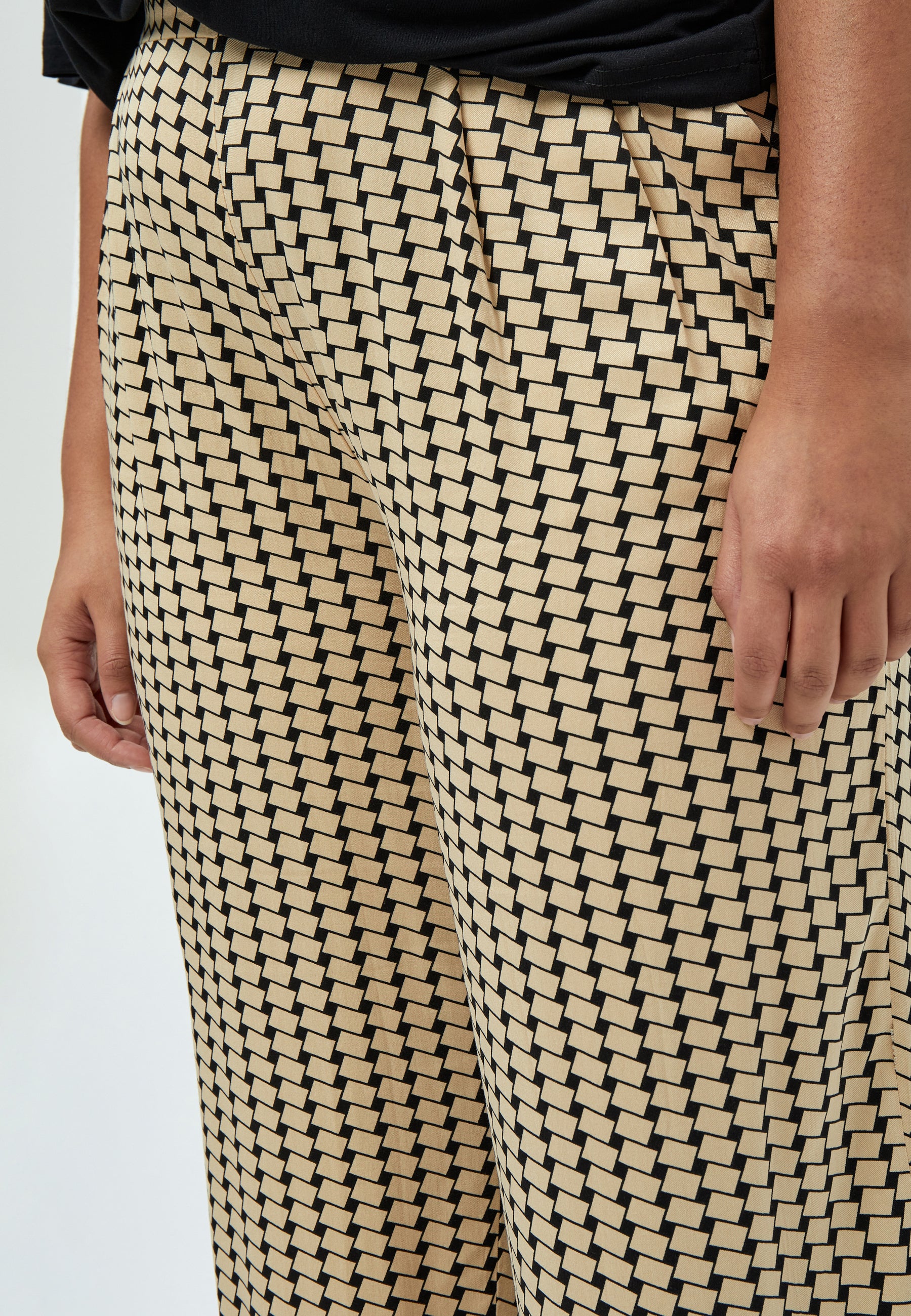 De geometriske mønstre i sandfarver skaber en moderne og tidløs æstetik. Bukserne har en høj elastisk talje, der sikrer en behagelig og flatterende pasform, samt praktiske sidelommer for ekstra bekvemmelighed. Kombiner dem med en stilfuld top eller en bluse for et komplet look.