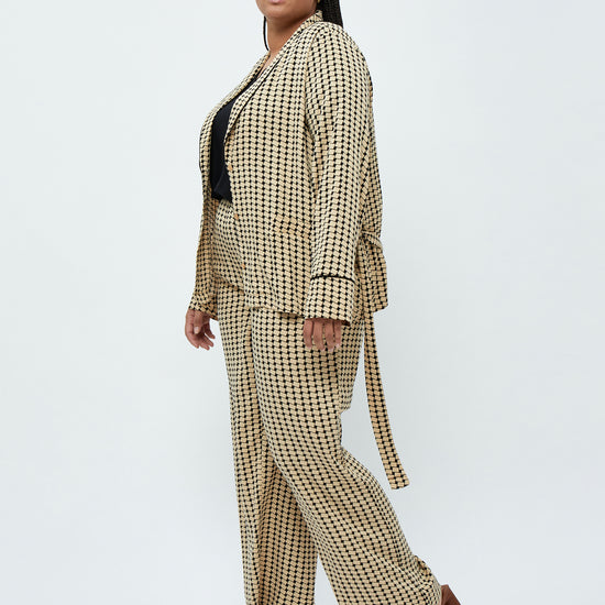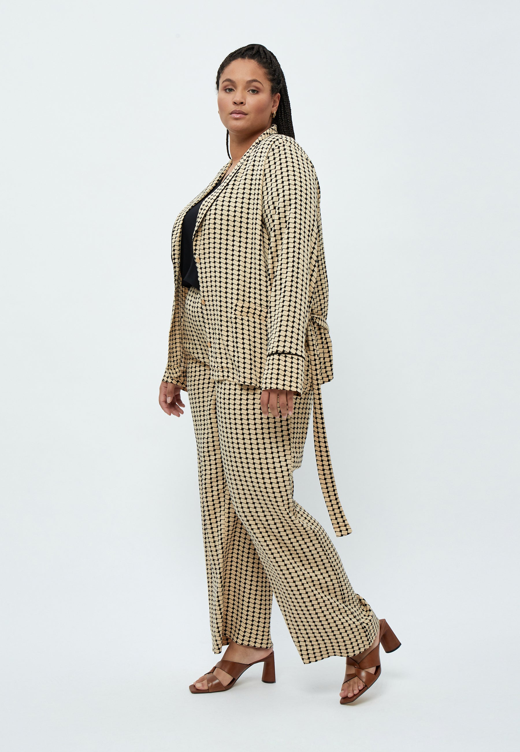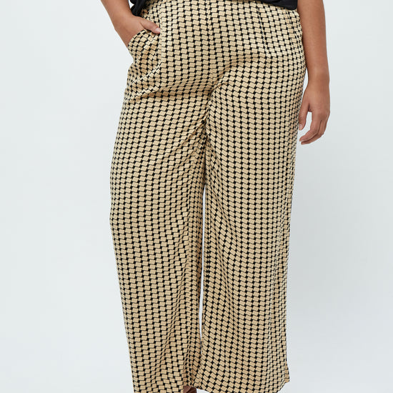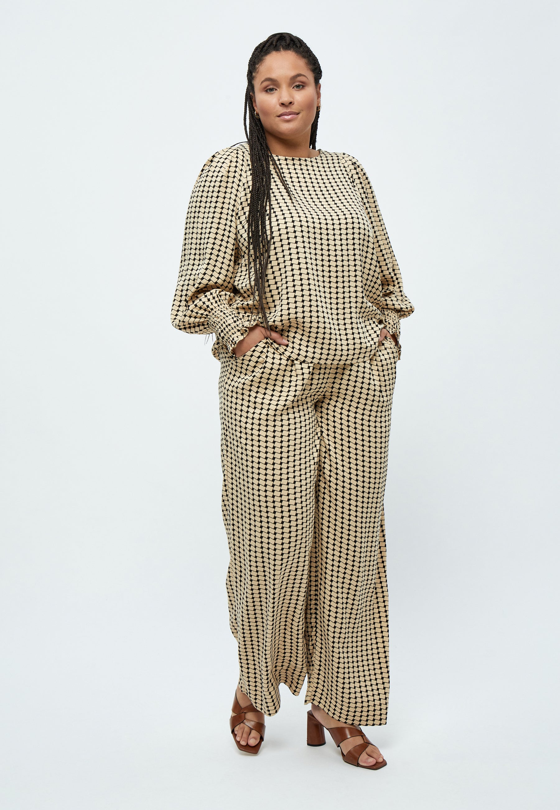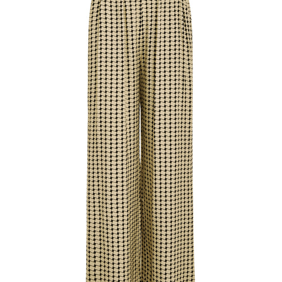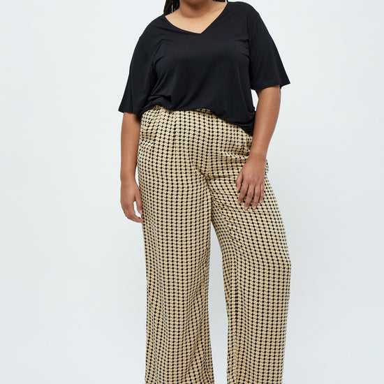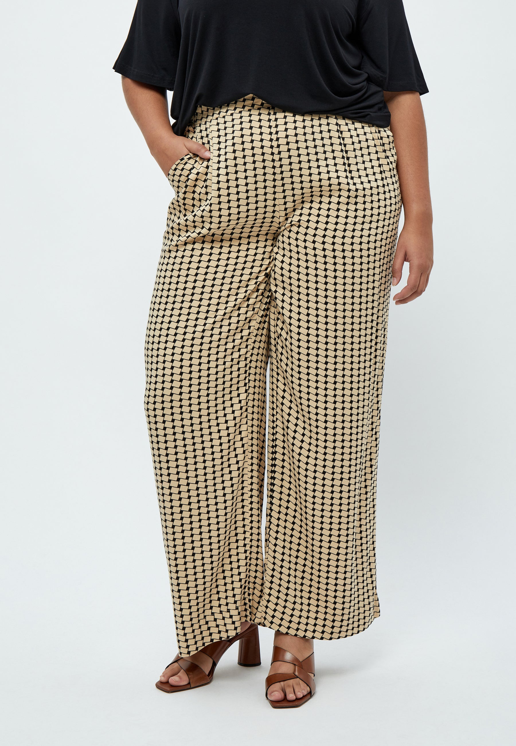 De geometriske mønstre i sandfarver skaber en moderne og tidløs æstetik. Bukserne har en høj elastisk talje, der sikrer en behagelig og flatterende pasform, samt praktiske sidelommer for ekstra bekvemmelighed. Kombiner dem med en stilfuld top eller en bluse for et komplet look.