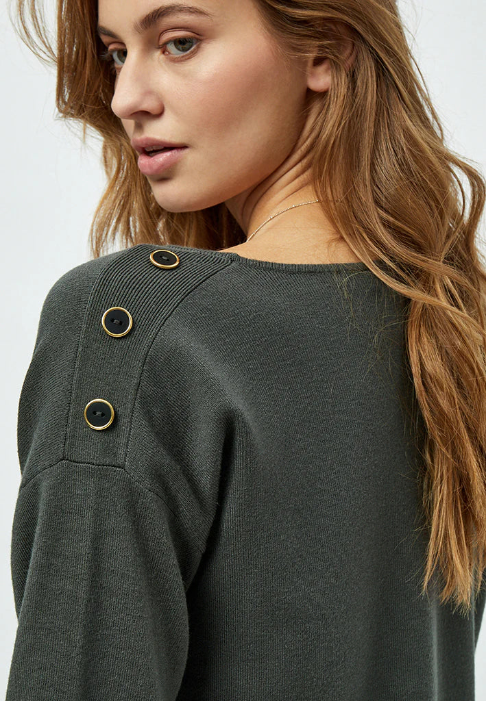 - Lange ærmer, rund hals og dekorative knapper på skulderen