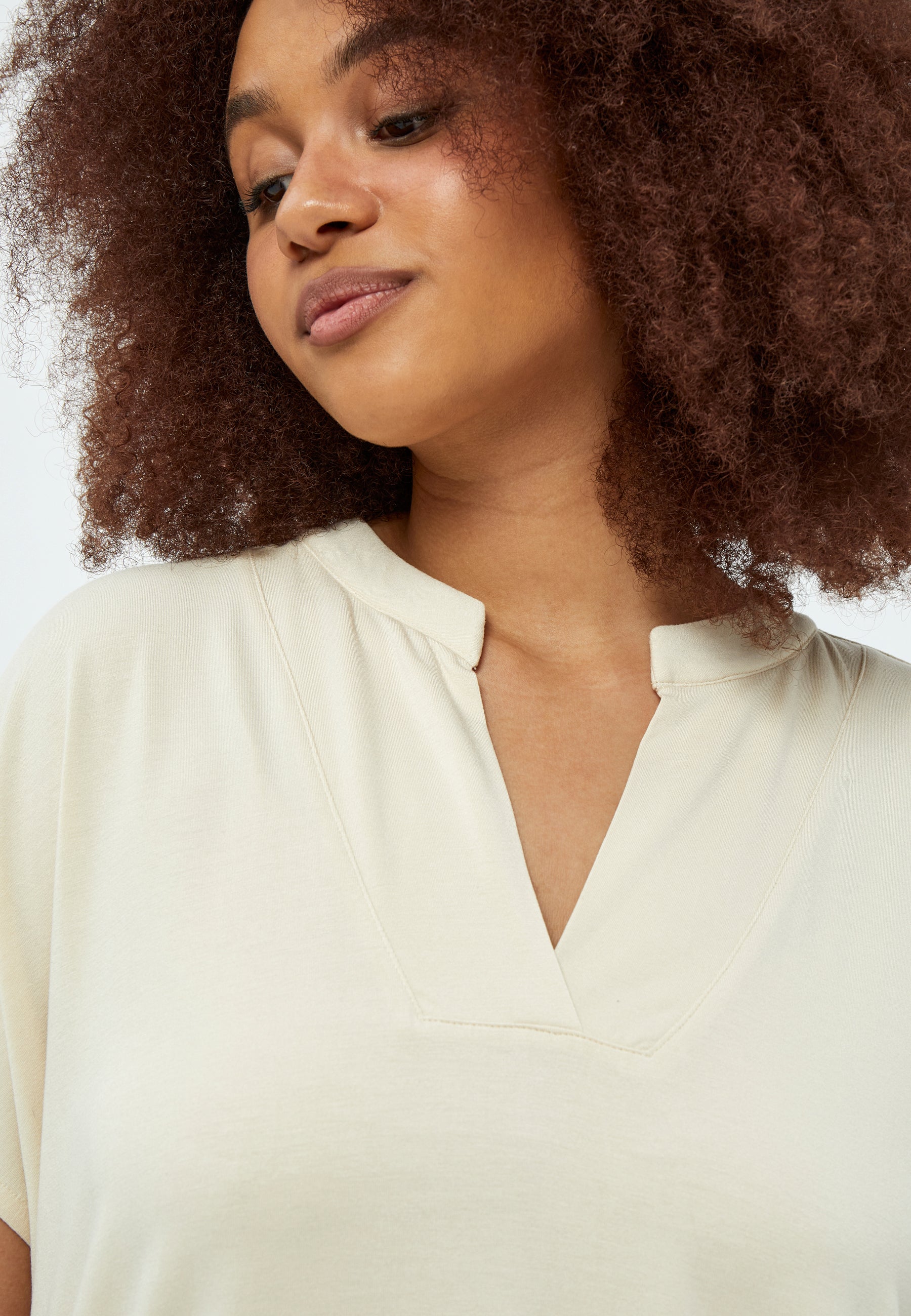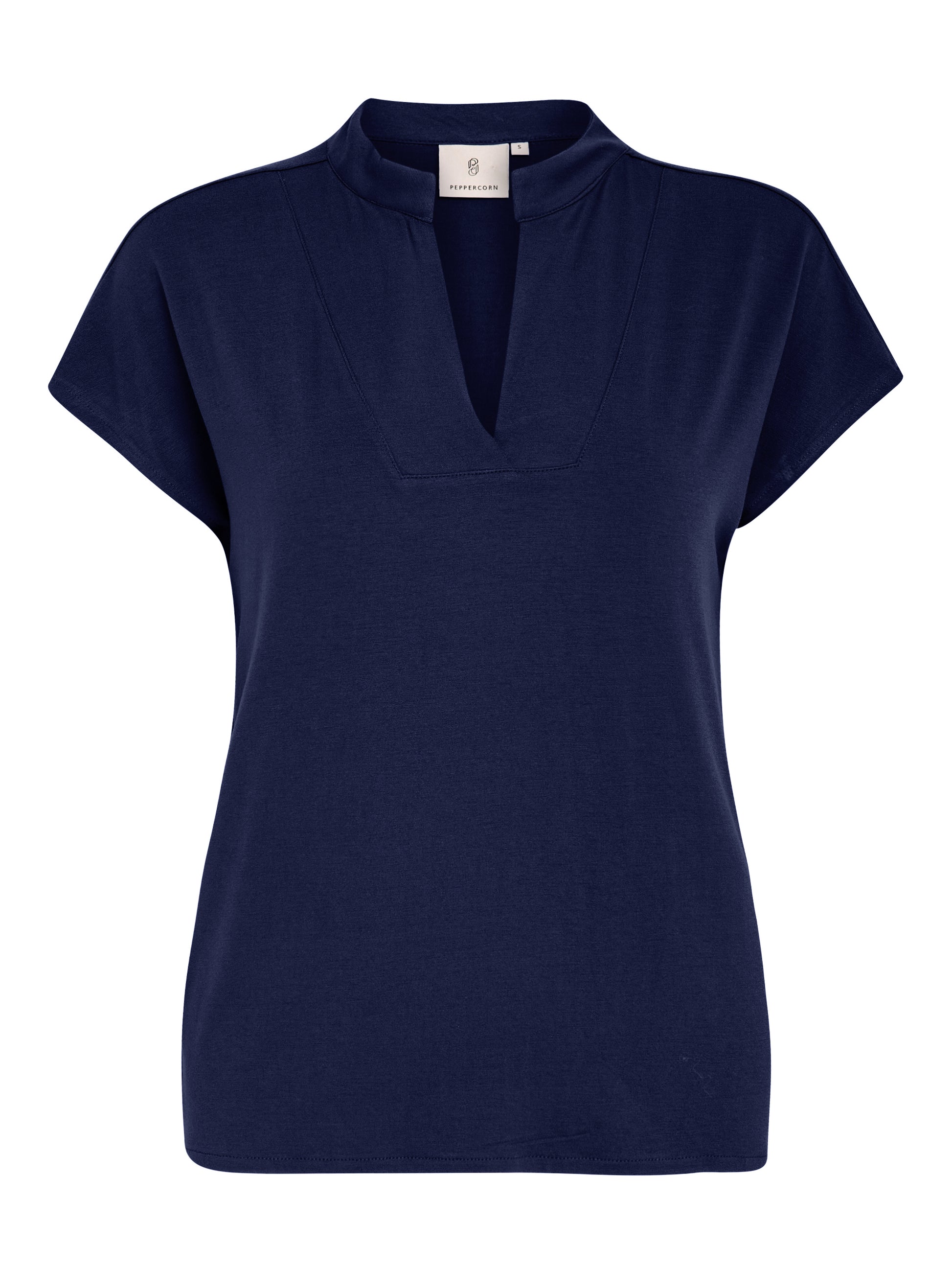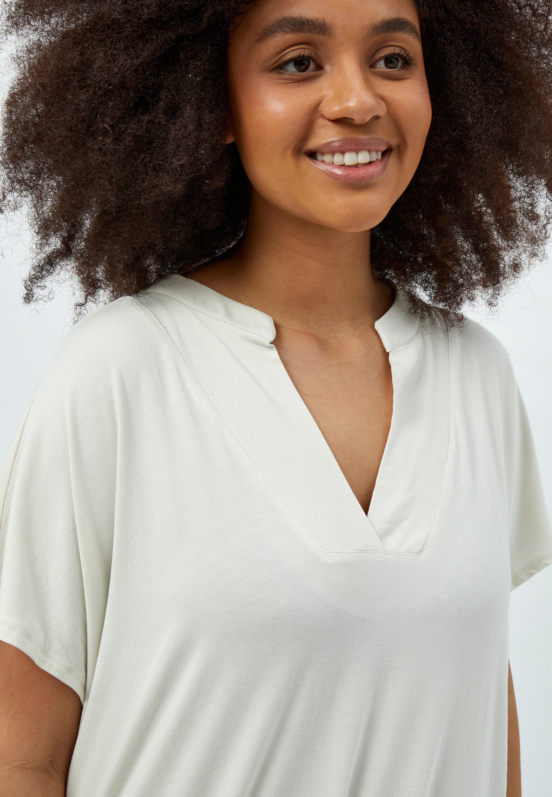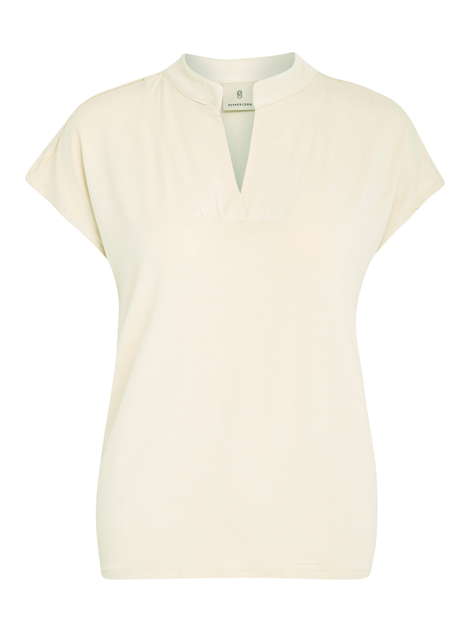 Rosalinda Tee fra Peppercorn er en alsidig T-shirt, der kombinerer komfort med stil. Lavet af 95% LENZING™ ECOVERO™ viskose og 5% elastan, er denne T-shirt både strækbar og super blød, hvilket gør den ideel til hverdagsbrug. Designet inkluderer en elegant mandarin-krave med en V-hals samt korte ærmer, der giver et feminint og moderne look. Tilgængelig i sæsonens farver som Gardenia, Blue Fog, Glazed Ginger, og klassisk sort.
