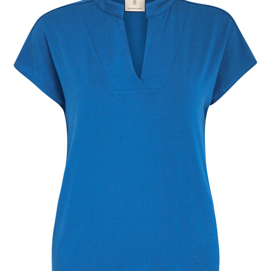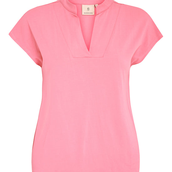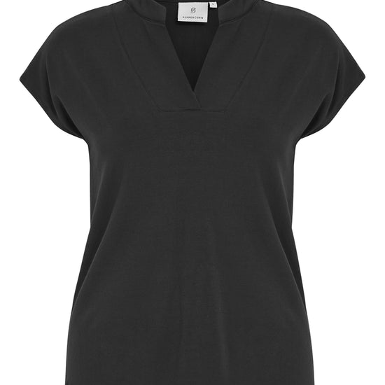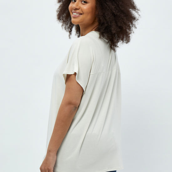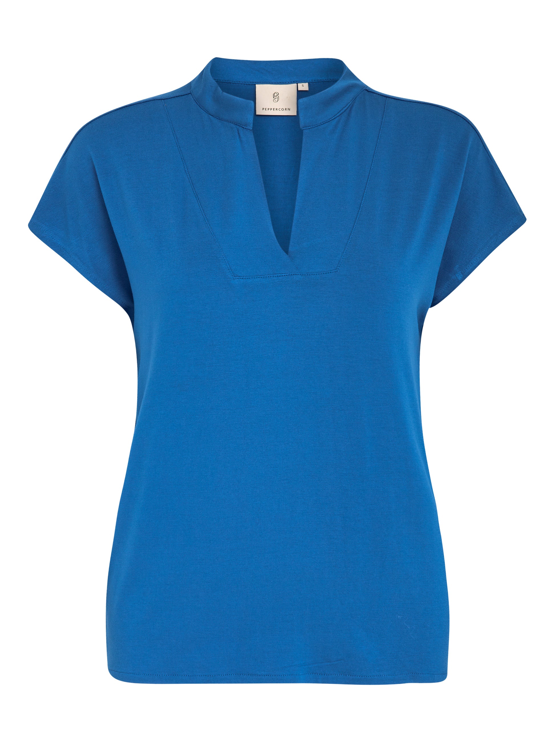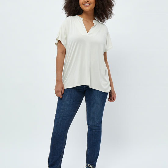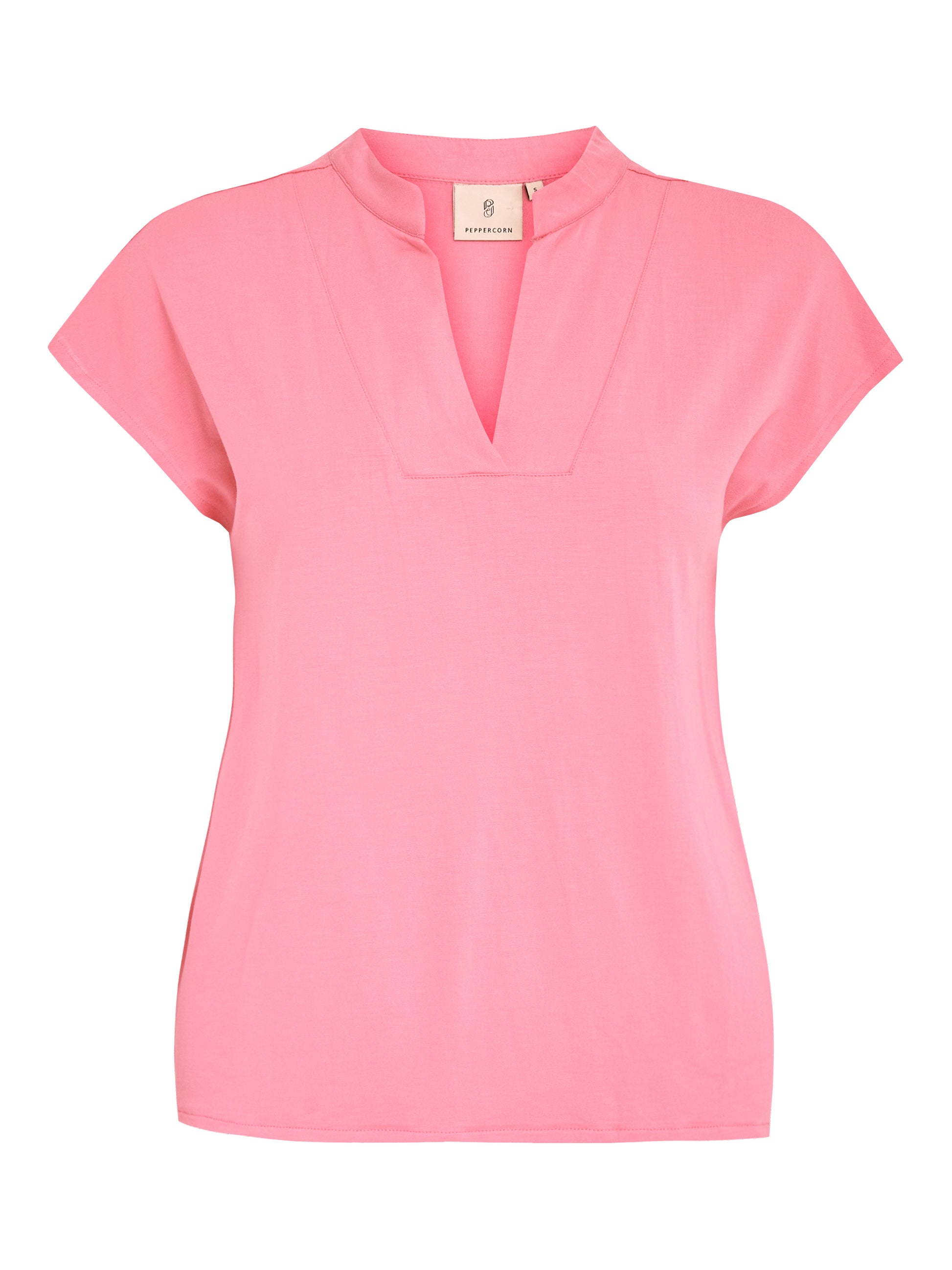 Rosalinda Tee fra Peppercorn er en alsidig T-shirt, der kombinerer komfort med stil. Lavet af 95% LENZING™ ECOVERO™ viskose og 5% elastan, er denne T-shirt både strækbar og super blød, hvilket gør den ideel til hverdagsbrug. Designet inkluderer en elegant mandarin-krave med en V-hals samt korte ærmer, der giver et feminint og moderne look. Tilgængelig i sæsonens farver som Gardenia, Blue Fog, Glazed Ginger, og klassisk sort.