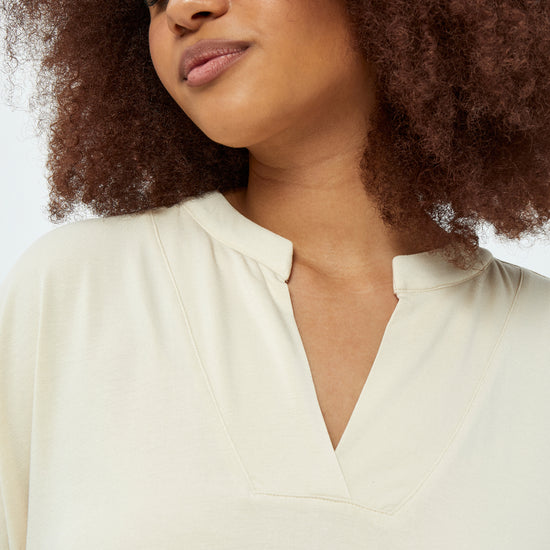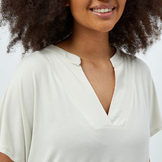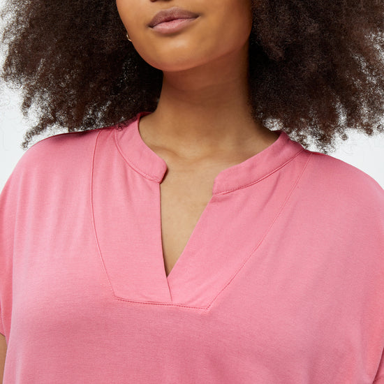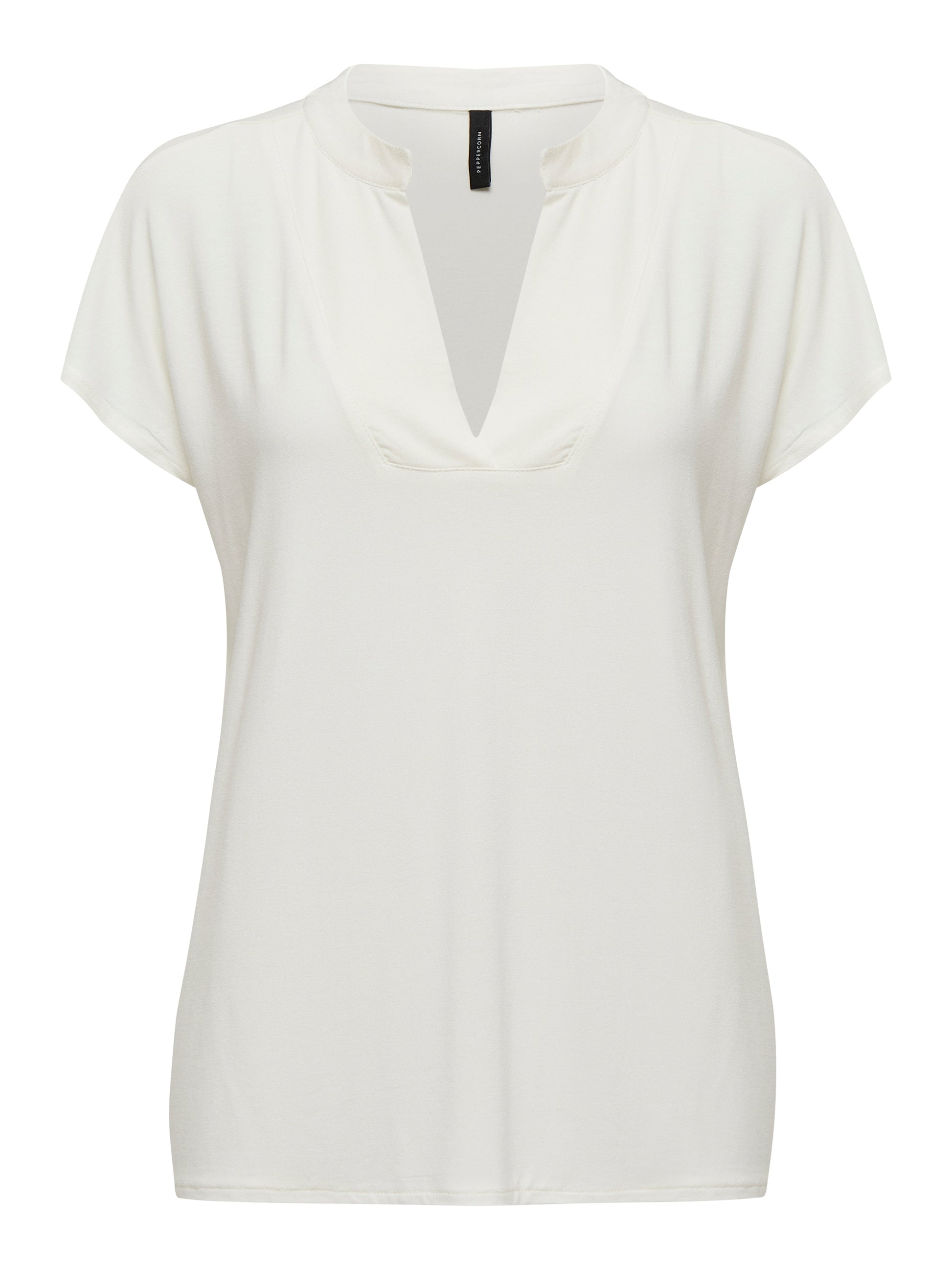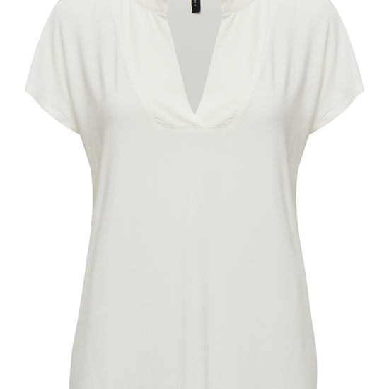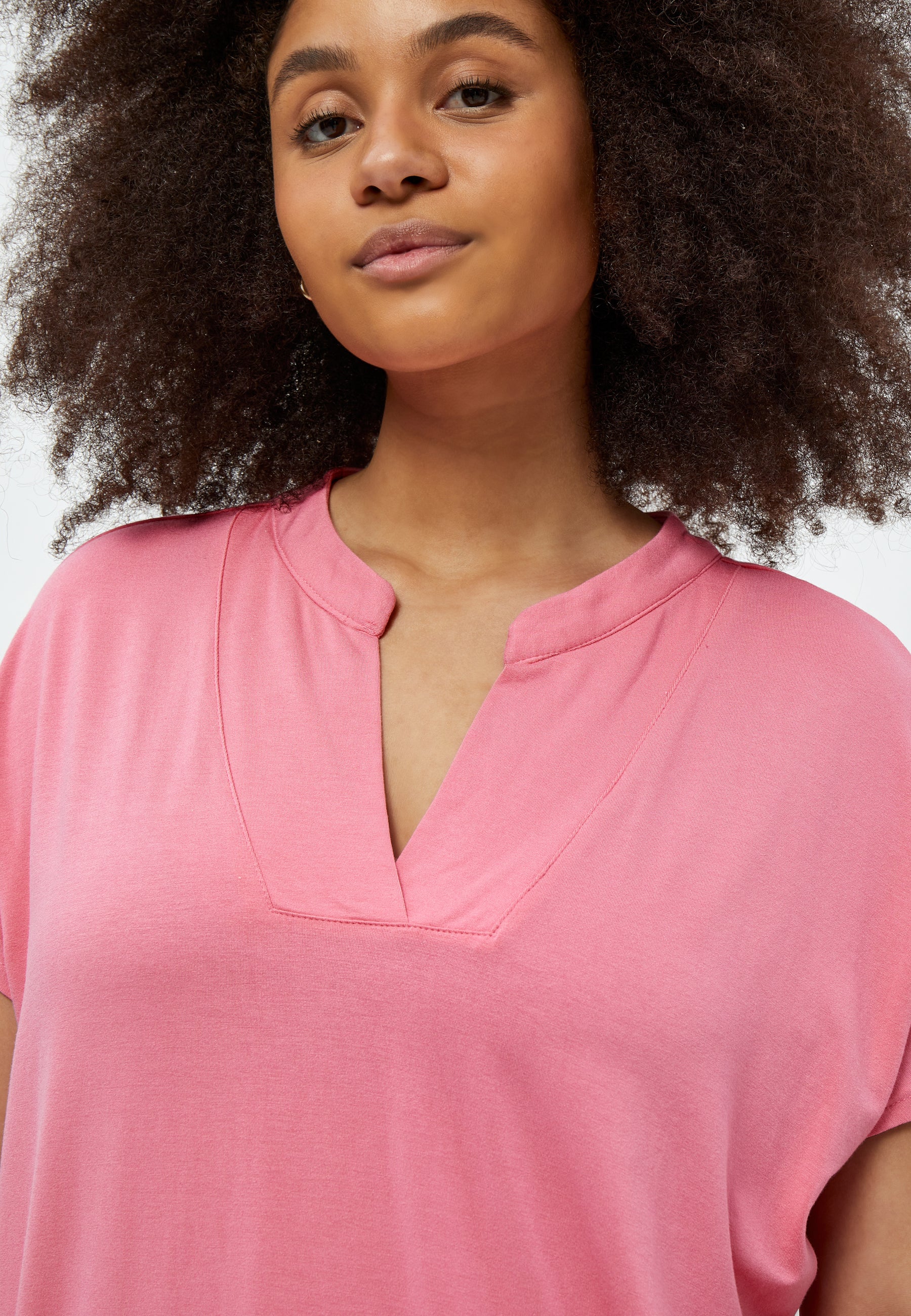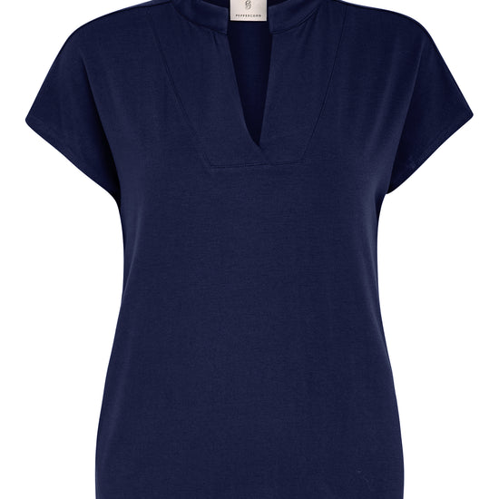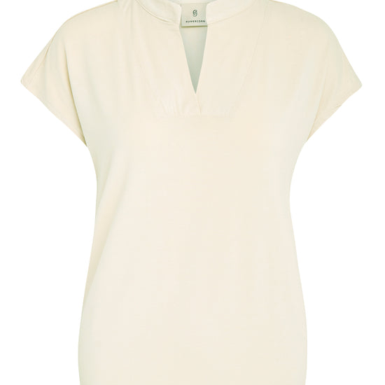Rosalinda Tee fra Peppercorn er en alsidig T-shirt, der kombinerer komfort med stil. Lavet af 95% LENZING™ ECOVERO™ viskose og 5% elastan, er denne T-shirt både strækbar og super blød, hvilket gør den ideel til hverdagsbrug. Designet inkluderer en elegant mandarin-krave med en V-hals samt korte ærmer, der giver et feminint og moderne look. Tilgængelig i sæsonens farver som Gardenia, Blue Fog, Glazed Ginger, og klassisk sort.
