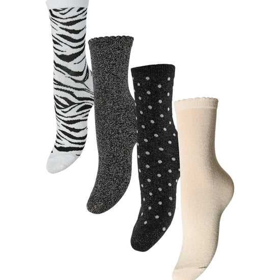 Opgrader din sokkeskuffe med denne 4-pak glimmer strømper fra Pieces. Sættet byder på fire forskellige designs – zebramønster, sort med glimmer, sort med prikker og lys beige – så du får både variation og masser af stil til din hverdag.