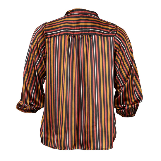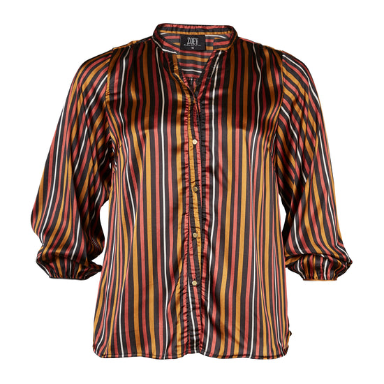 Træd ind i en verden af farver og mønstre med denne stribede skjorte fra ZOEY. Med et strejf af retro, er denne skjorte et must-have for enhver modebevidst kvinde. Med dens levende striber i rød, orange, sort og guld, bliver du centrum for opmærksomhed, uanset hvor du går hen.