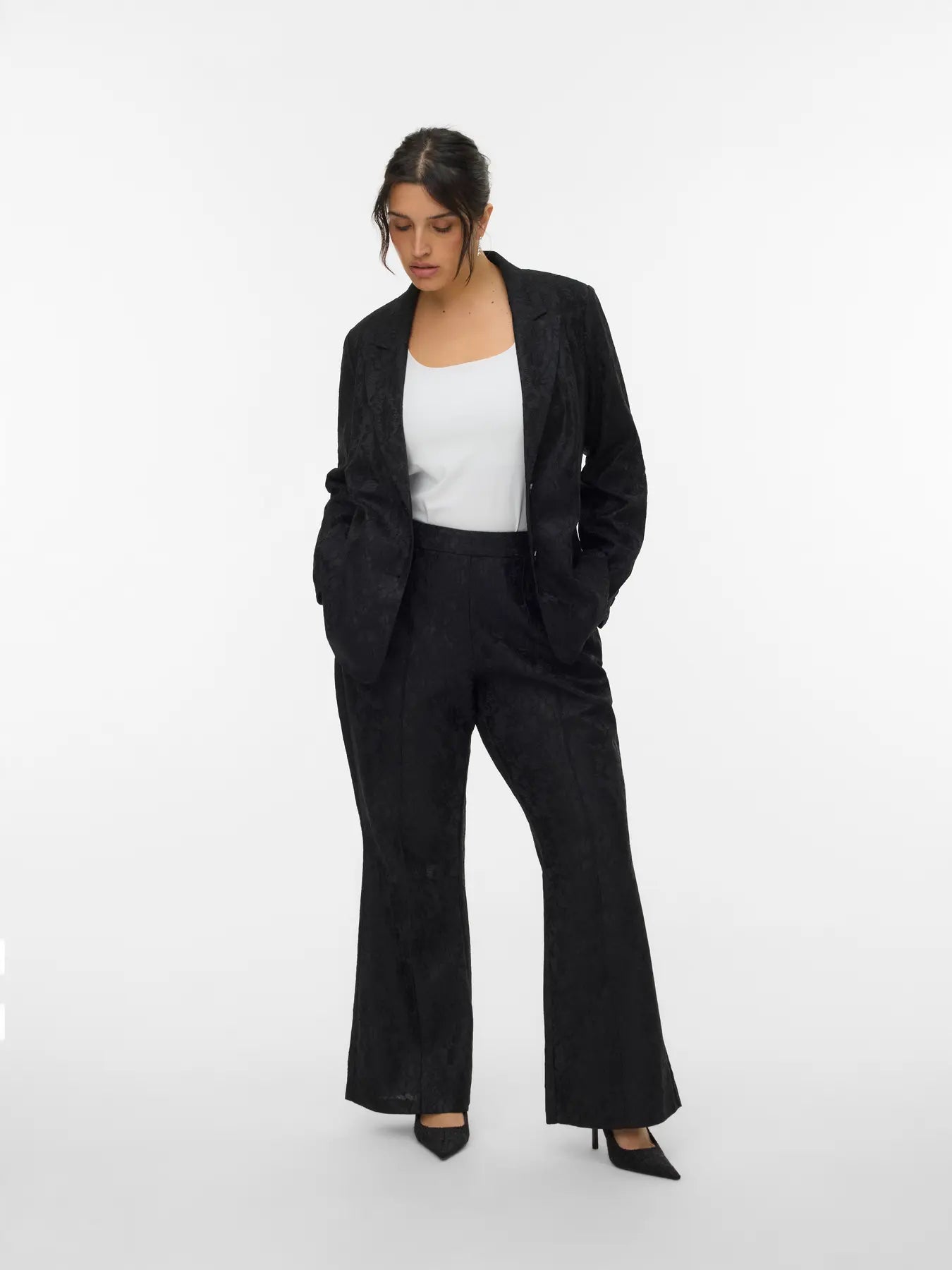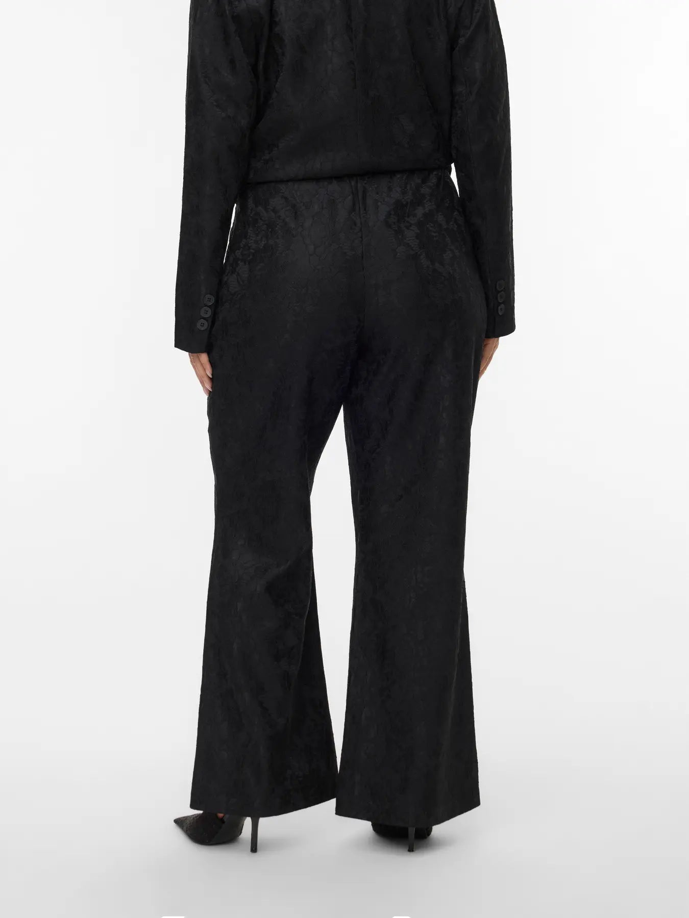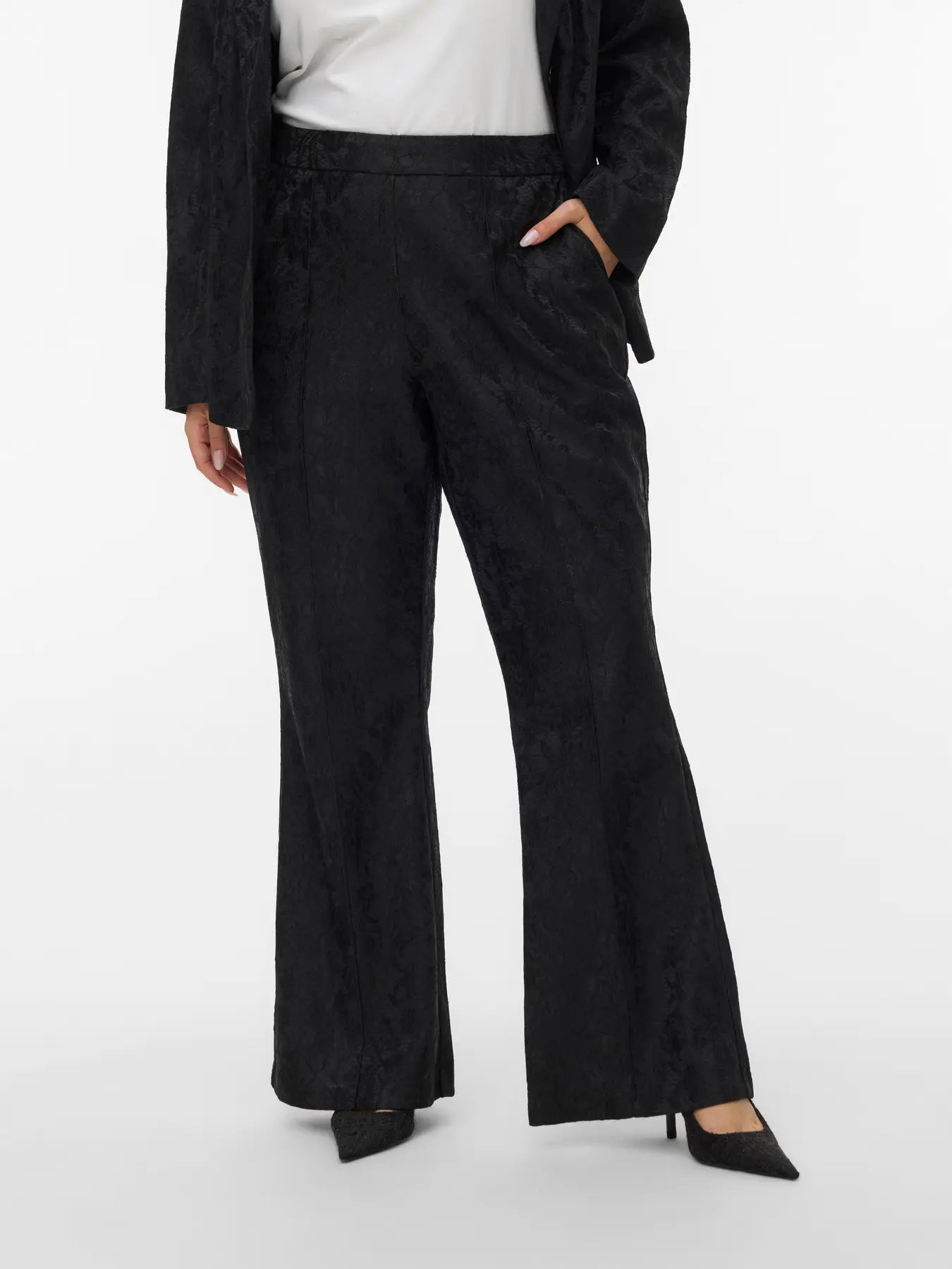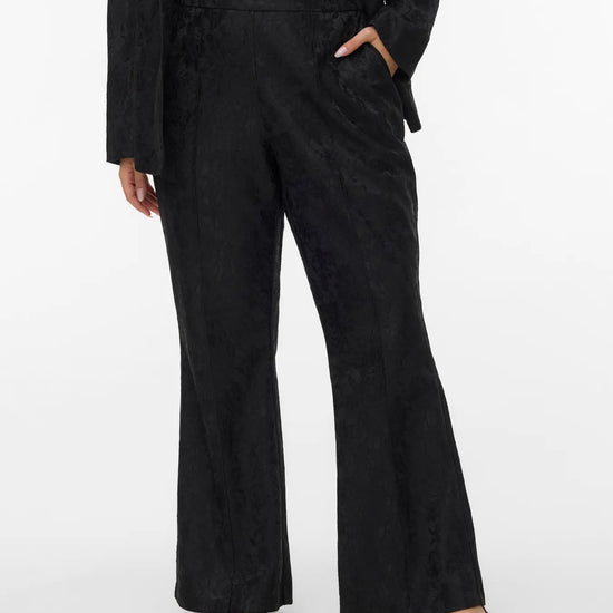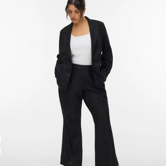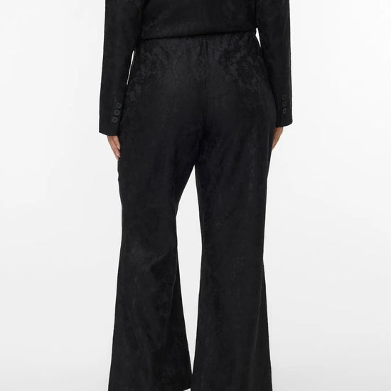 Disse sorte flared bukser fra Vero Moda Curve er skabt til dig, der ønsker et elegant og komfortabelt udtryk. Bukserne har midthøj talje, blonde-detaljer og et let svaj i benene, så du får et flatterende og tidløst look. Den klassiske sorte farve gør dem nemme at style til både hverdag og kontor – prøv dem med en bluse eller en skjorte for et gennemført sæt.