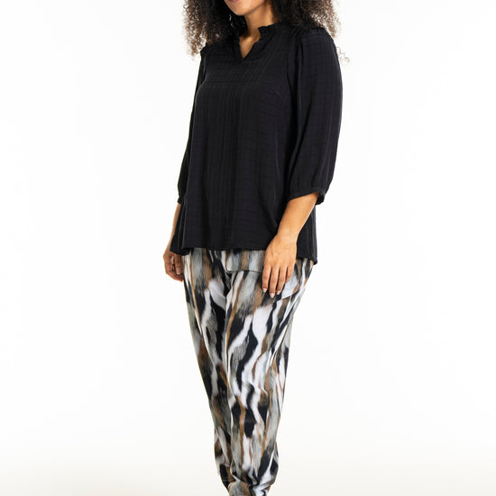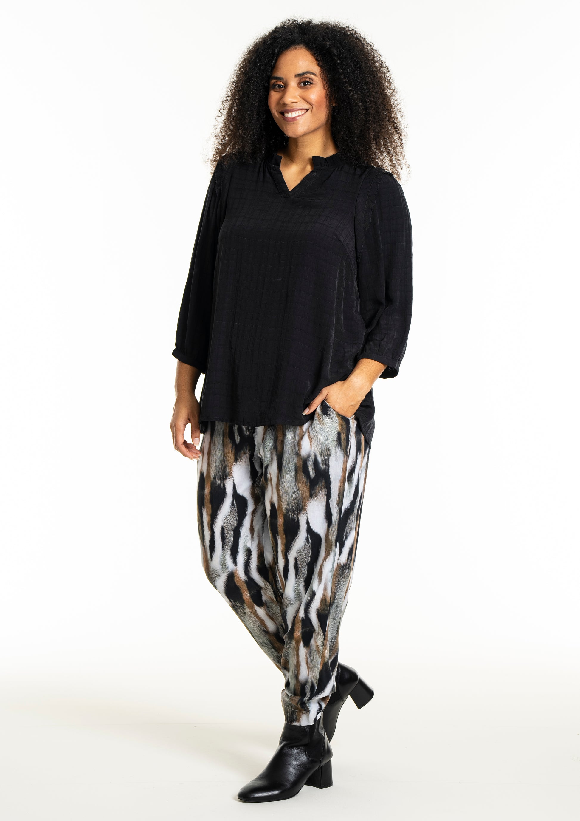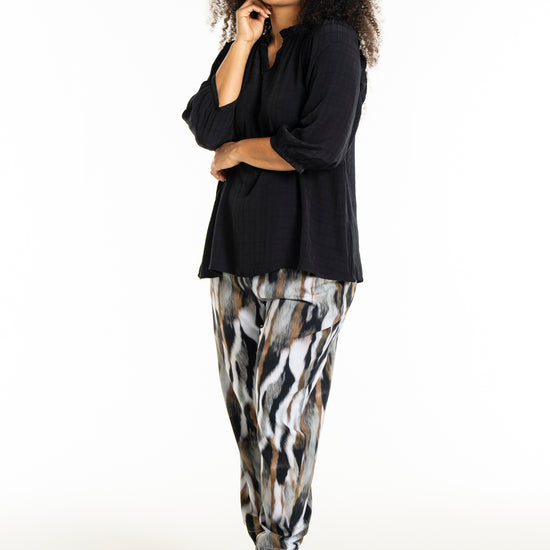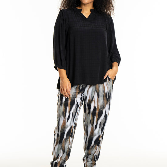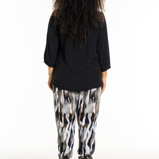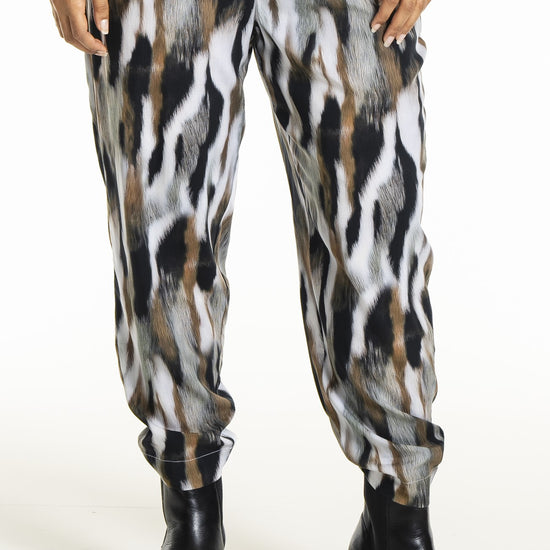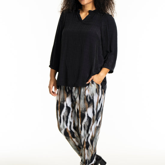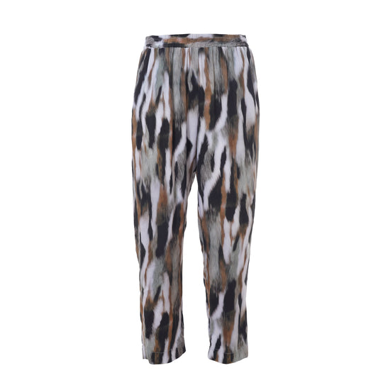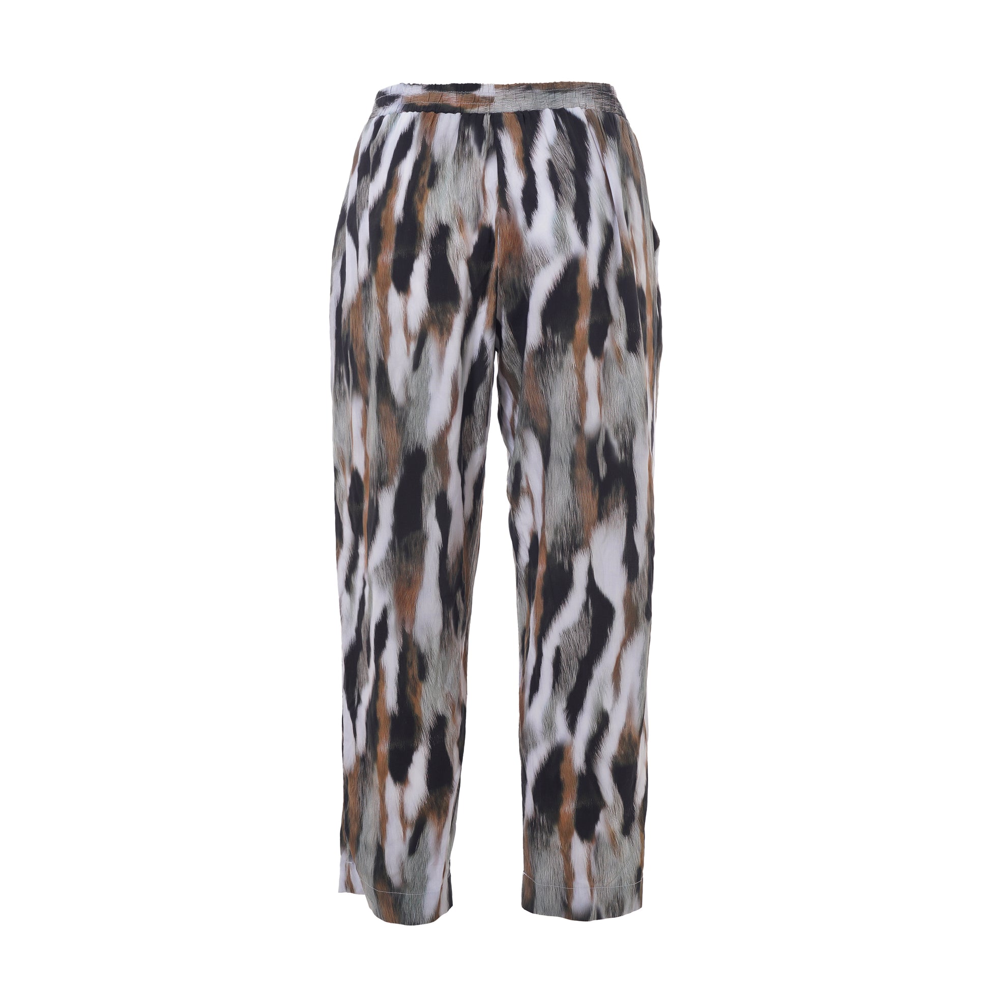 Disse bukser har et iøjnefaldende mønster i sort med grå/sand nuancer, der skaber et dynamisk og moderne udtryk. Den løse pasform gør dem ideelle til både afslappede dage og mere formelle lejligheder, afhængigt af hvordan du styler dem.