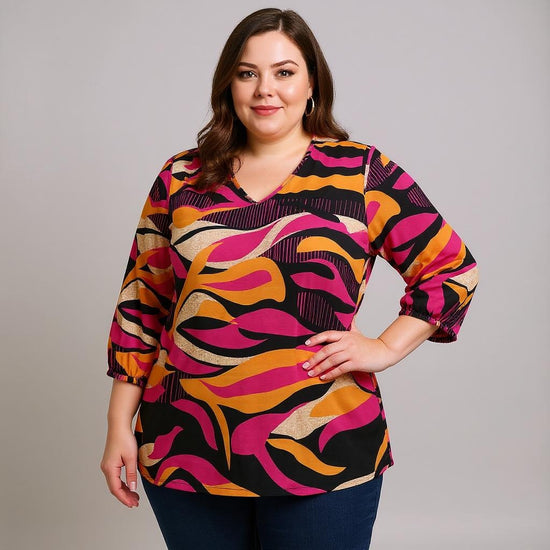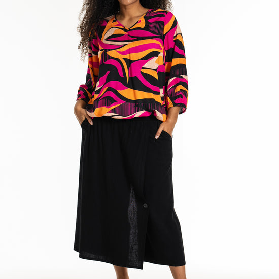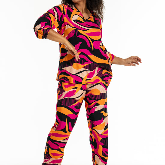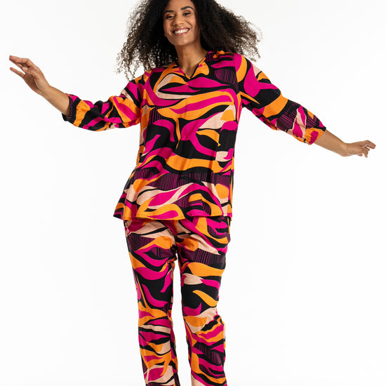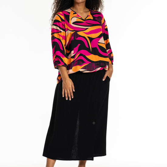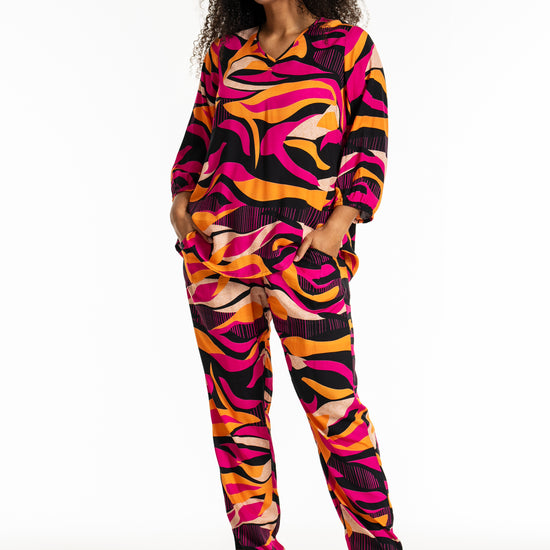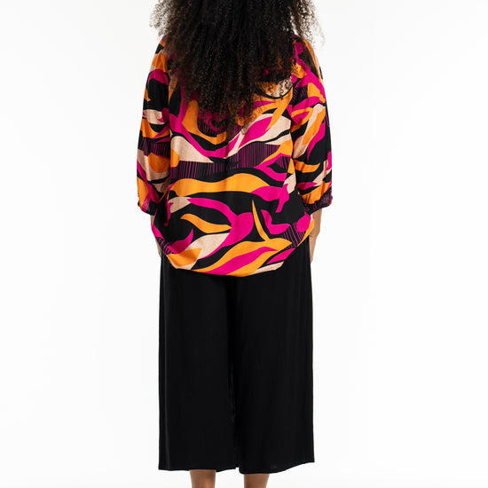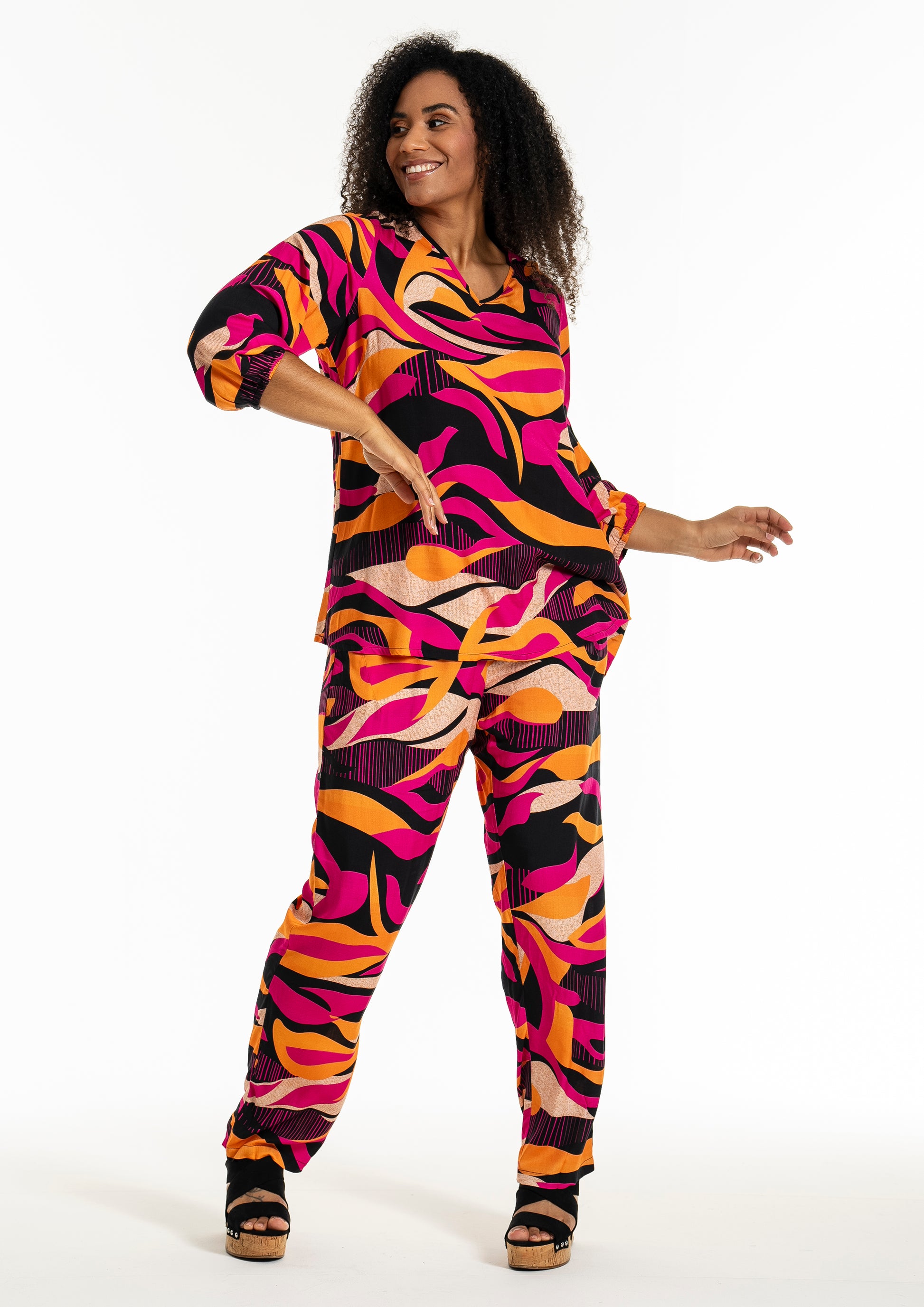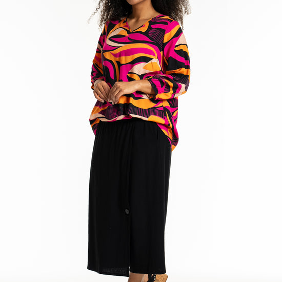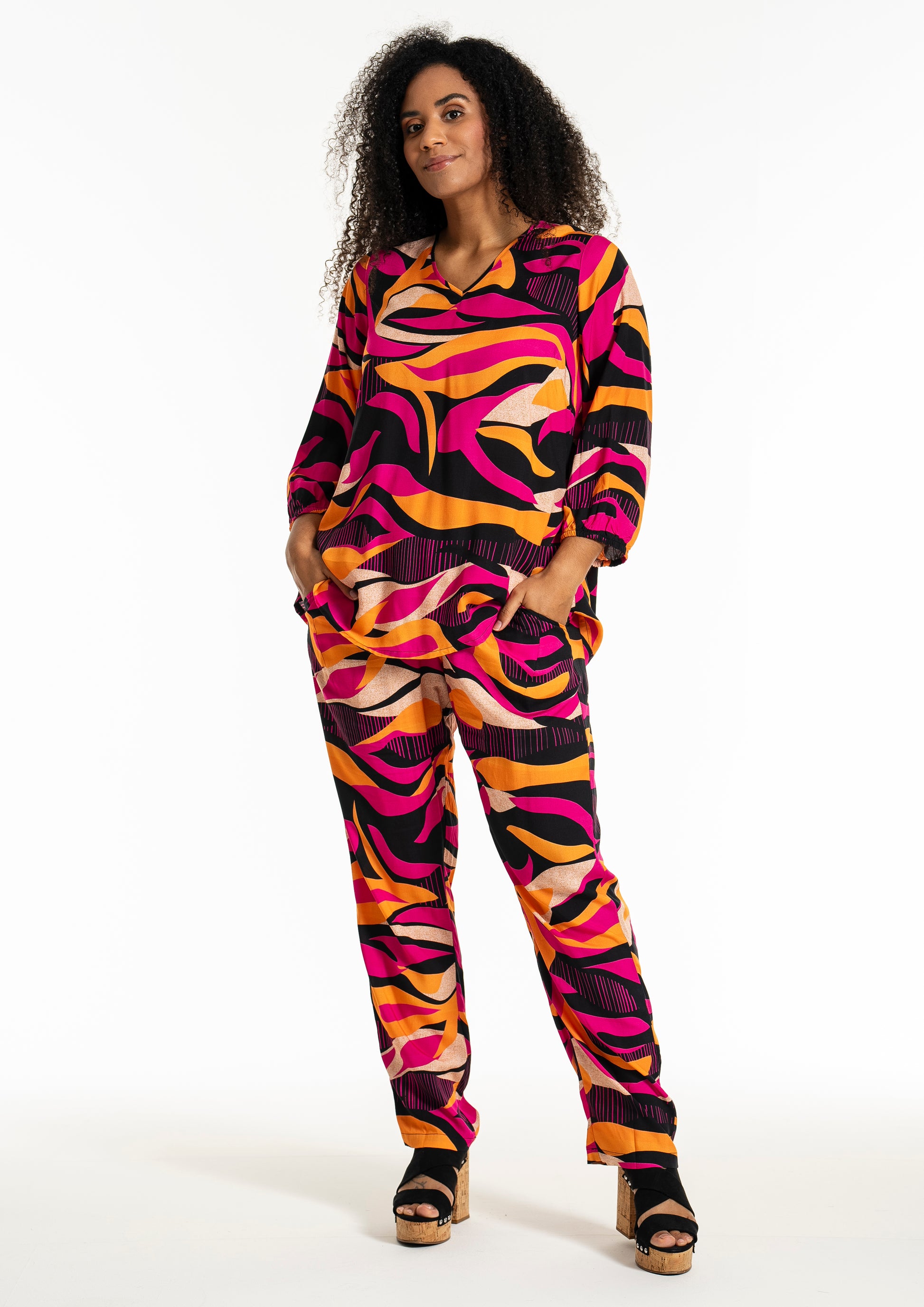 Oplev elegance og komfort med denne smukke bluse fra Studio. Fremstillet i 100% viskose, tilbyder denne bluse en luksuriøs følelse og et let fald, der smigrer enhver kropsform. Det abstrakte print i livlige nuancer af sort, pink og orange skaber et moderne og energisk look, der vil tiltrække opmærksomhed.