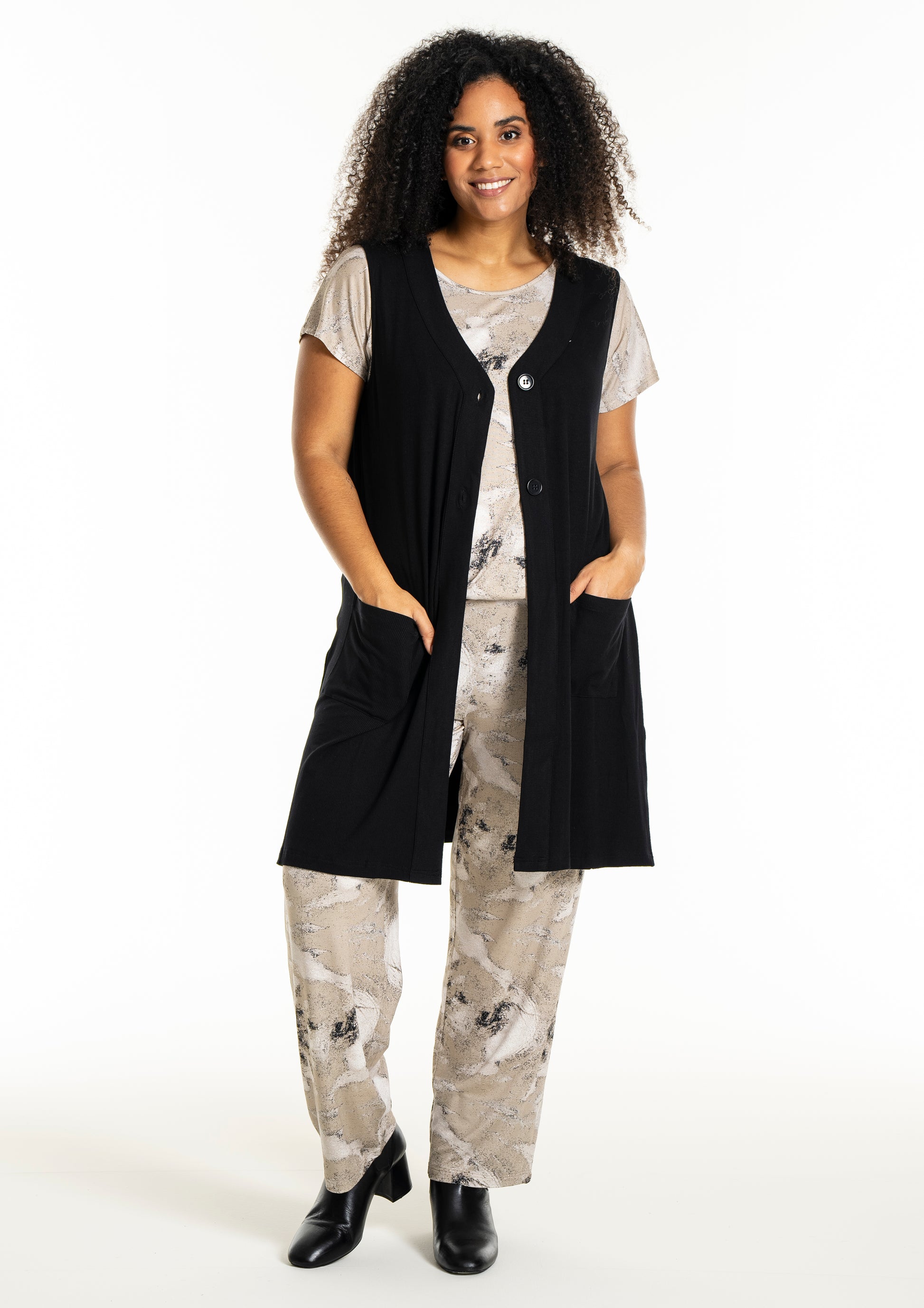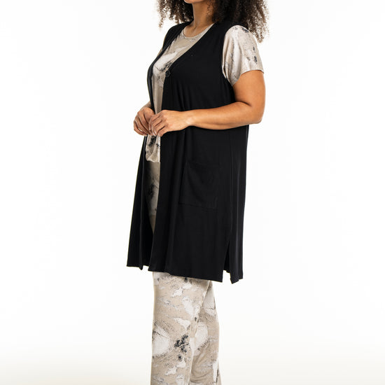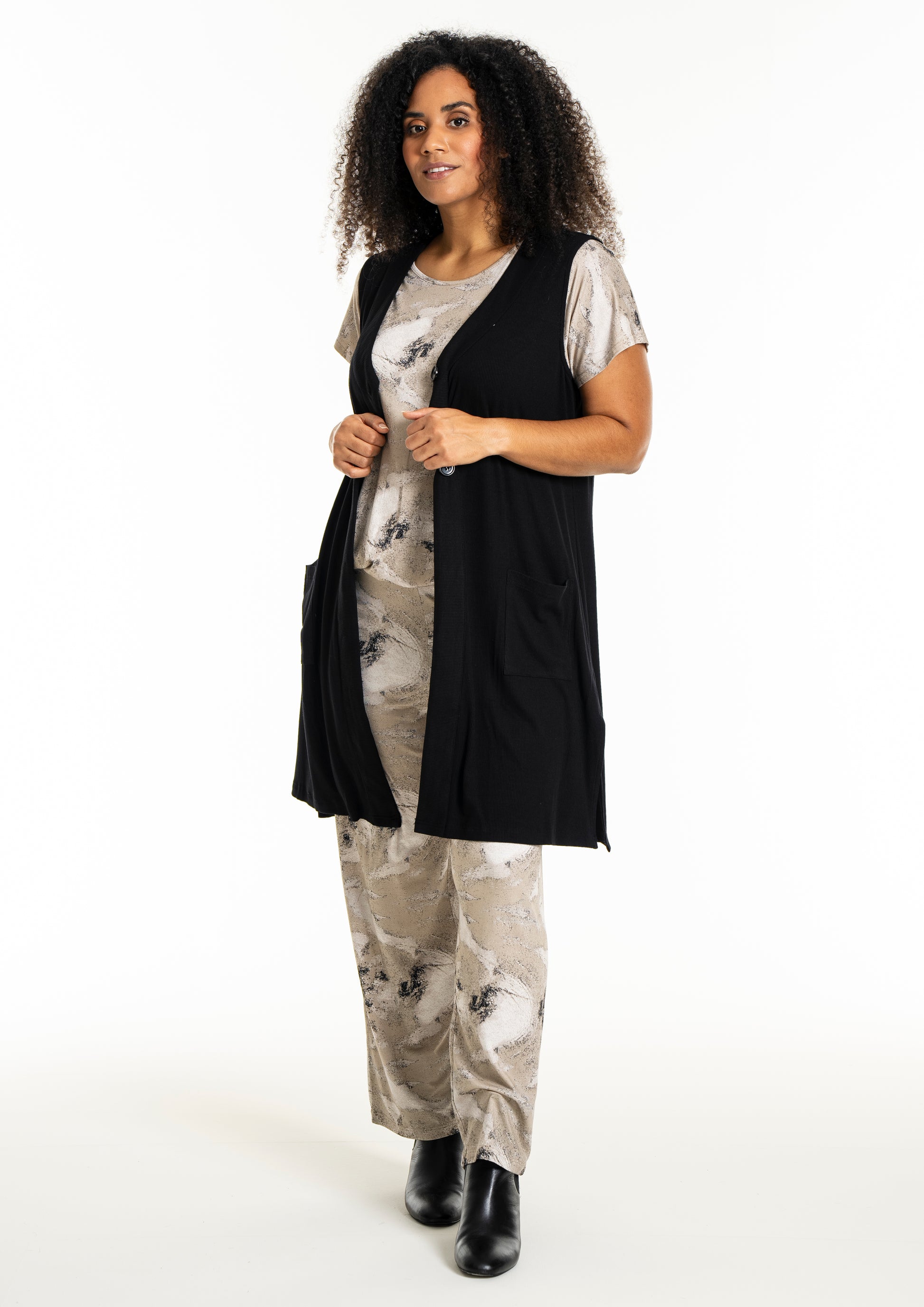Den lange og elegante stil af denne vest giver en forlængende effekt til din silhouet, mens de praktiske lommer foran tilføjer funktionalitet. Den er ideel til lag-på-lag styling, hvilket gør den til en alsidig tilføjelse til din garderobe. Oplev mere af vores udvalg af veste og overtøj for at finde den perfekte kombination til din stil.