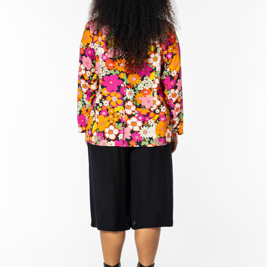 - Farverigt blomstermønster i orange og pink på sort baggrund