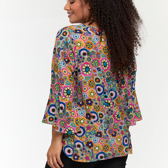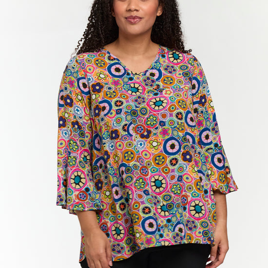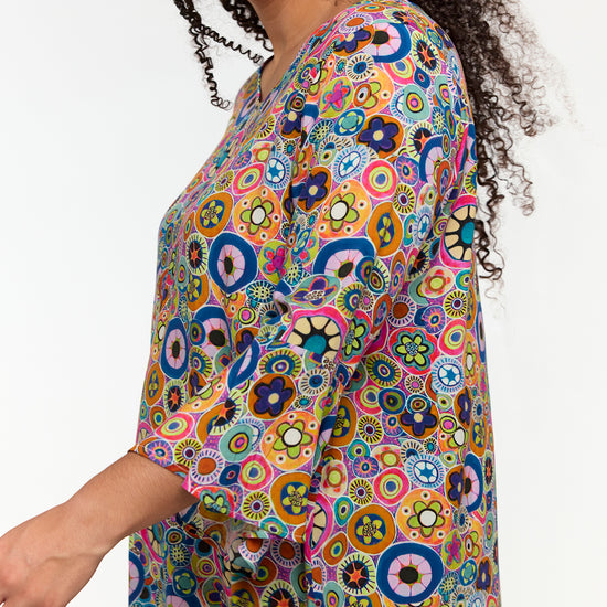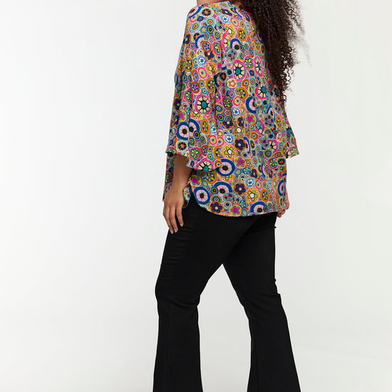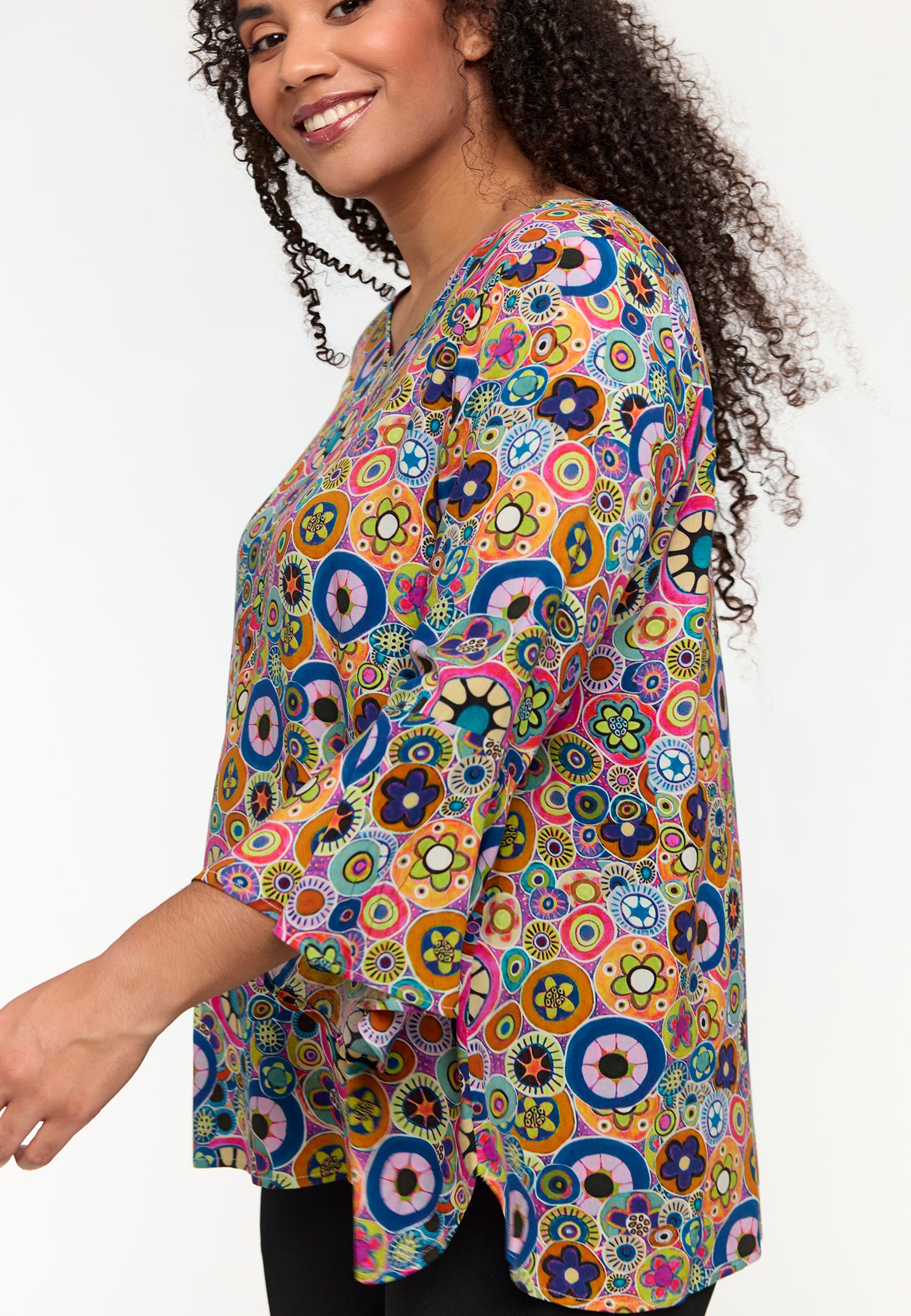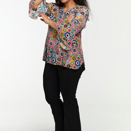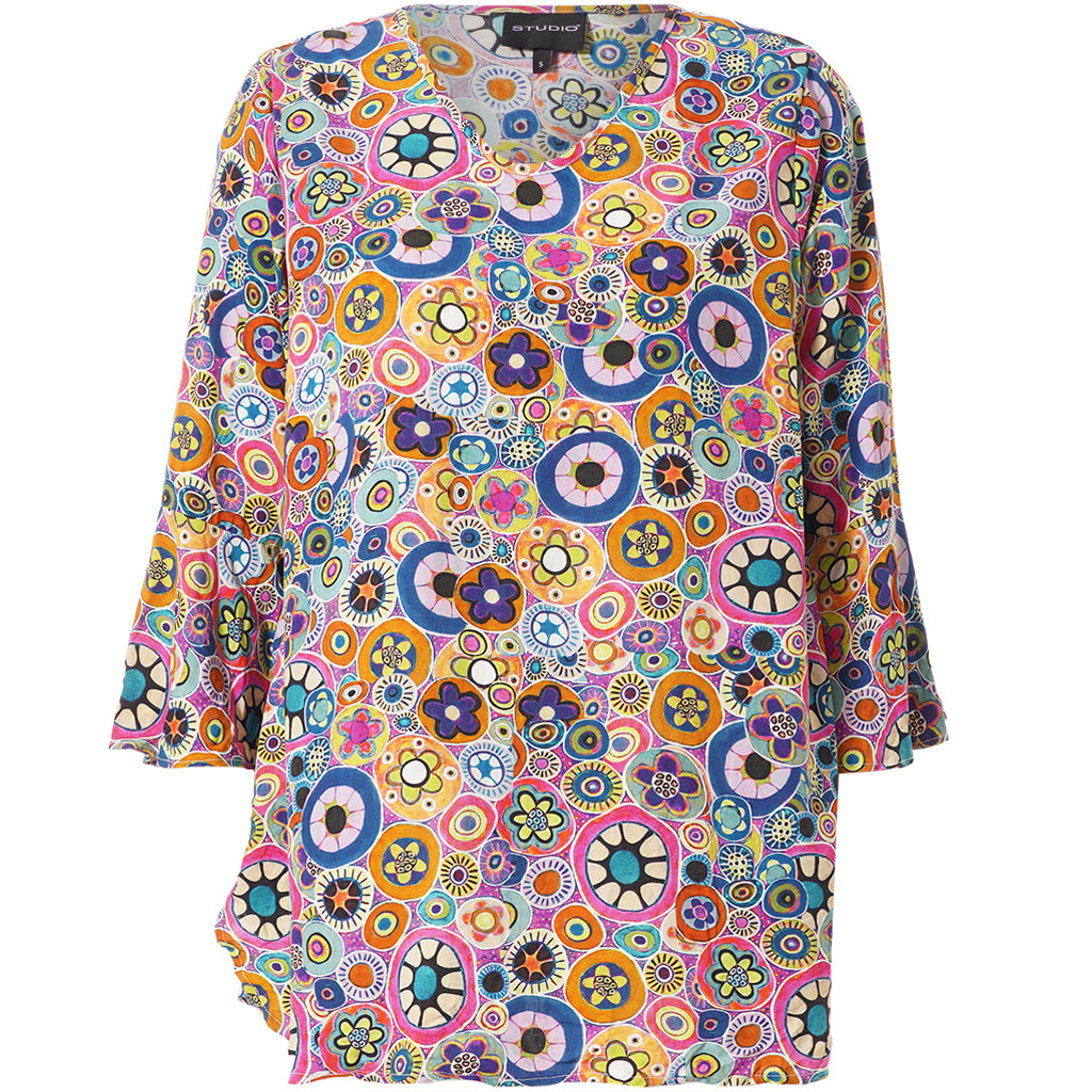 Leder du efter en bluse, der kombinerer komfort og stil? Denne smukke bluse fra Studio er syet i 100% viskose og prydet med et livligt cirkel multi-color print i blå, pink, grønne og hvide nuancer. Den løse, let A-formede silhuet og det bløde materiale giver dig et afslappet, men feminint udtryk.