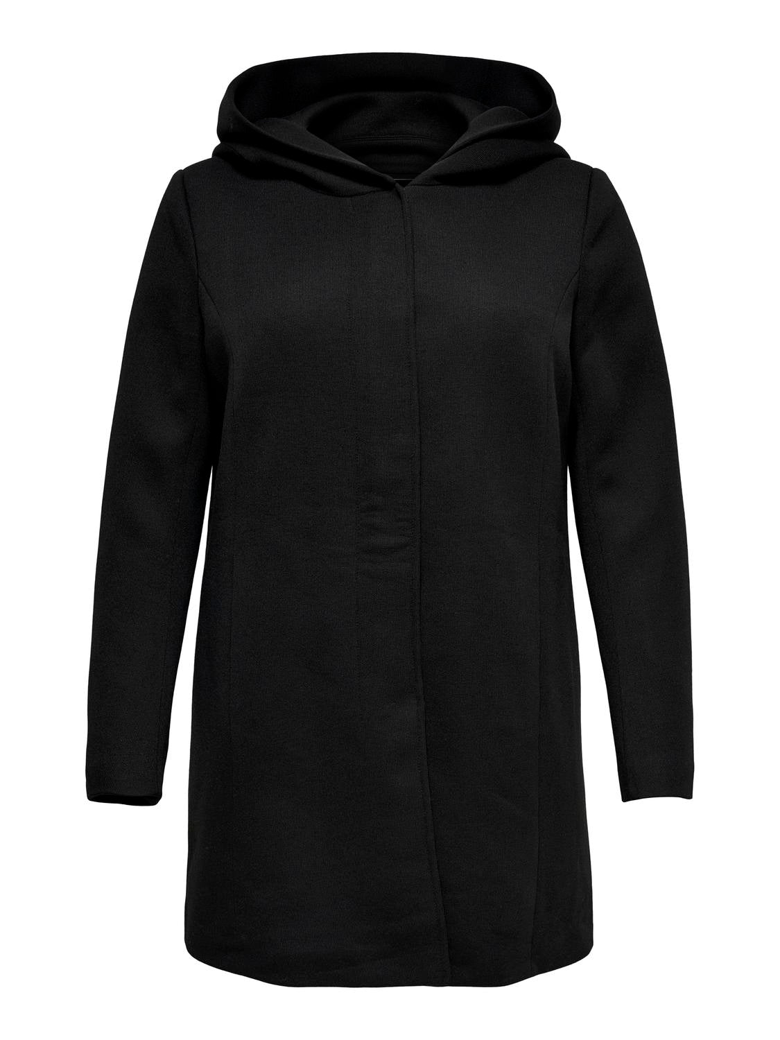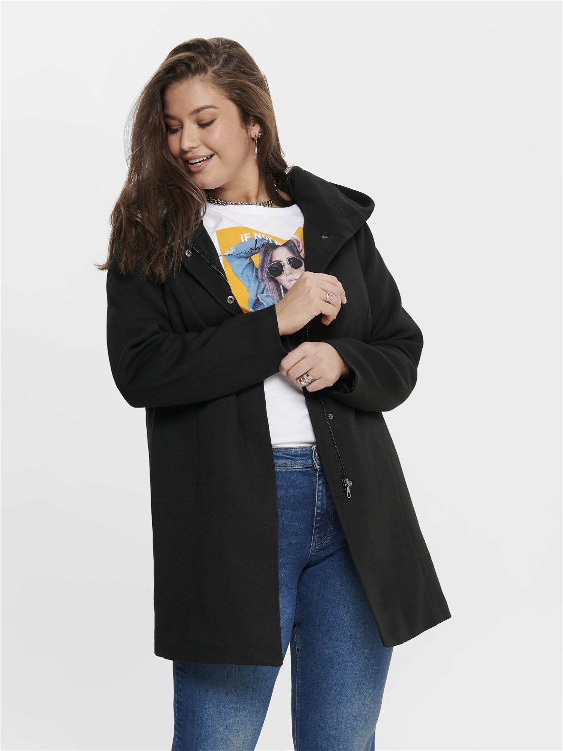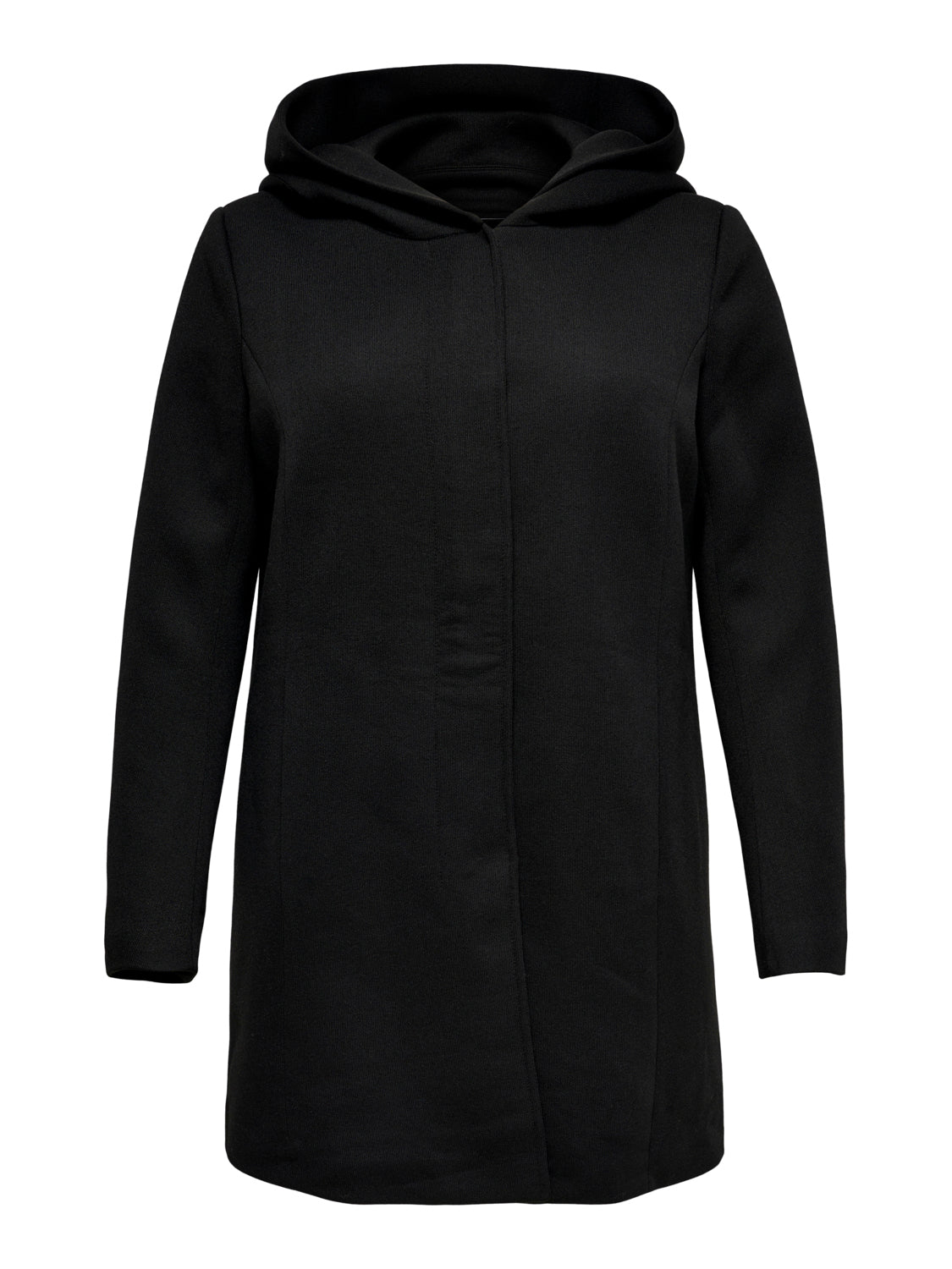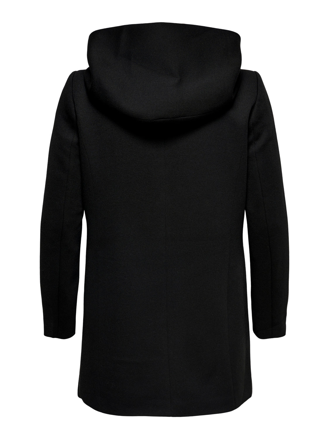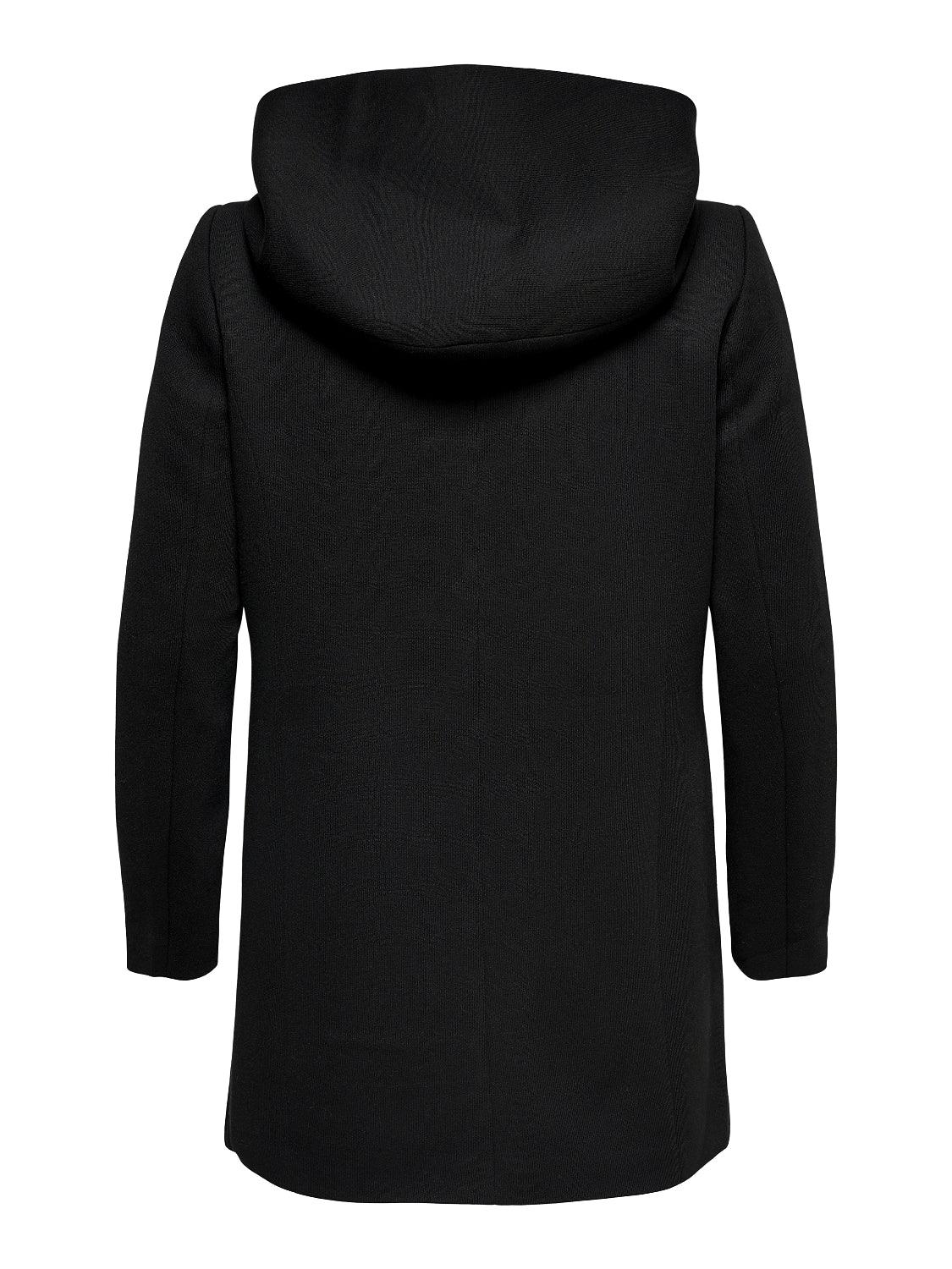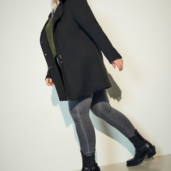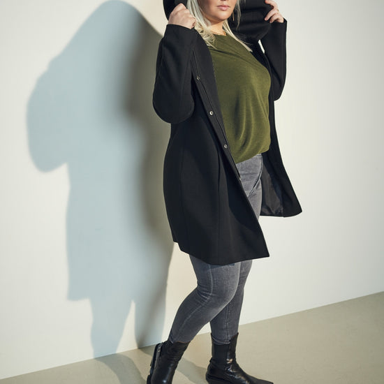 Frakke med skjult lynlås og knaplukning foran. Prinsessesnit foran og bagpå. 2 sidelommer.