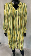 Designet kombinerer nuancer af blå, grøn og gul i et abstrakt mønster, hvilket skaber et livligt og iøjnefaldende look. Denne kjole er perfekt til dig, der ønsker at udstråle stil og selvtillid i enhver situation. Se vores udvalg af plus size kjoler og find flere fantastiske designs.