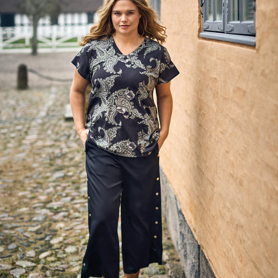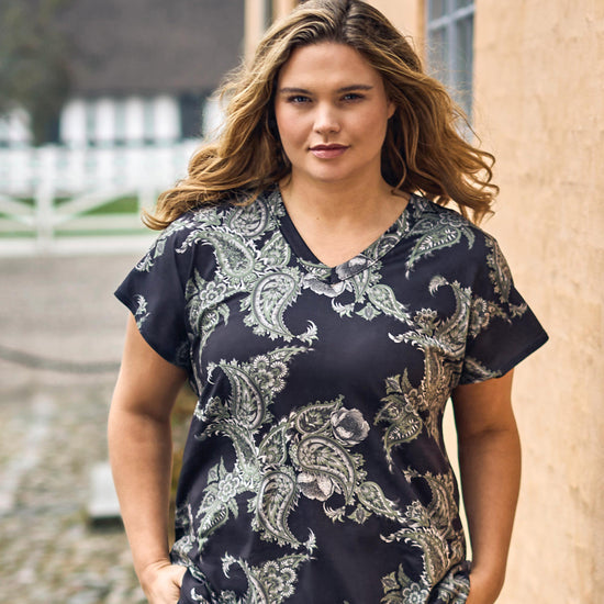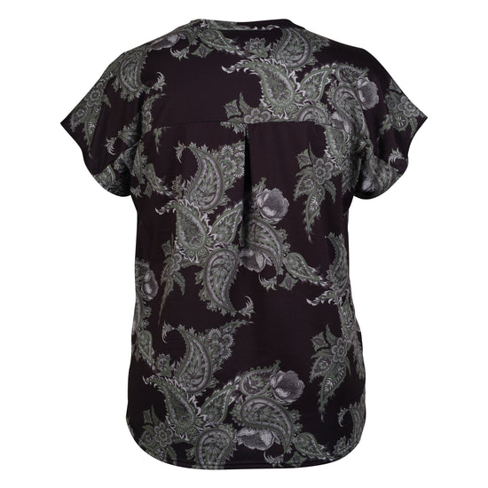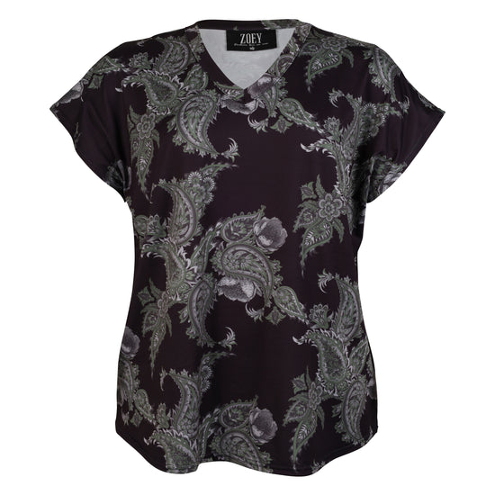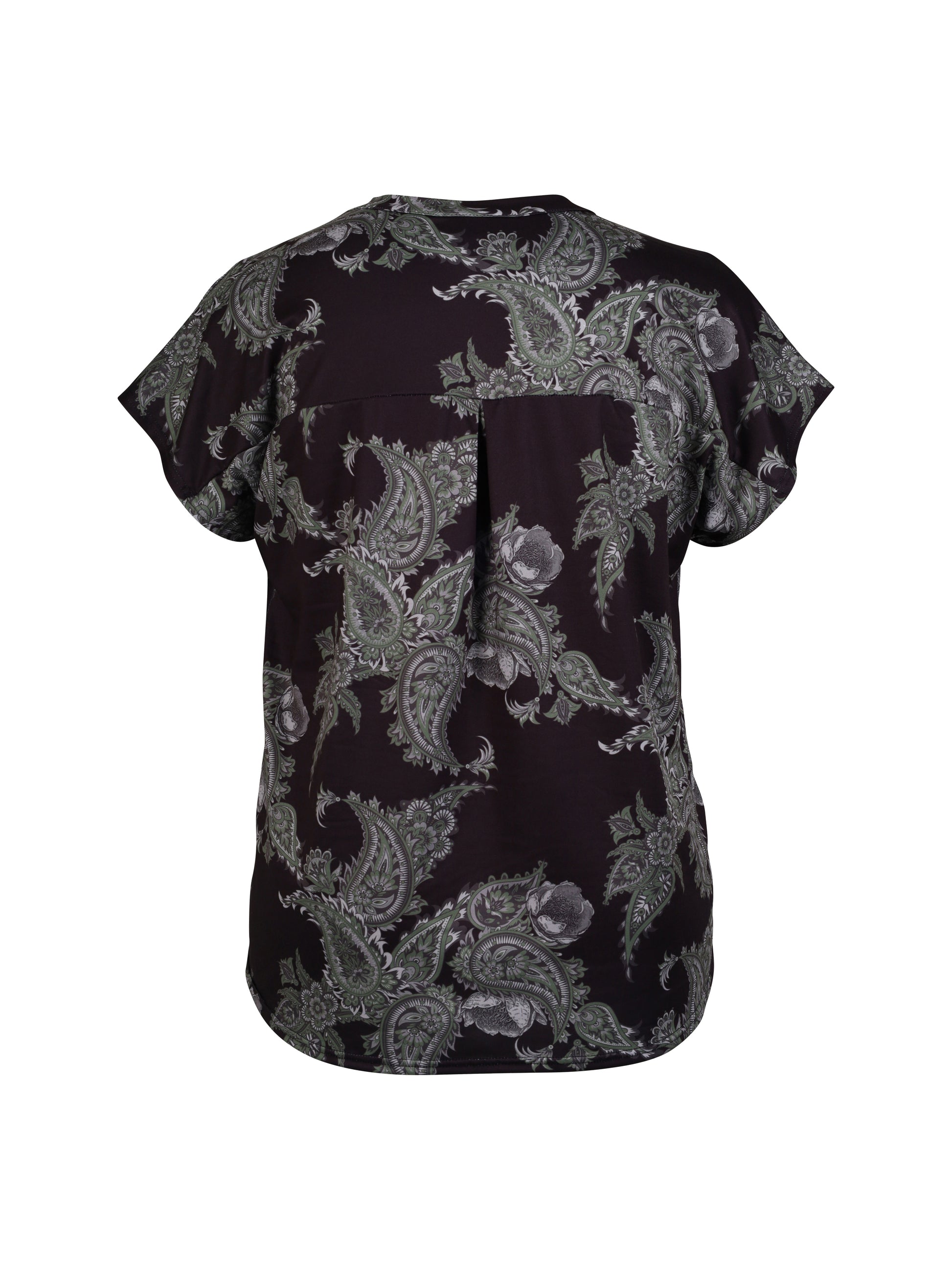 Denne bluse fra ZOEY kombinerer komfort og elegance på smukkeste vis. Den er lavet i en blød kvalitet med 96% viskose og 4% elastan, hvilket giver en let strækbar og behagelig pasform. Det flotte paisley-inspirerede mønster i mørkegrønne og lyse toner giver et eksklusivt og moderne udtryk, mens den feminine V-hals og korte, løstsiddende ærmer fremhæver det afslappede look.