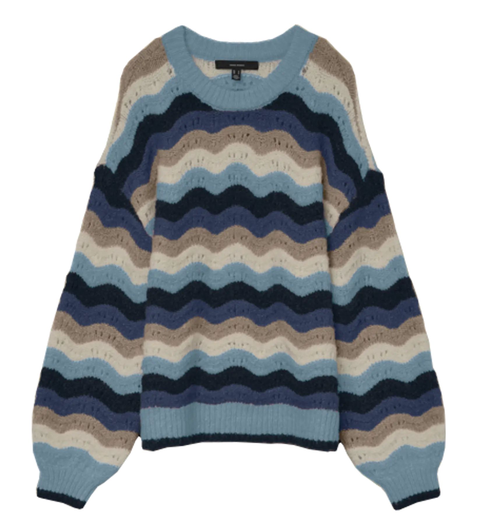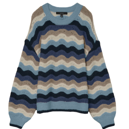 Giv din garderobe et frisk pust med denne o-neck pullover fra Vero Moda Curve. Den har et smukt bølgemønster i blå, beige og navy nuancer, der tilføjer et moderne og iøjnefaldende udtryk. Den afslappede pasform, dropped shoulders og ribkantede ærmer giver dig både komfort og stil til alle hverdagens anledninger.
