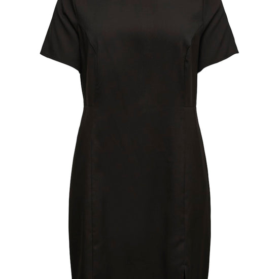 Gør indtryk med denne elegante sorte mini kjole fra Vero Moda Curve. Kjolen har et klassisk, figursyet Slim Fit, der fremhæver dine former på smukkeste vis. En rund halsudskæring, korte ærmer og en diskret sideslids giver et moderne og feminint udtryk – perfekt til både fest, forretningsmøder og aftenarrangementer.