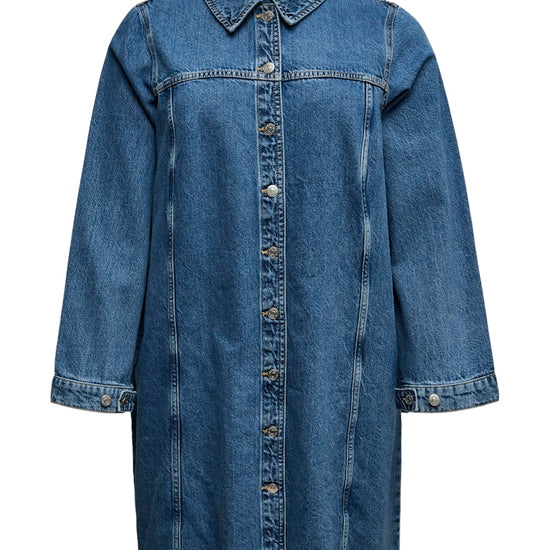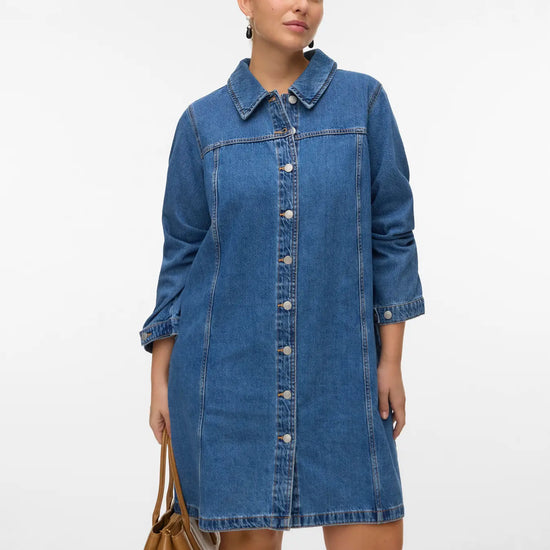 Skab et stilrent og afslappet udtryk med denne korte denimkjole fra Vero Moda Curve. Kjolen har en klassisk skjortekrave, gennemgående knaplukning og lange ærmer, hvilket giver dig et afslappet fit, der passer perfekt til både hverdag og festlige lejligheder. Den medium blå denimfarve gør kjolen let at matche med resten af din garderobe.