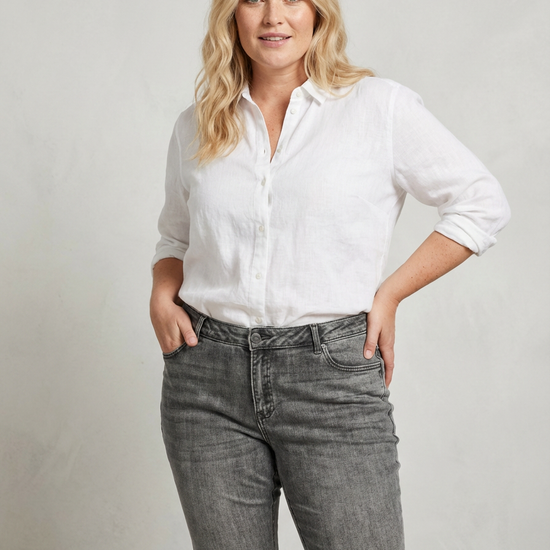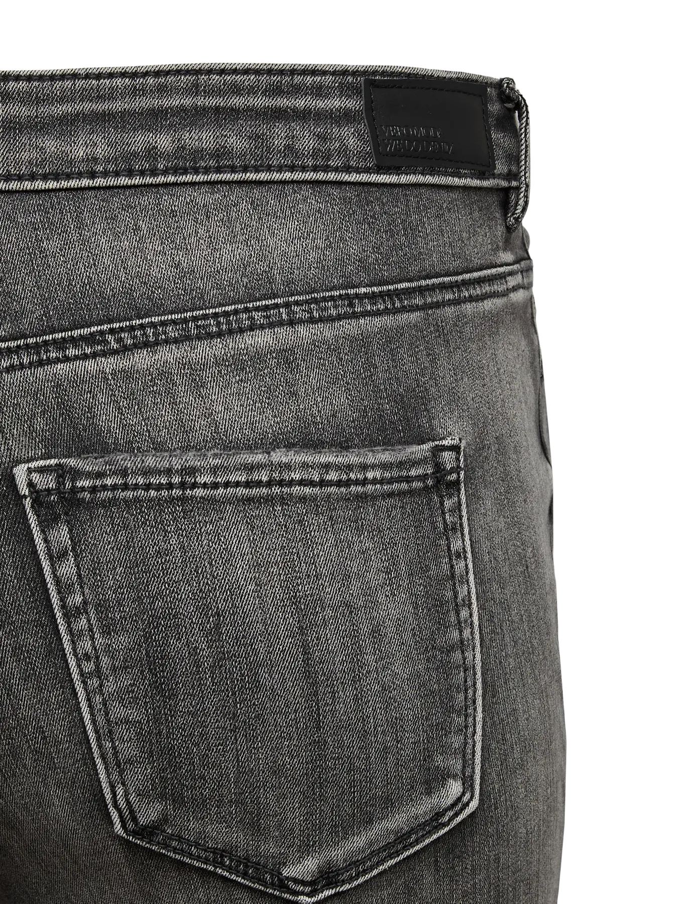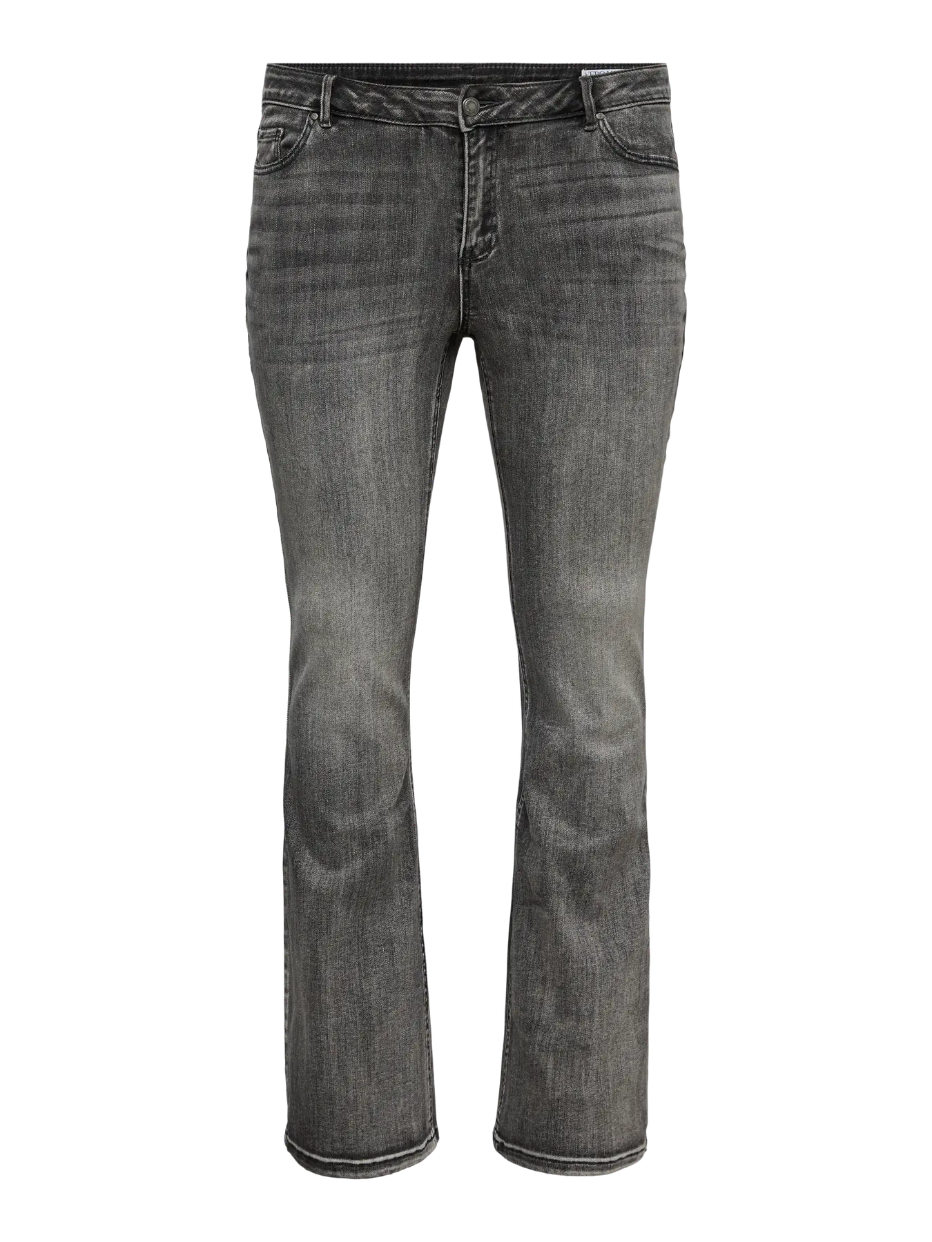 Med disse jeans fra Vero Moda Curve får du et par bukser, der kombinerer et råt look med en feminin silhuet. Den grå denimkvalitet har en tydelig stone-washed effekt på lår og knæ, hvilket giver dybde og struktur til farven. Bukserne har en klassisk linning med bæltestropper samt lukning med knap og lynlås foran.