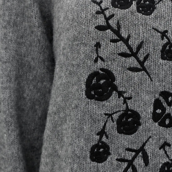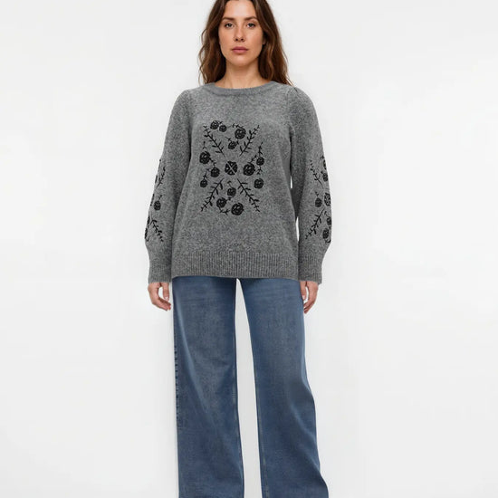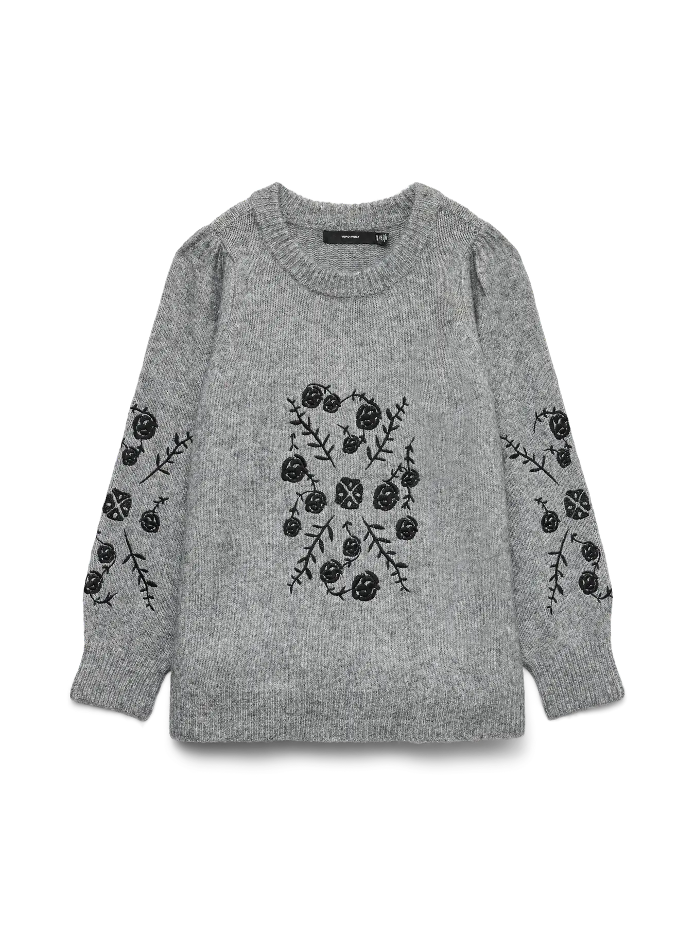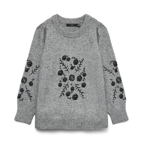 Få et feminint og moderne udtryk med denne grå strikbluse fra Vero Moda Curve. Blusen er dekoreret med elegante sorte blomsterbroderier på både forside og ærmer, hvilket gør den til et perfekt valg til dig, der ønsker lidt ekstra detaljer i hverdagen.