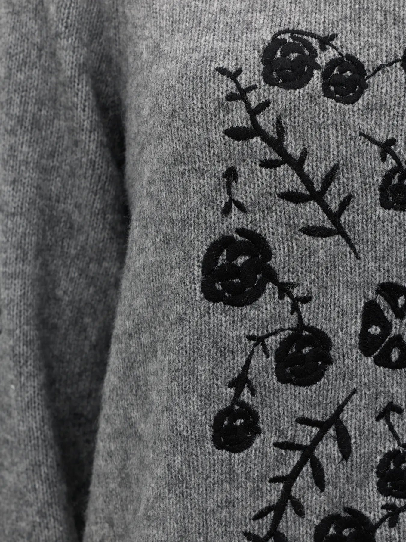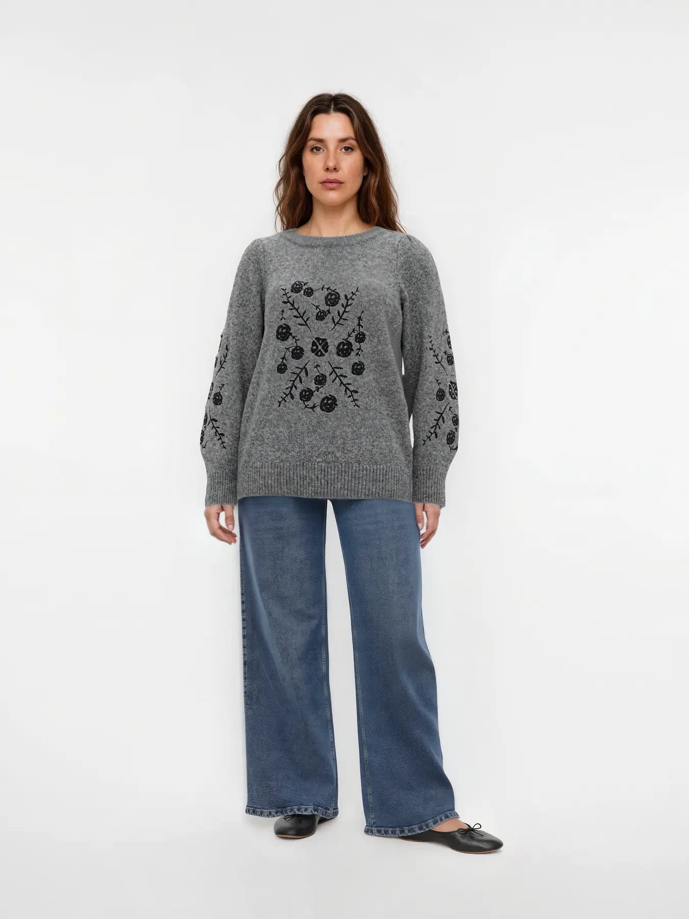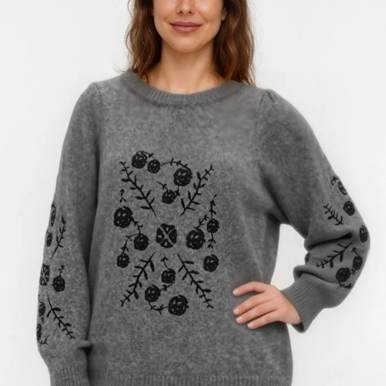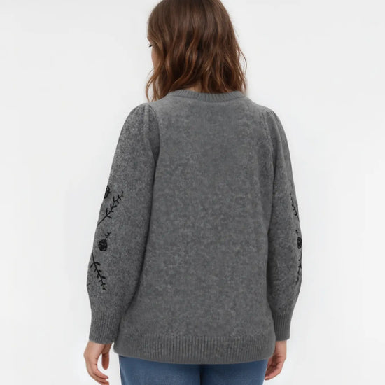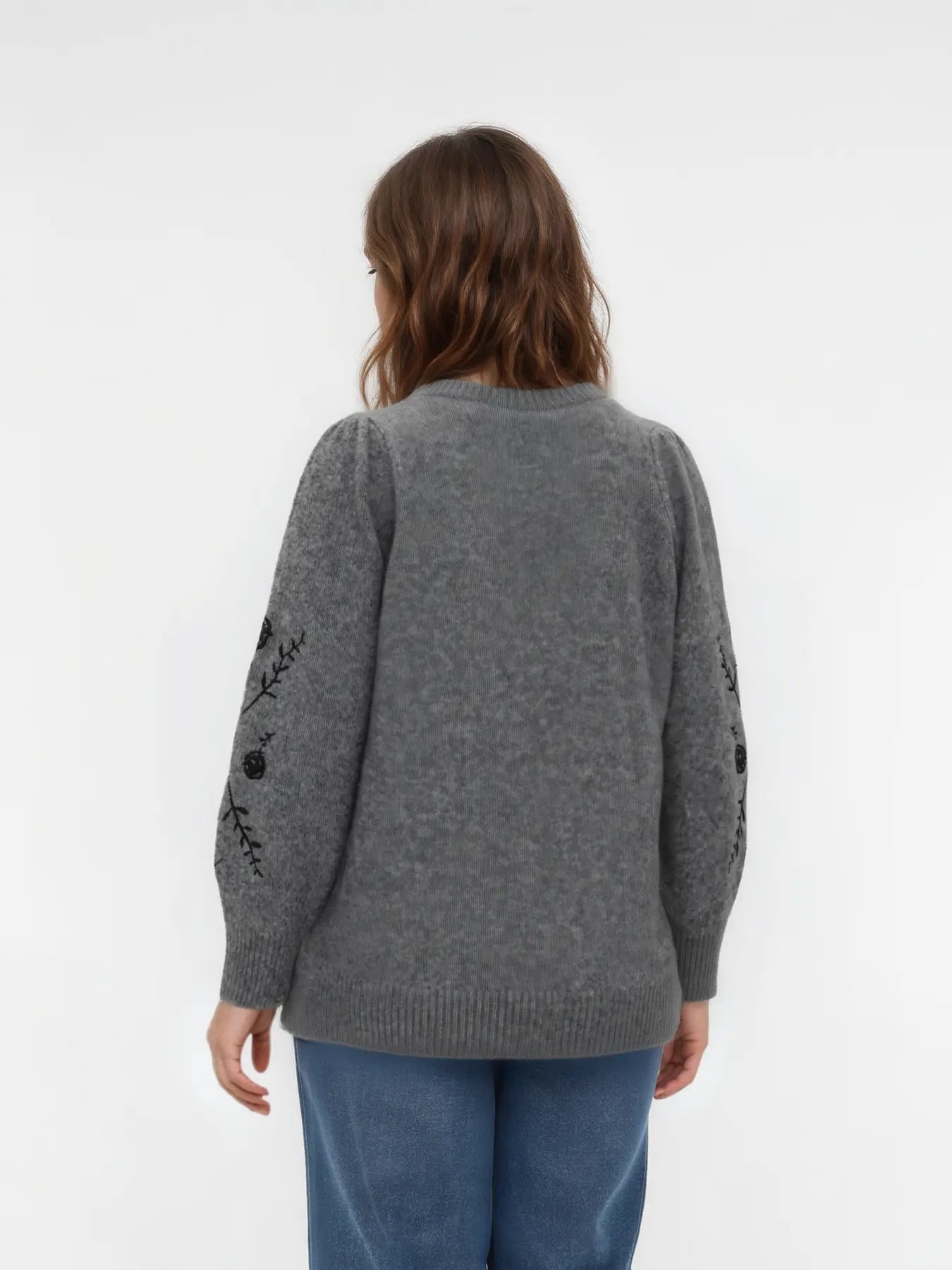 Grå strikbluse med sorte broderier og lille puf på ærmerne